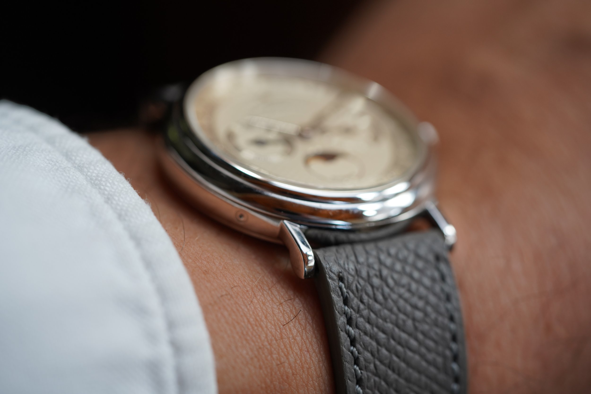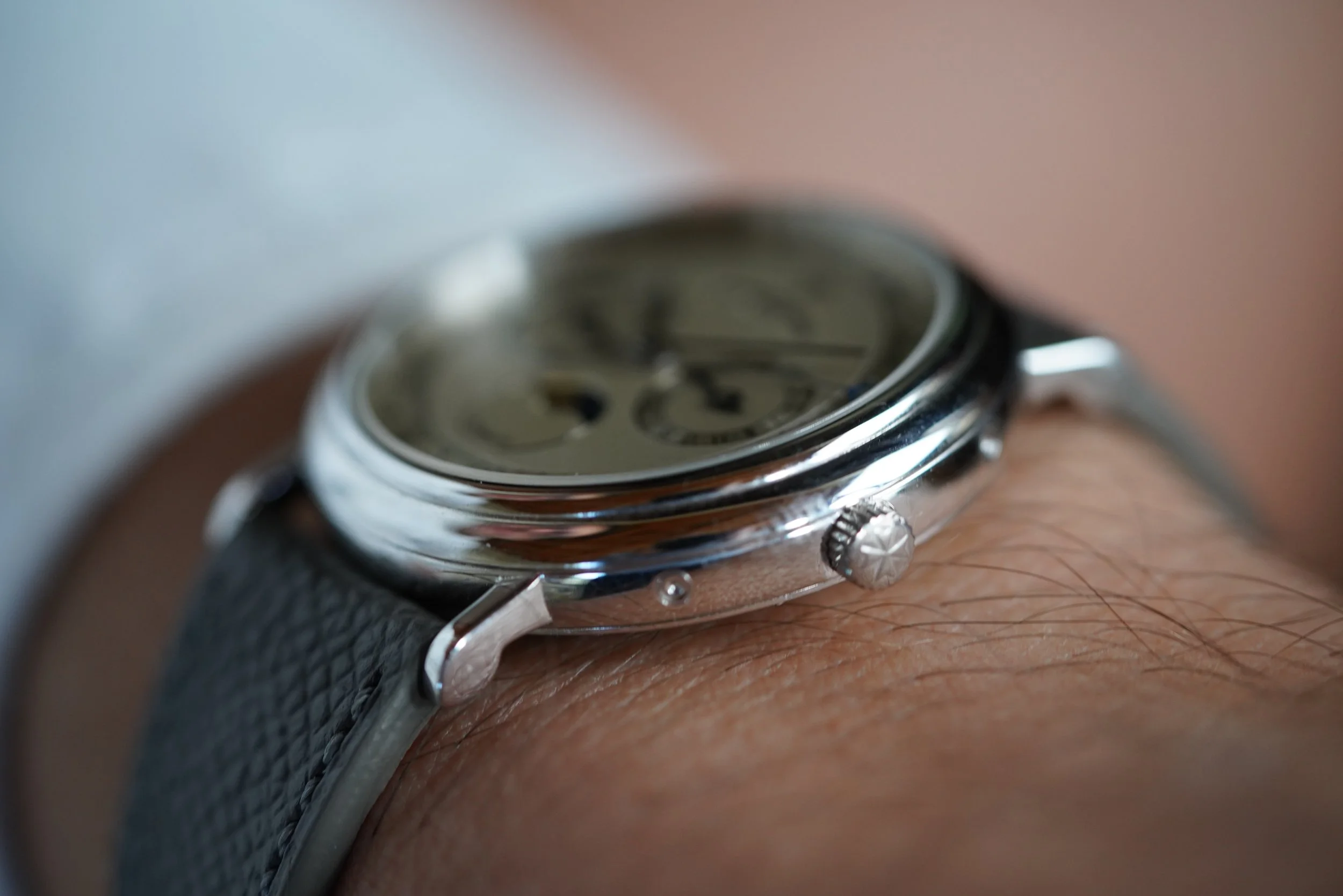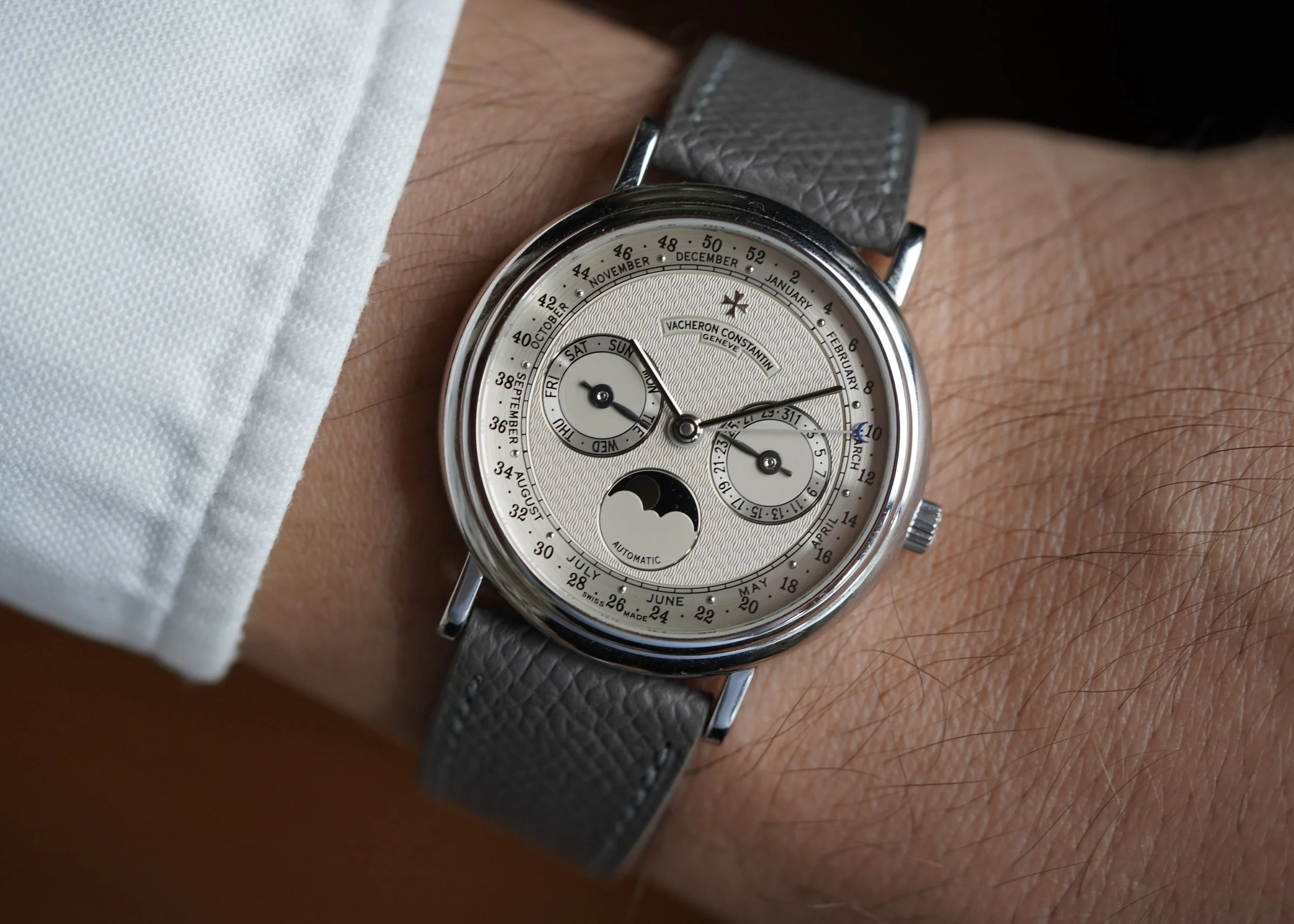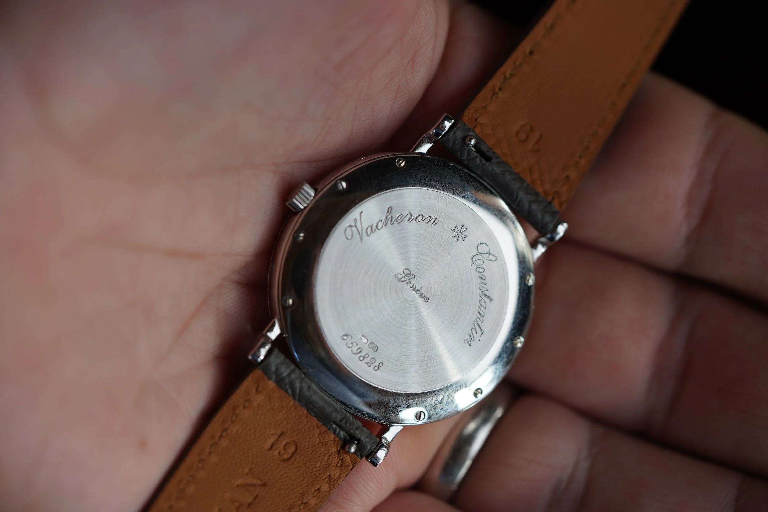This Vacheron Constantin Patrimony reference 47052 is an incredible timepiece. The case is made of 18K white gold. It measures 36mm in diameter. The case appears to be unpolished. The watch is powered by the triple calendar calibre 889. The watch dates to the 1990s. The dial on this watch is remarkable. It is one of the best dial designs of the era.