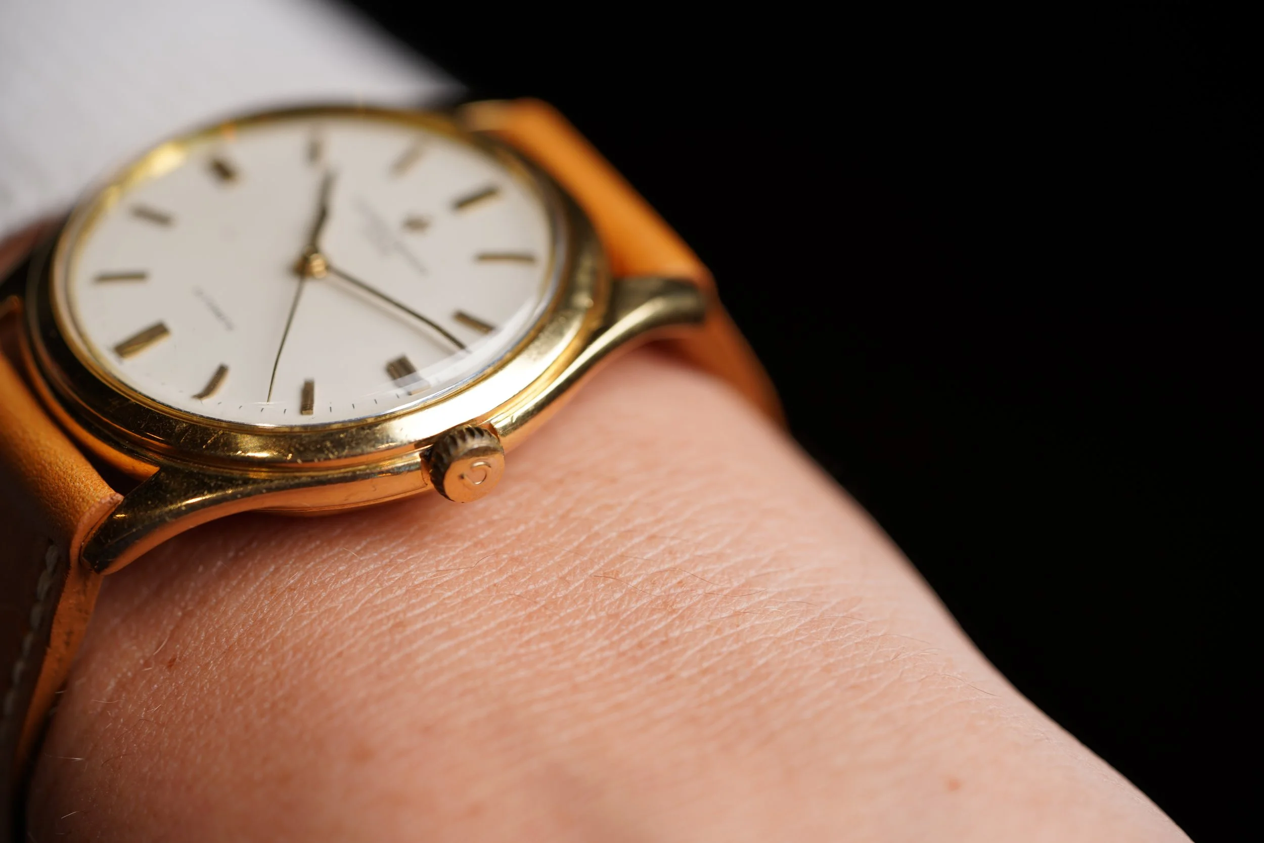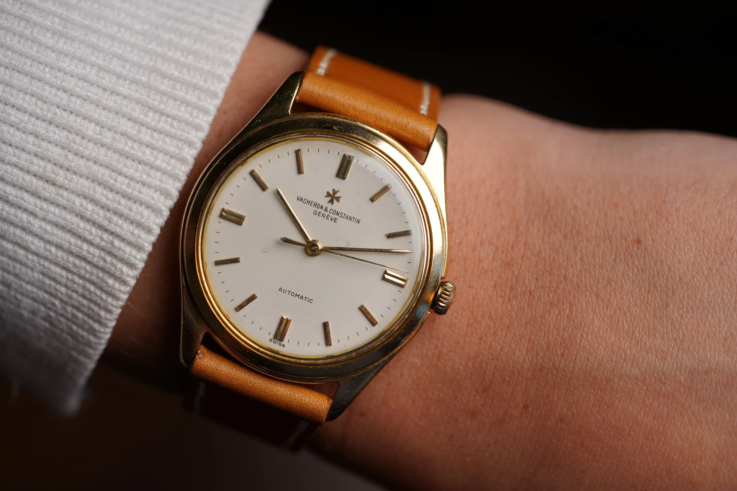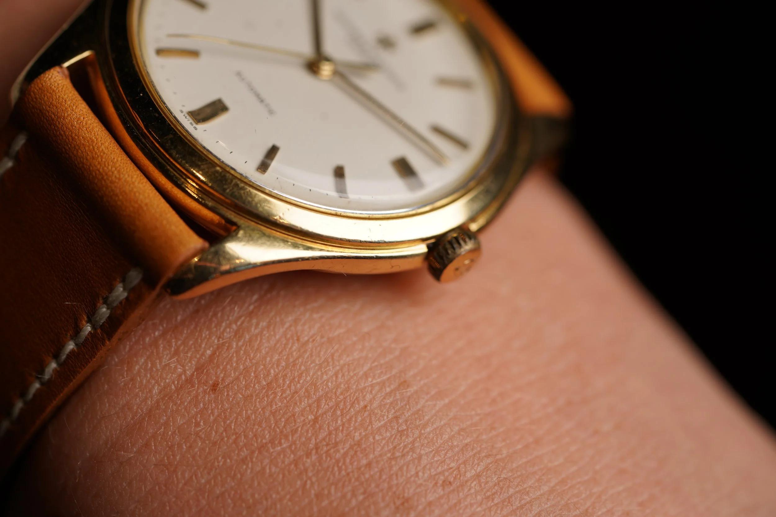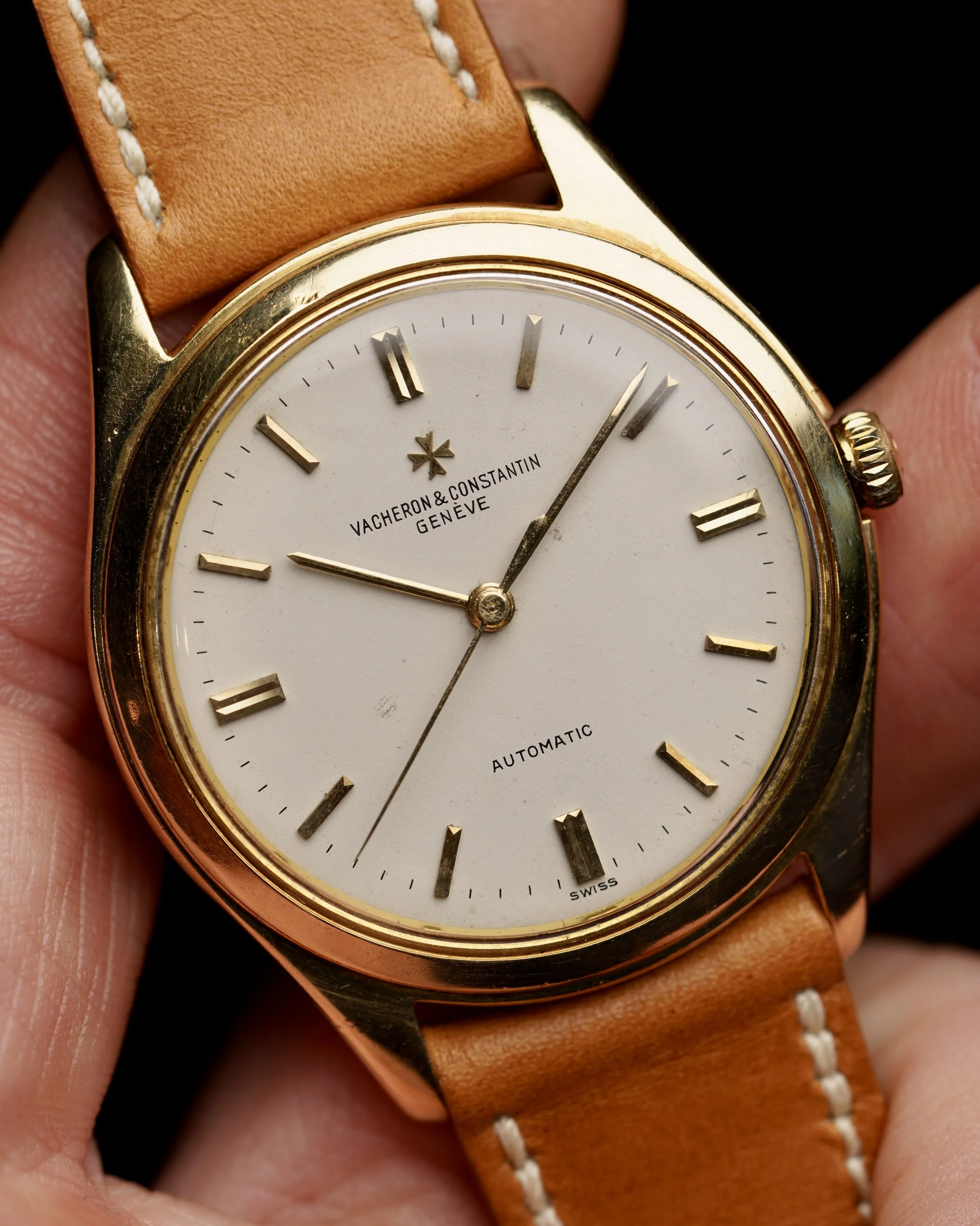 This Vacheron & Constantin reference 4870 is a very cool time-only automatic model from the 1960s. These are very cool watches with an Oyster-style case. The case back is screw down. The 18k gold case measures 36mm in diameter. The crown is a later replacement. It is powered by the automatic calibre P1019. The case appears to be unpolished.