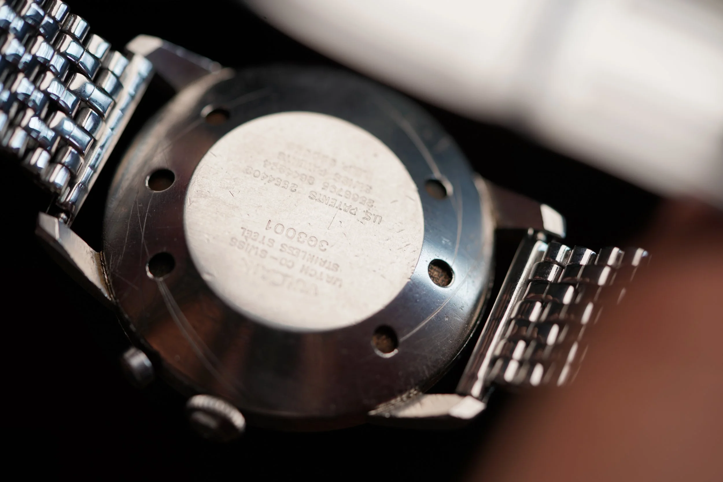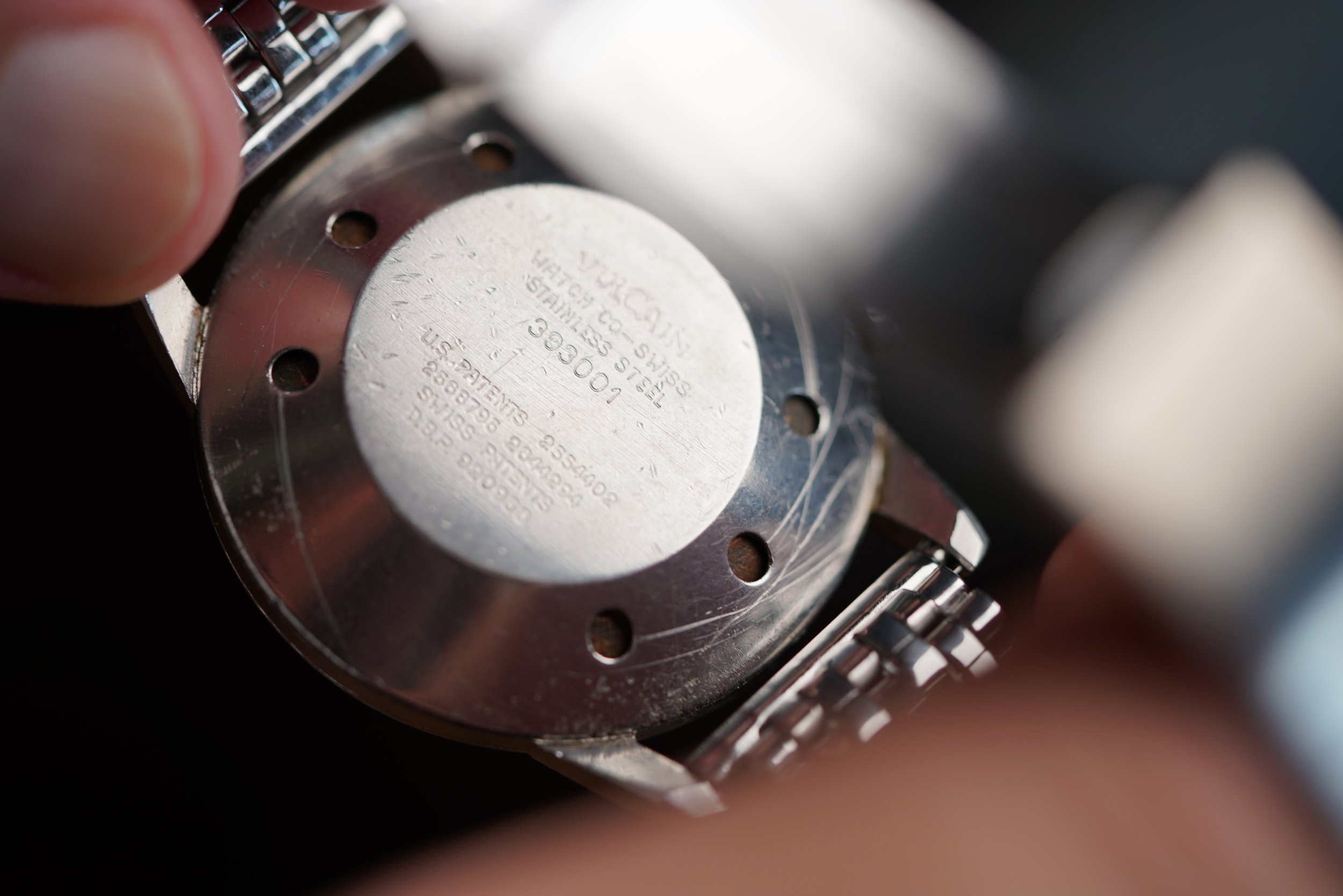 This Vulcain Cricket reference 303001 is among the early oversized Cricket models from the 1950s. Similar to the “King Cricket” model, the case dimensions are 38mm in diameter (47mm lug to lug) with a lug-width of 20mm. It is unpolished.