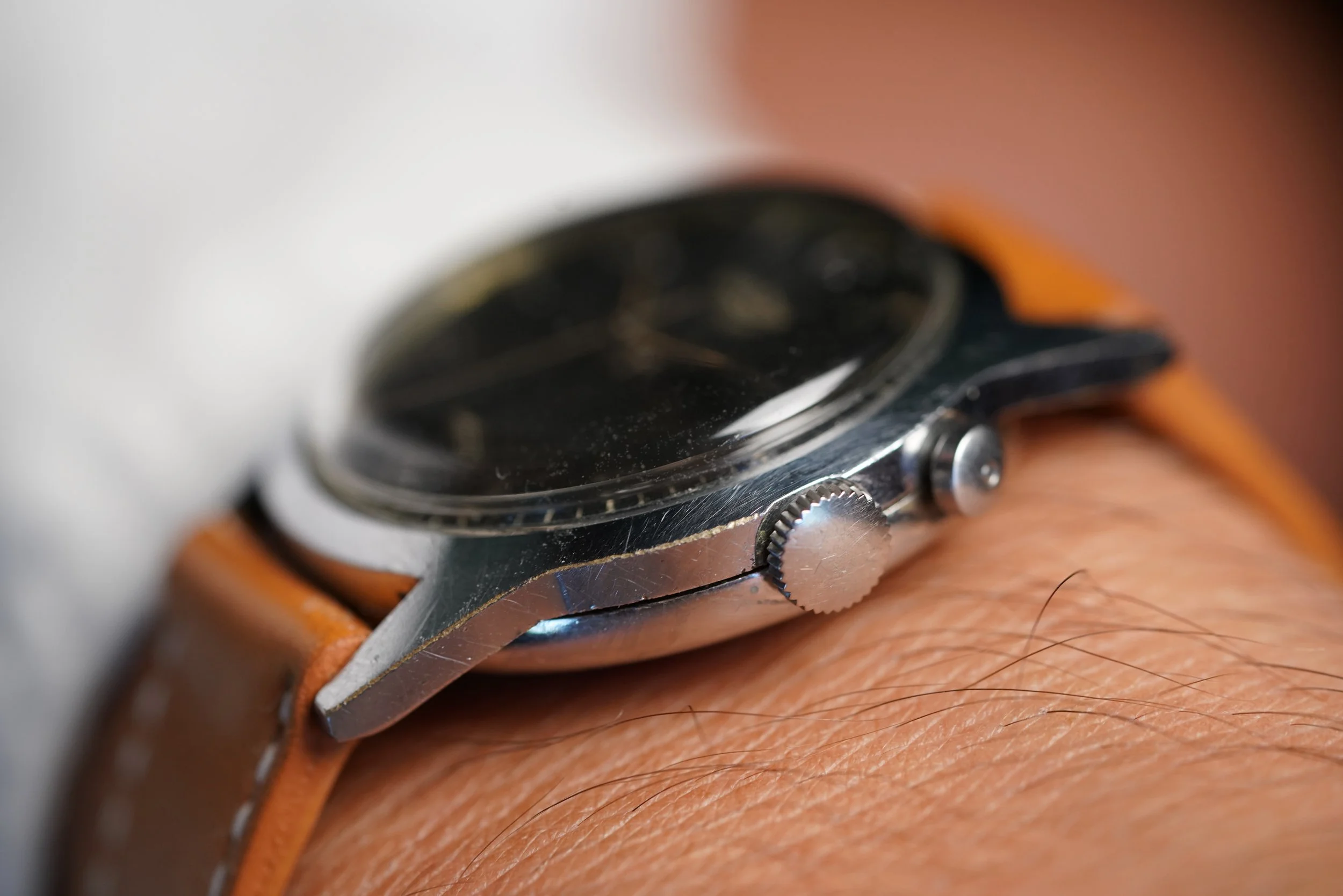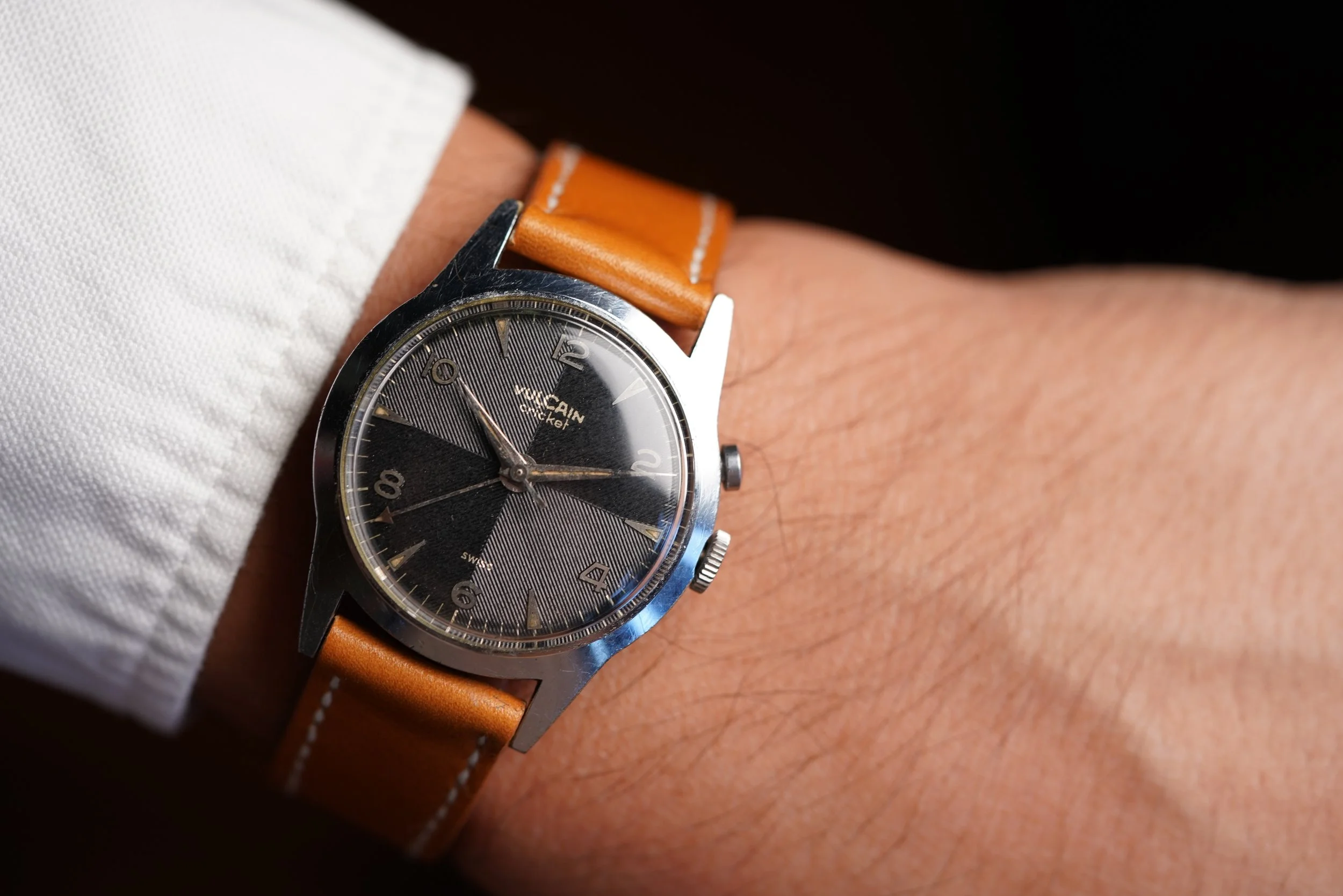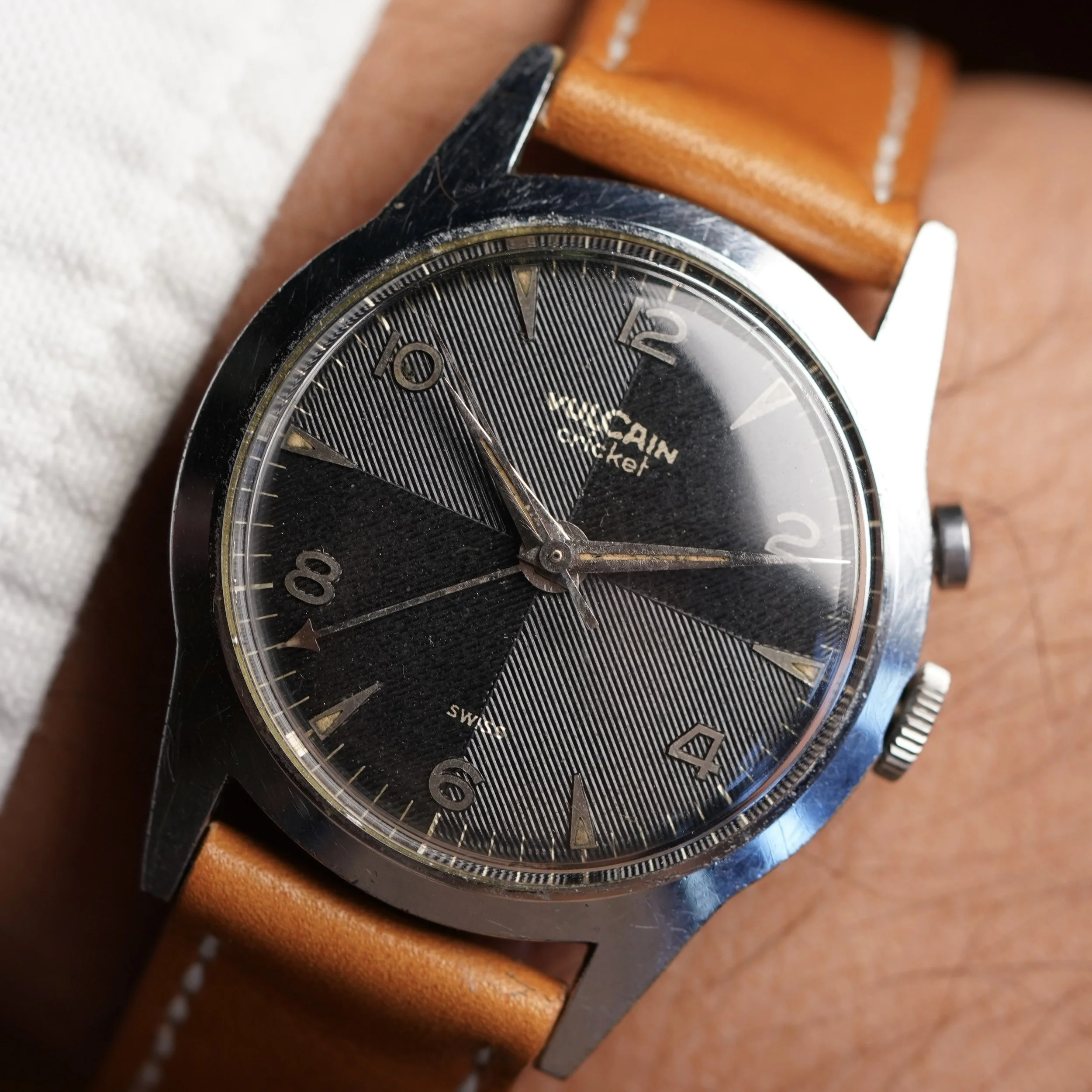 This is a rare Vulcain Cricket with black textured dial. It dates to the late 1950s and is one of the coolest models of the early Crickets. The watch is chrome plated and measures 34mm in diameter. The case appears to be unpolished.
