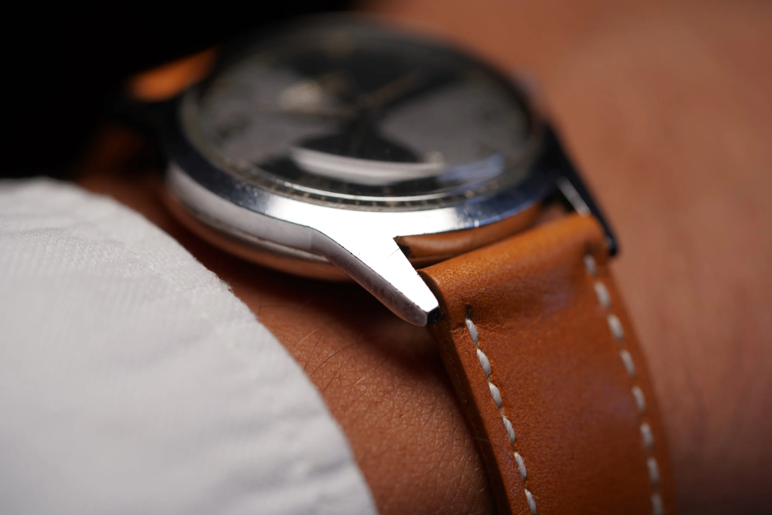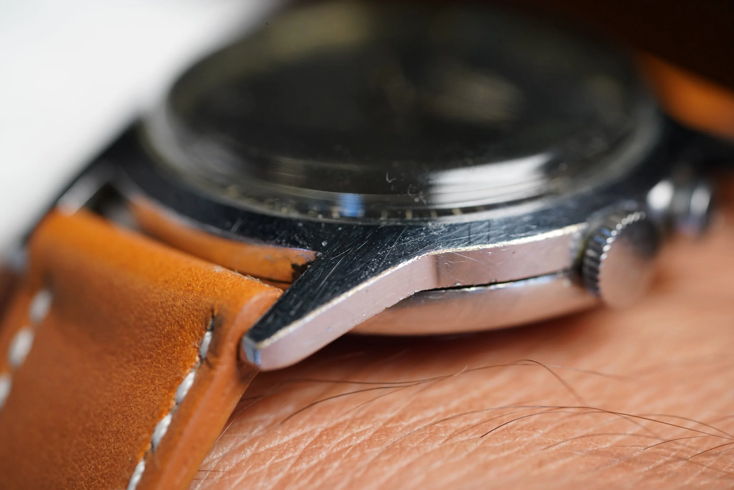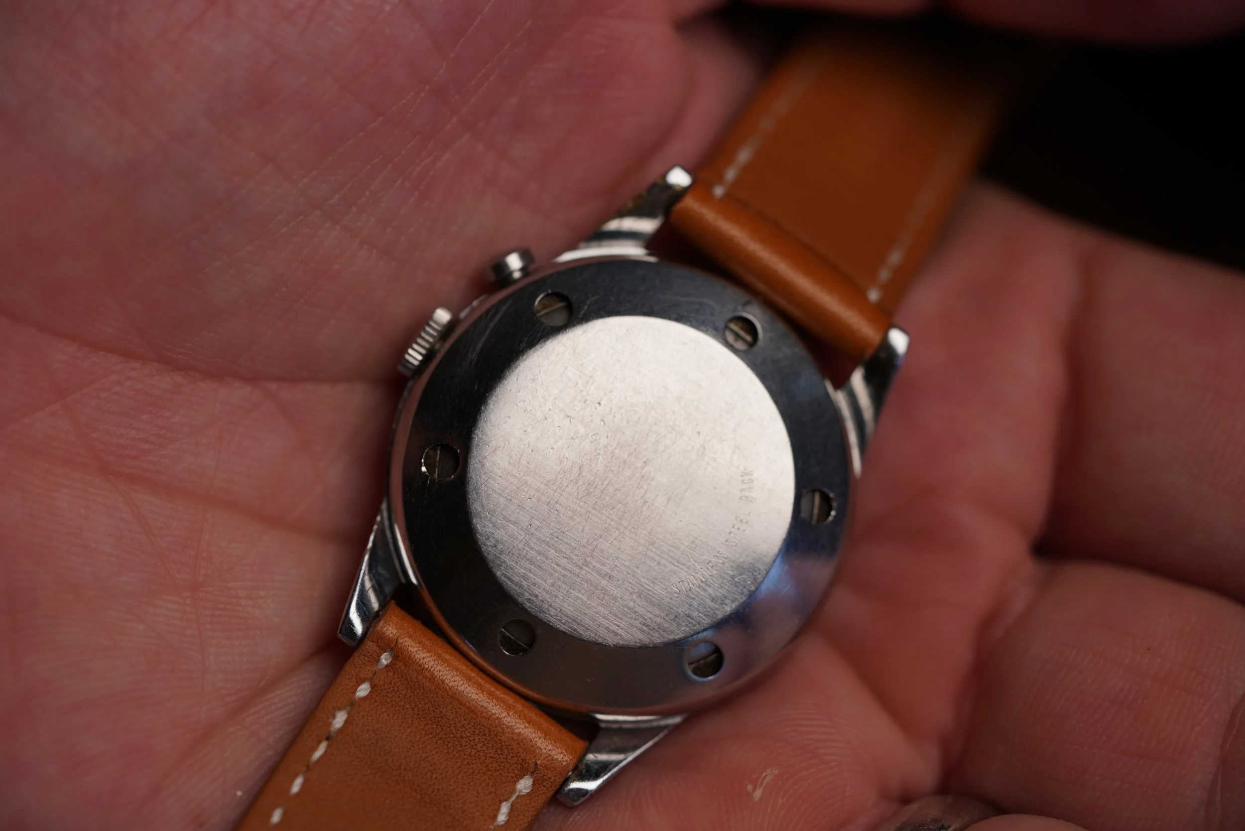 This is a rare Vulcain Cricket with black textured dial. It dates to the late 1950s and is one of the coolest models of the early Crickets. The watch is chrome plated and measures 34mm in diameter. The case appears to be unpolished.
