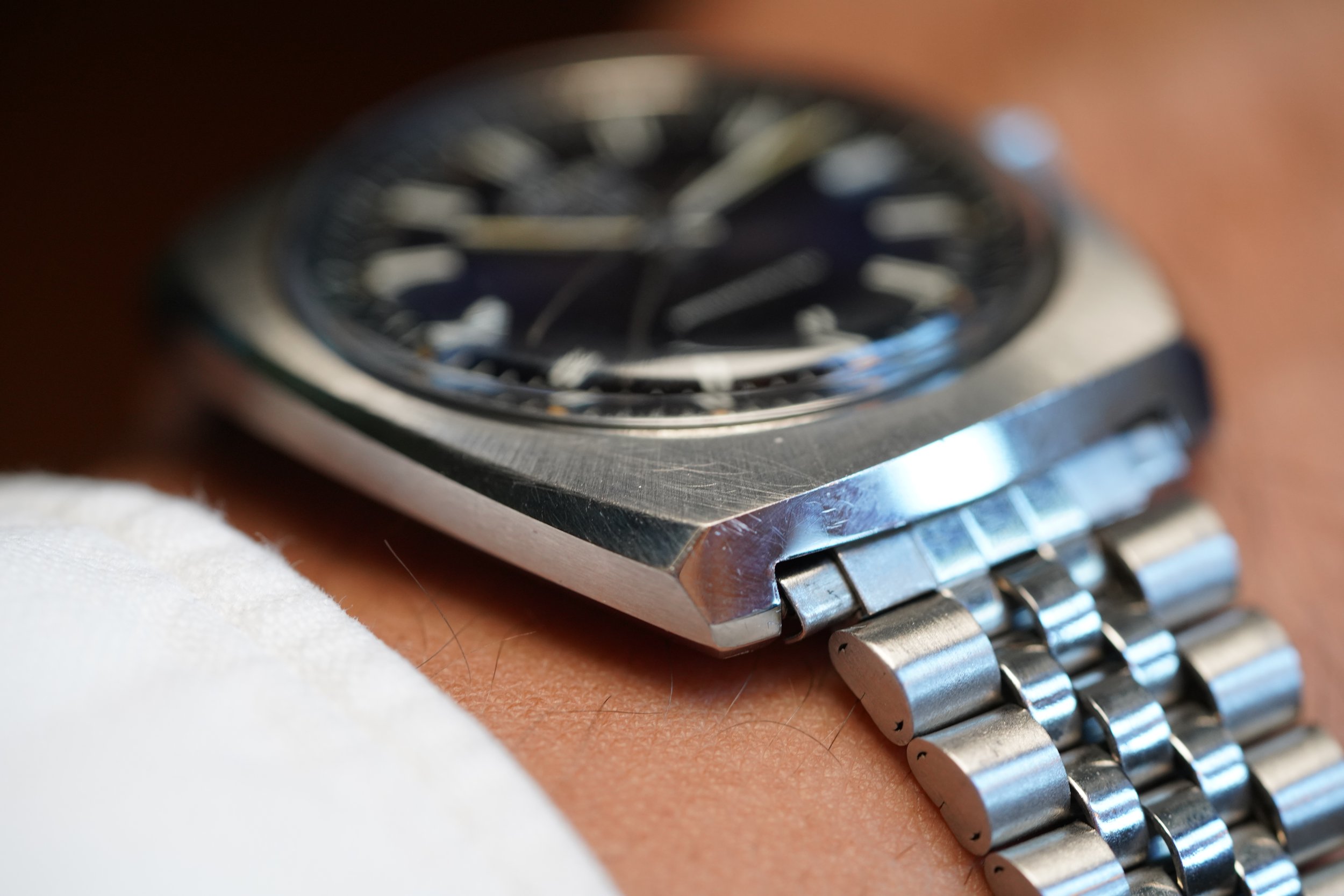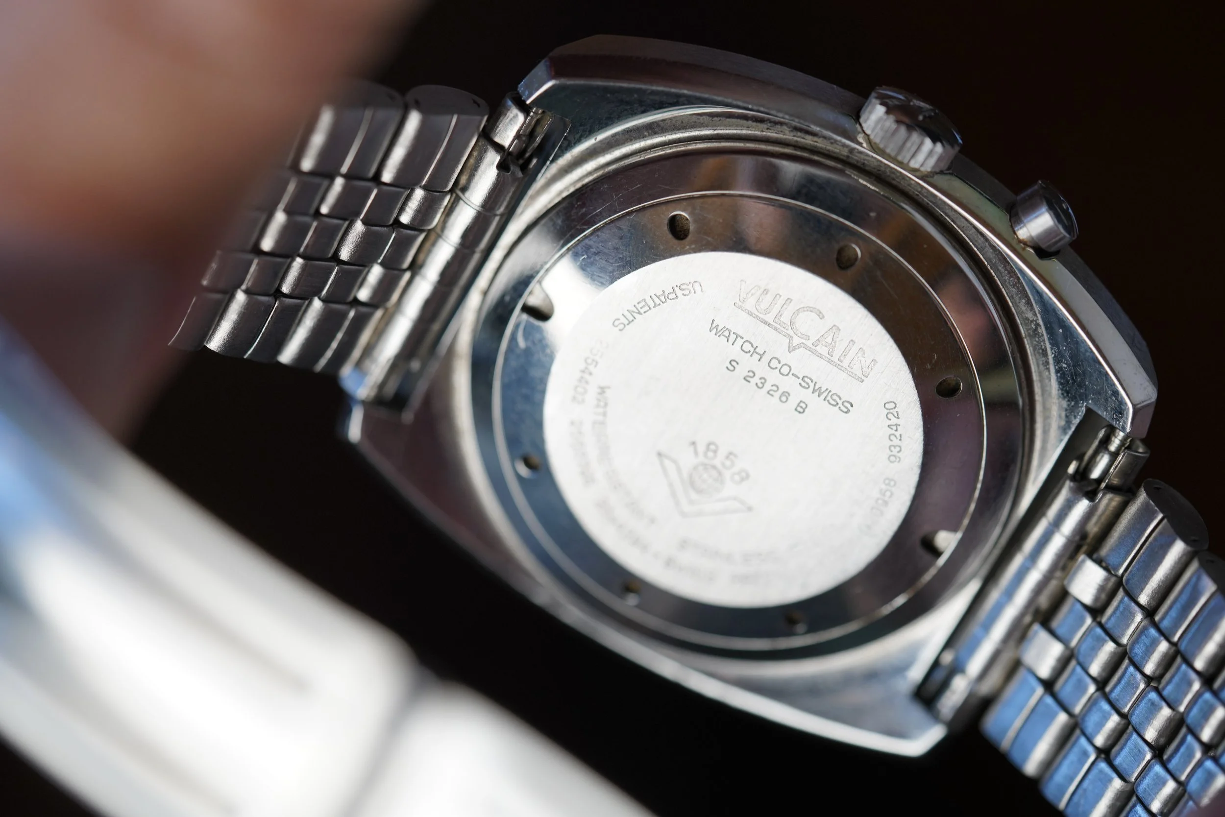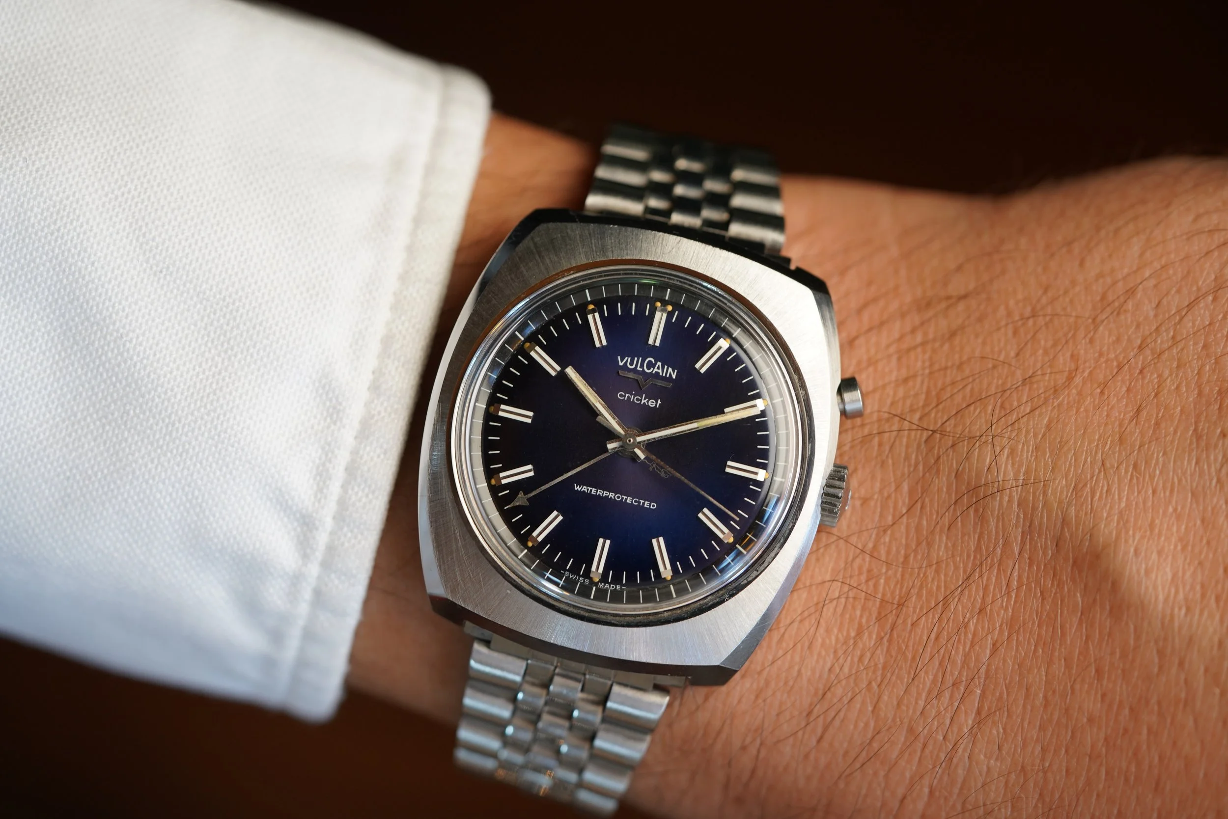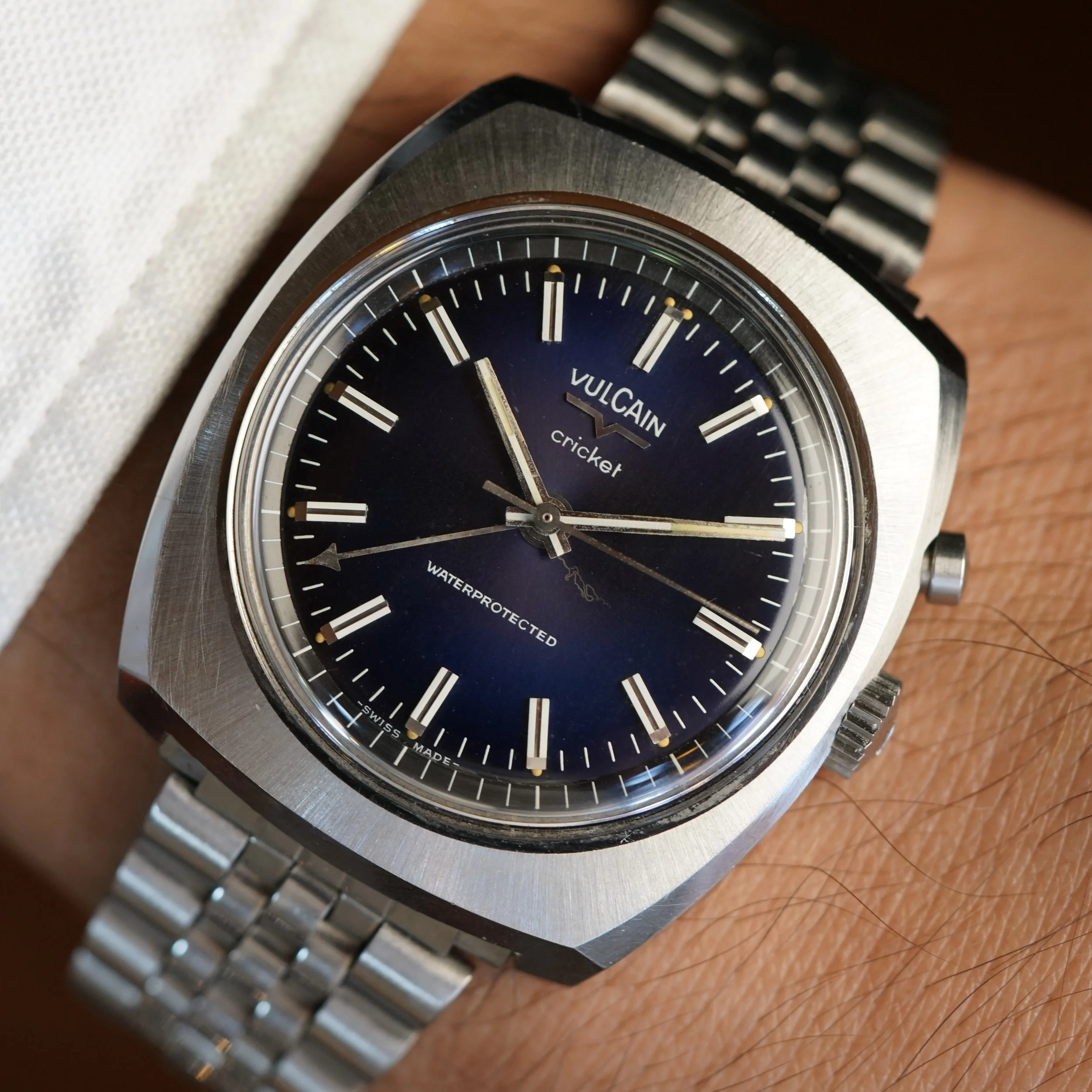 The 1960s and 1970s ushered in a fantastic new style for the Vulcain Cricket. Particularly in the bulkier case references such as the S2326B. The massive steel case measures 41mm lug-to-lug, with a diameter of 38mm (excluding the crown). The case is unpolished. The dial features a beautiful variant in blue fume.