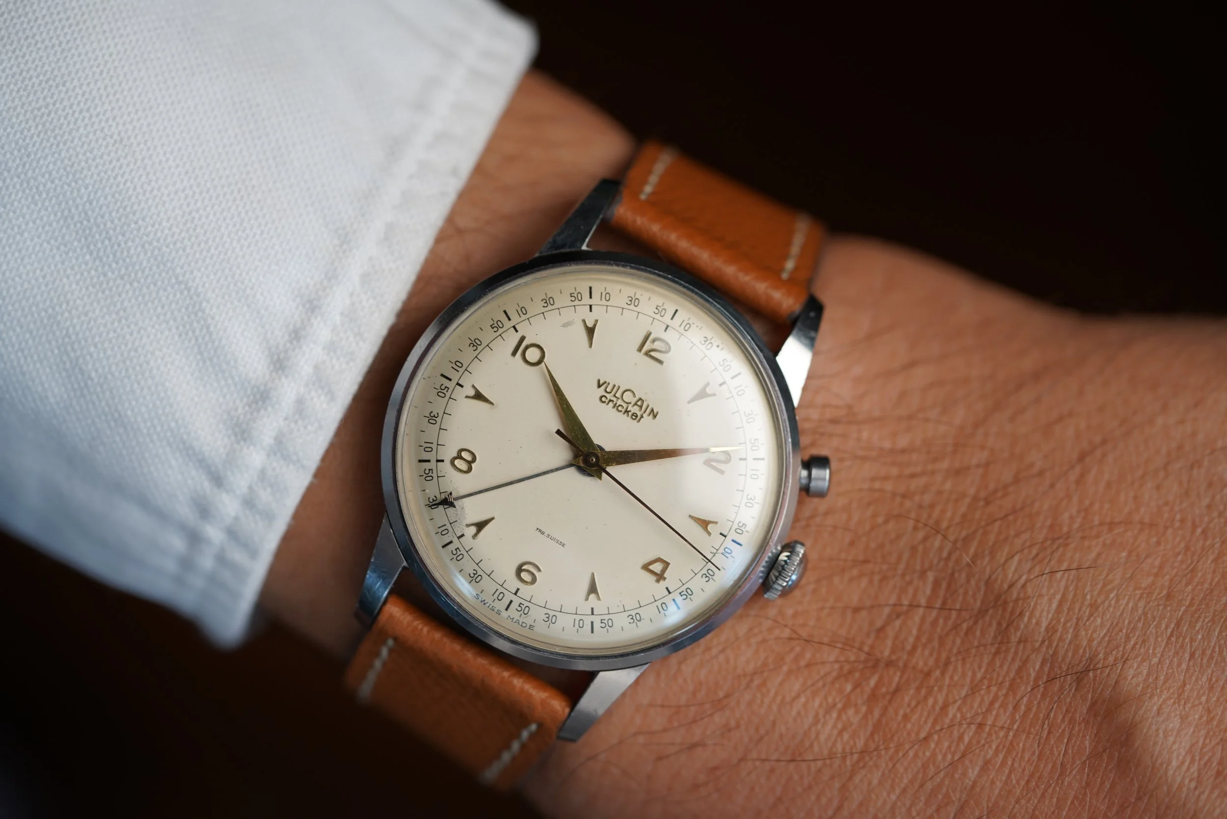 This Vulcain Cricket reference 303001 is among the early oversized Cricket models from the 1950s. Similar to the “King Cricket” model, the case dimensions are 38mm in diameter (47mm lug to lug) with a lug-width of 19mm. These oversized or “Jumbo” Vulcain Crickets are some of the most interesting and wearable vintage Cricket models, but their interest should be far wider than that. Collectors of oversized vintage time-only and chronograph models, such as vintage Longines, Breitling or Universal Genève collectors, often have not had the chance to see one of these rare models in person, but when they do, it is not unusual to hear an audible gasp or at least eyes widening when they try it on their wrist.
