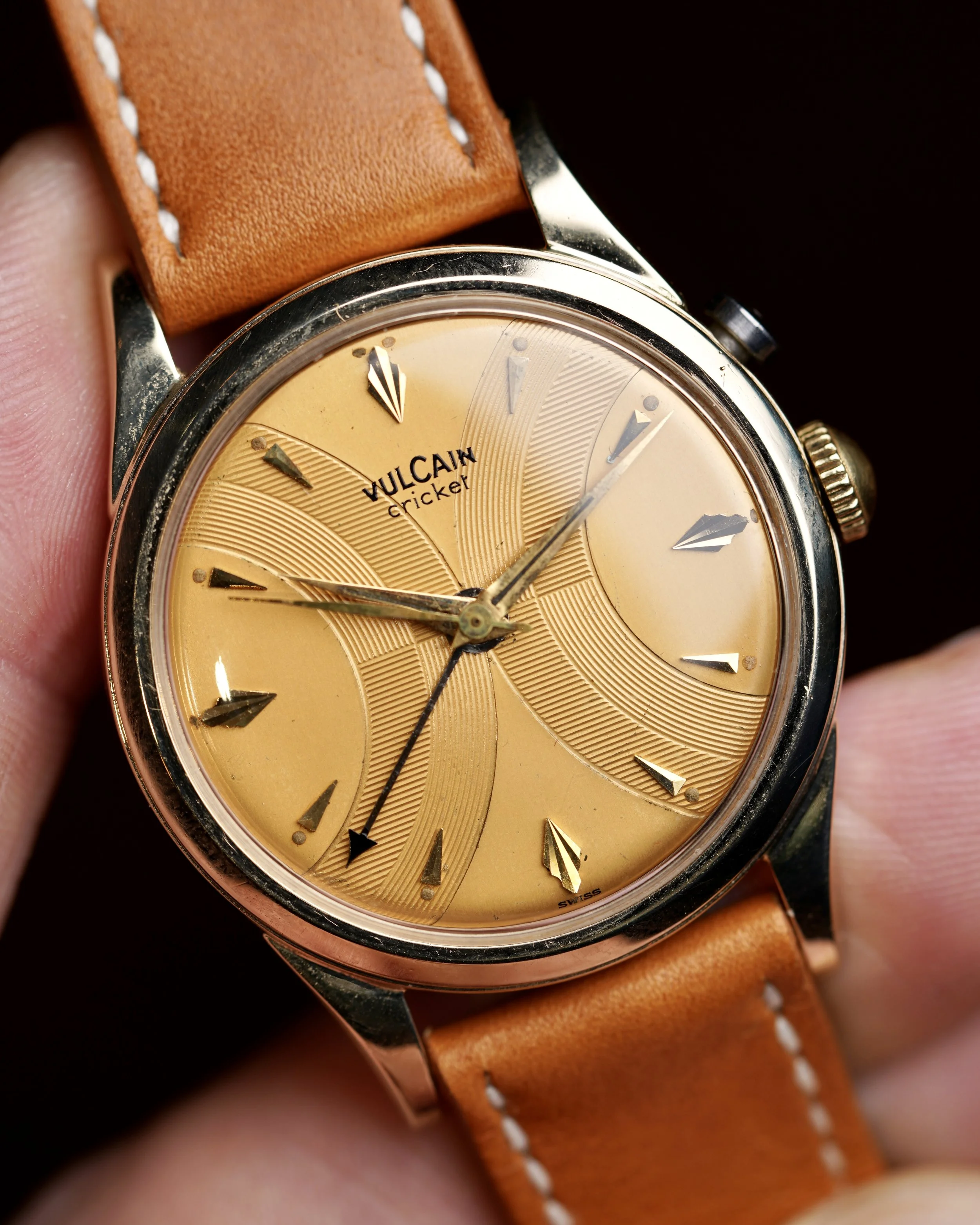 This Vulcain Cricket features an incredibly rare dial and is one of the most beautiful and interesting Cricket dials we have ever seen! We’ve pretty much seen them all, but this was a surprise! There are semicircular Guilloché designs carved into the dial, along with leaf life or folded arrowhead indices at 3, 6, 9, and 12 o’clock. The watch features original dauphine hands with luminous stripes. The case appears to be unpolished and is gold plated.
