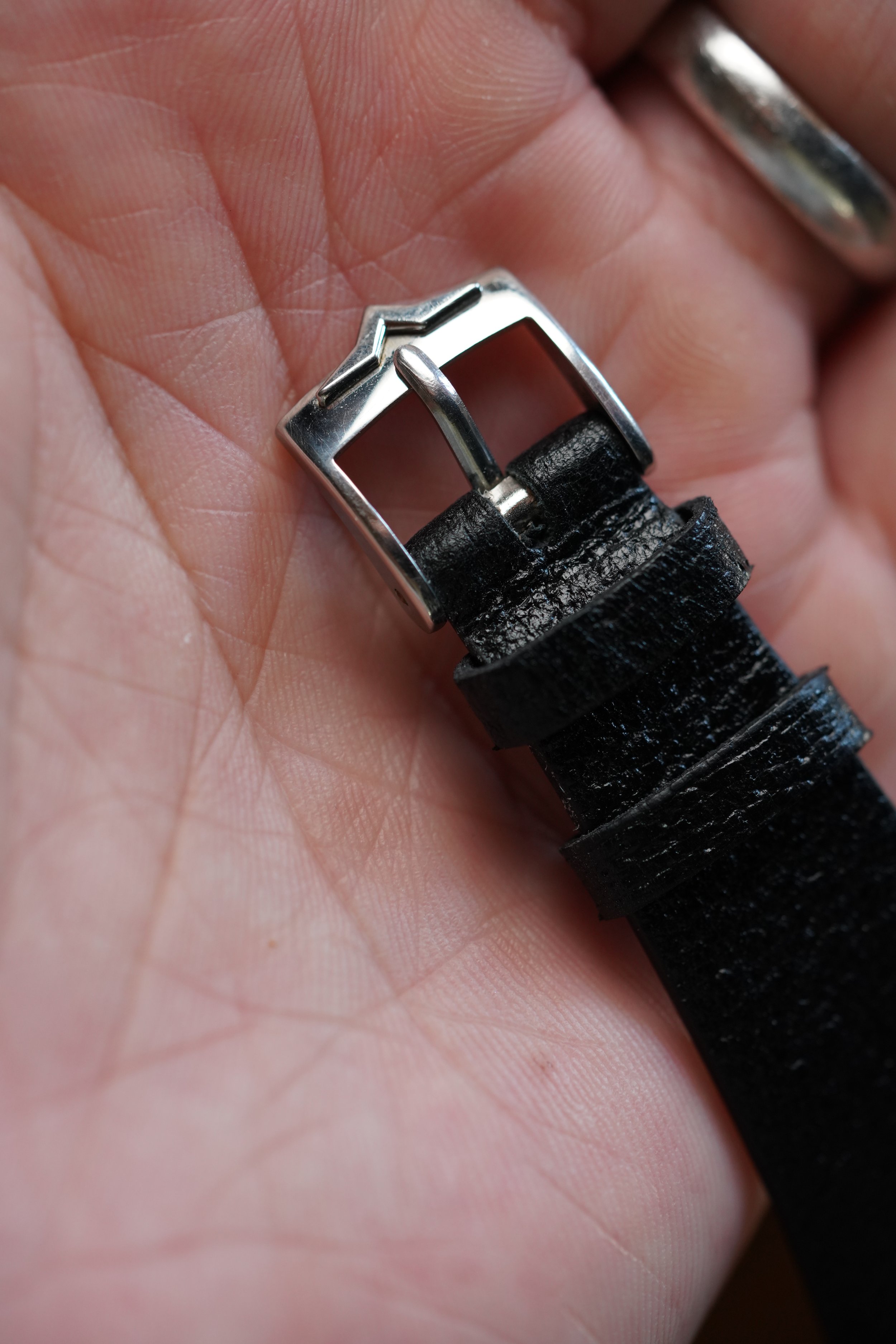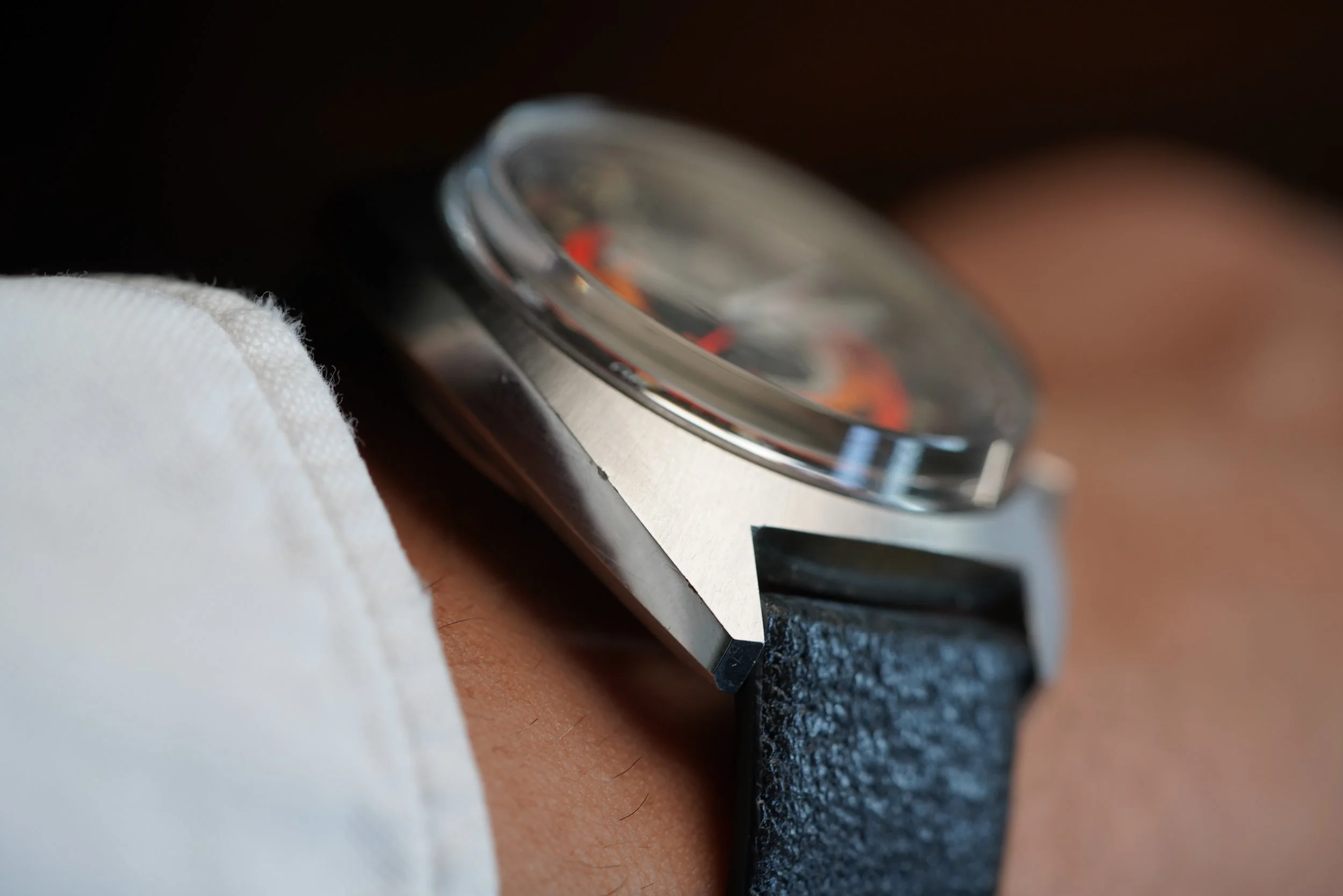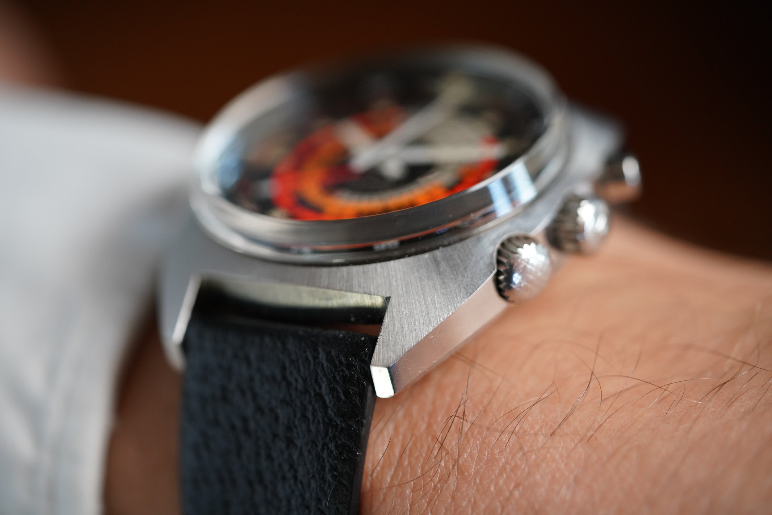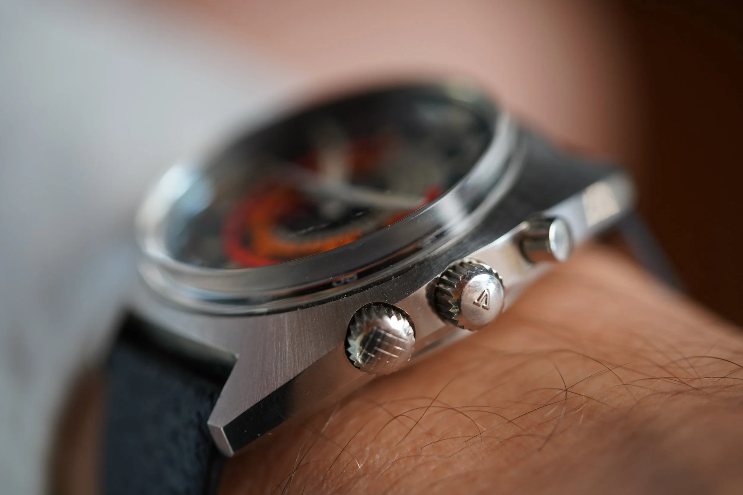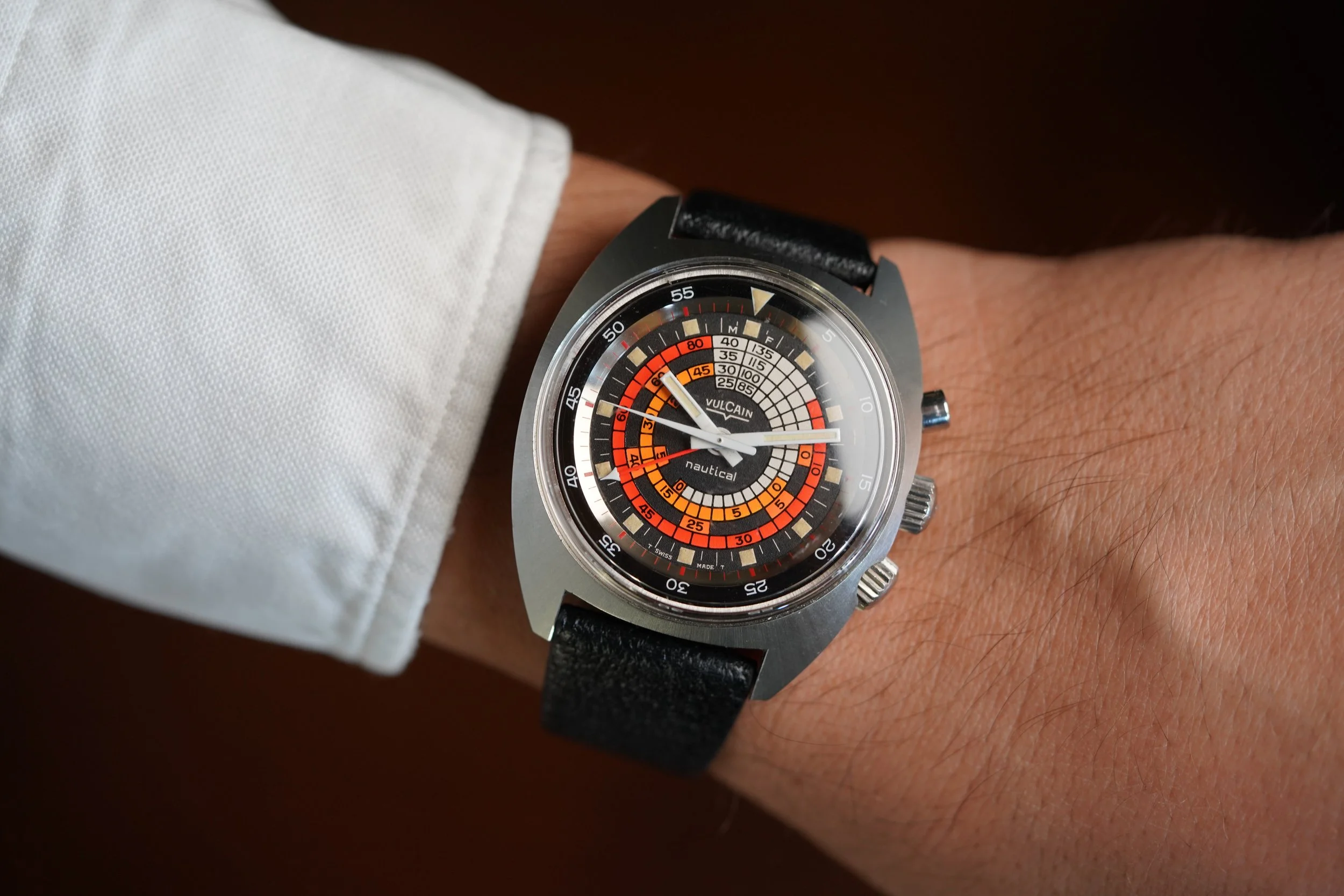 This is a special and funky Vulcain Cricket Nautical originally made for divers. The watch is in outstanding condition. The case is unpolished. The strap and buckle are original to the watch which is super rare. The watch dates to the 1970s. The stainless steel case measures approximately 42mm in diameter and 50mm lug-to-lug. It features a colorful black, red, orange, and white luminous dial with an inner rotating bezel. For those looking for an incredible retro dive watch, this is one of the coolest options.