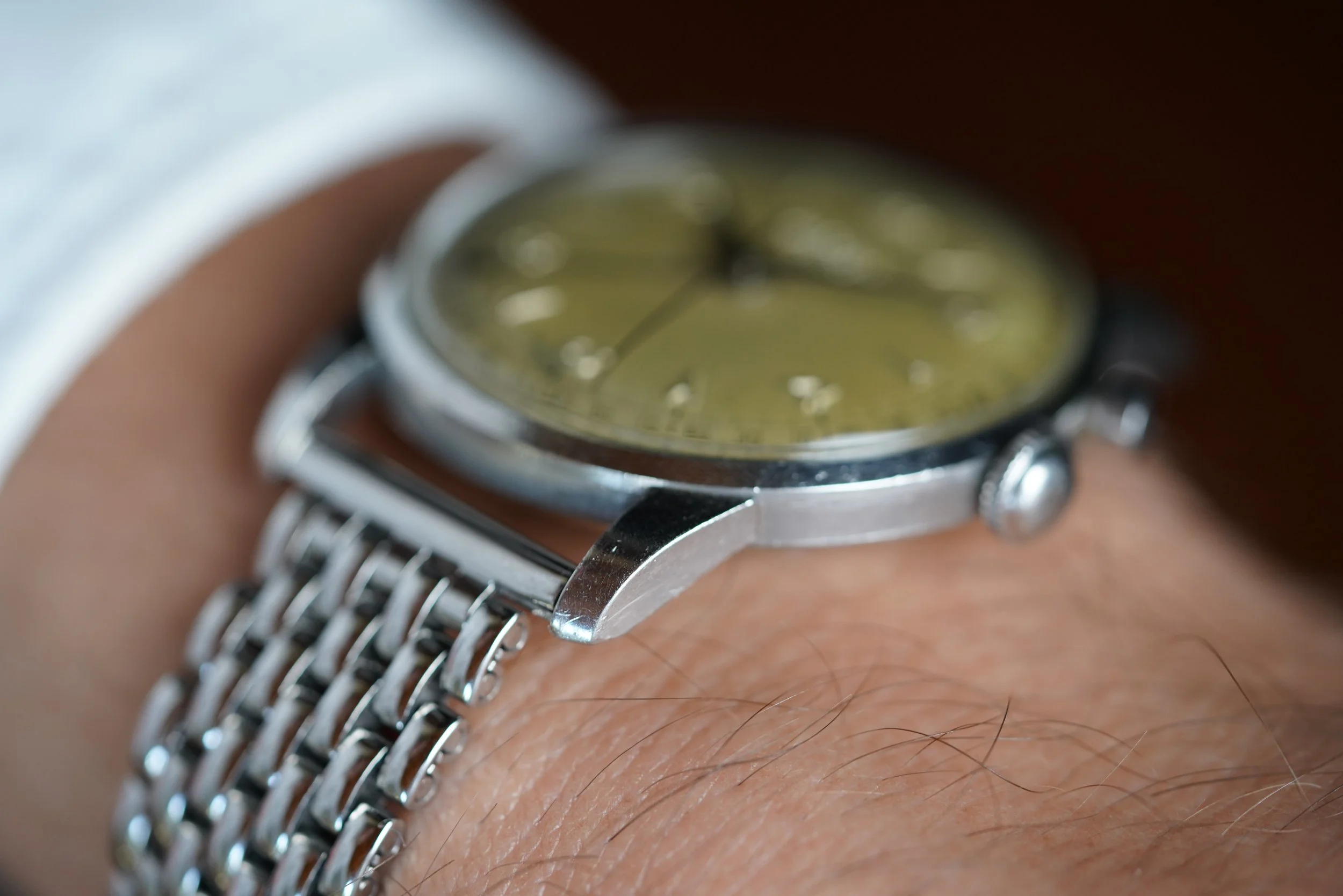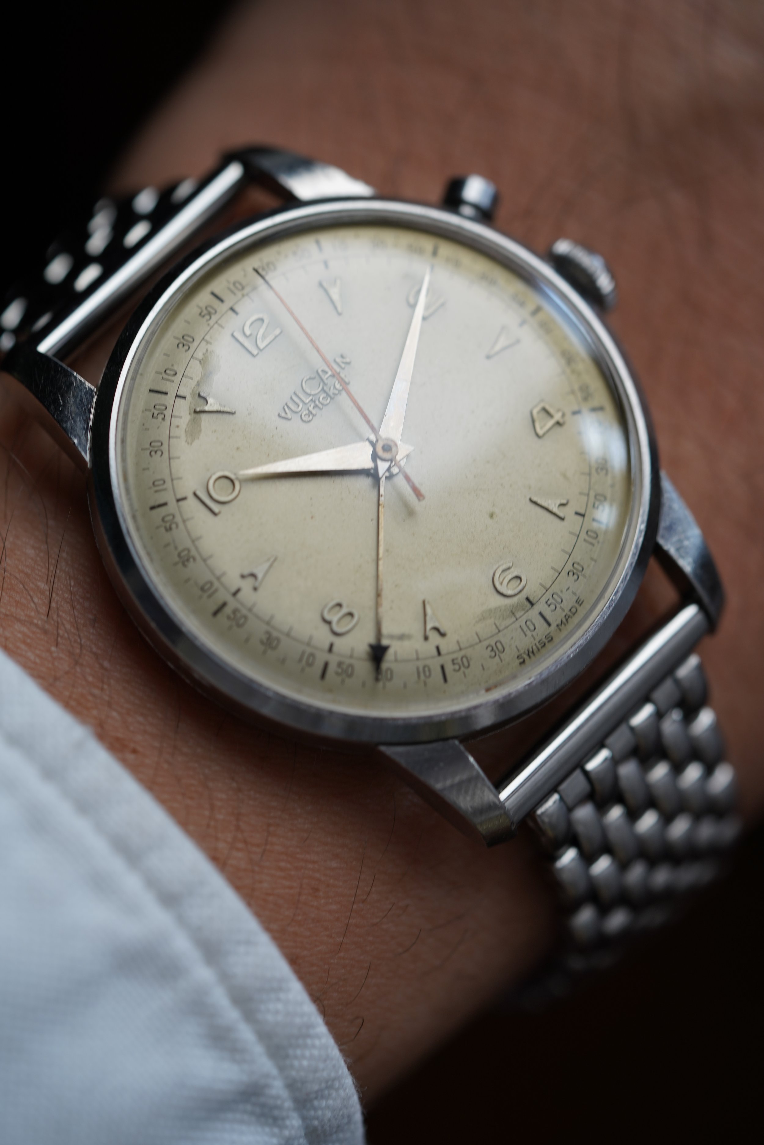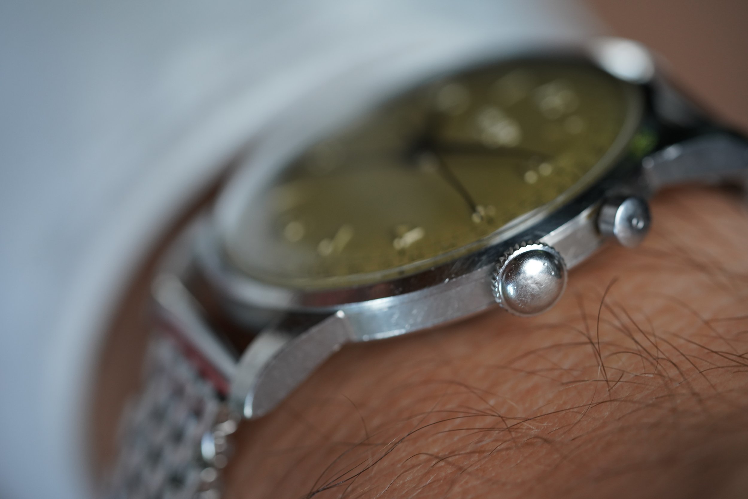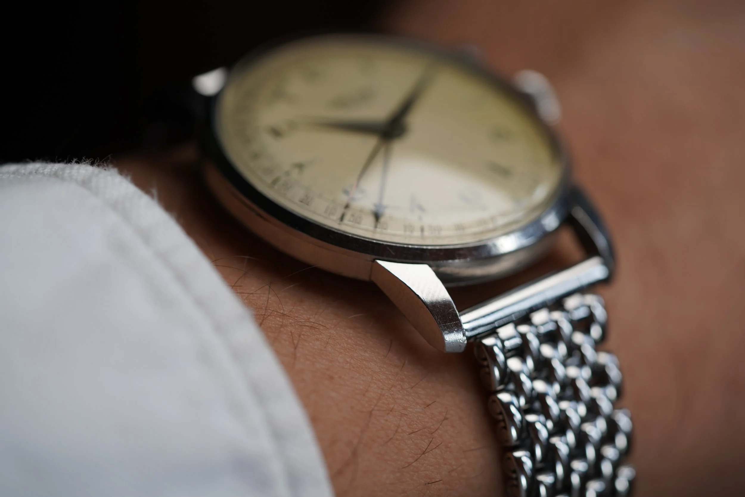 This Vulcain Cricket reference 303001 is among the early oversized Cricket models from the 1950s. Similar to the “King Cricket” model, the case dimensions are 38mm in diameter (47mm lug to lug) with a lug-width of 19mm. These oversized or “Jumbo” Vulcain Crickets are some of the most interesting and wearable vintage Cricket models, but their interest should be far wider than that. Collectors of oversized vintage time-only and chronograph models, such as vintage Longines, Breitling or Universal Genève collectors, often have not had the chance to see one of these rare models in person, but when they do, it is not unusual to hear an audible gasp or at least eyes widening when they try it on their wrist.