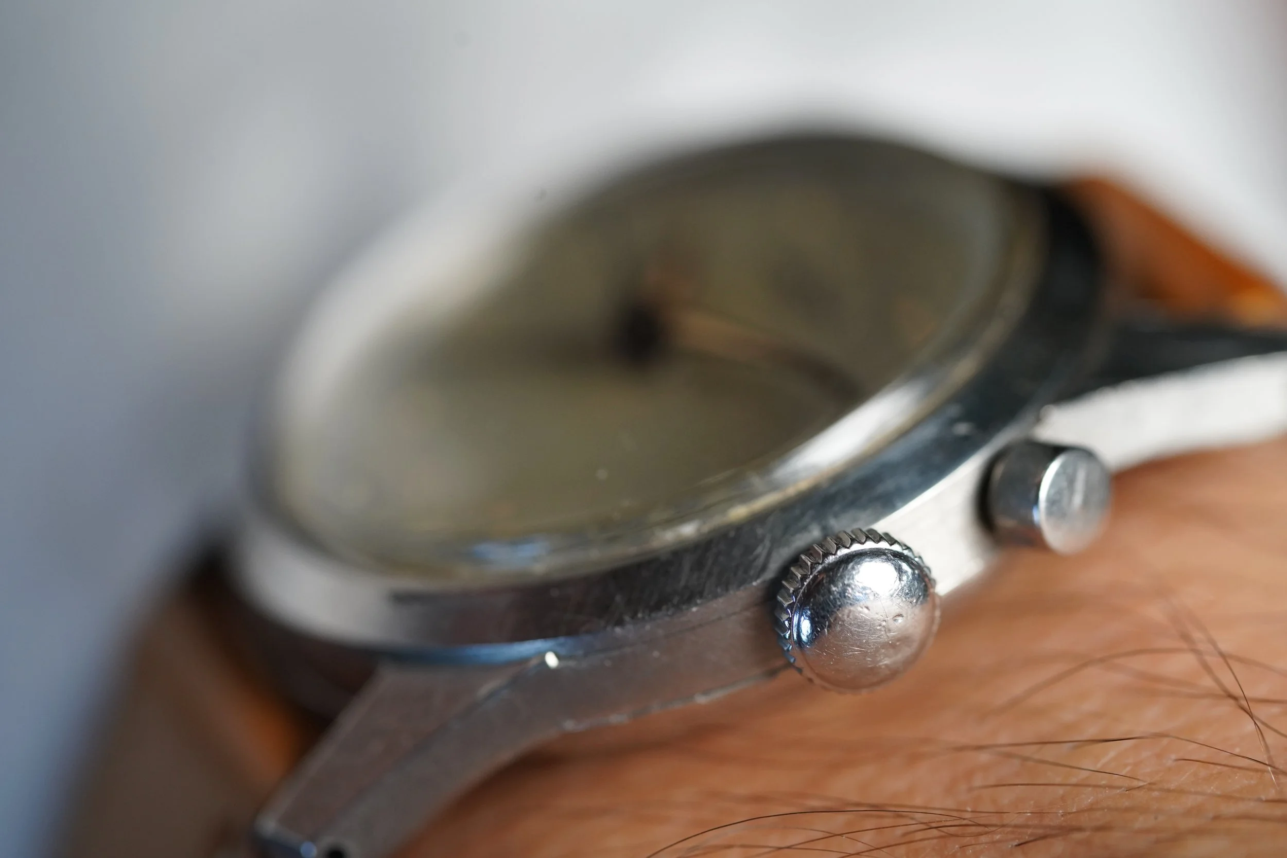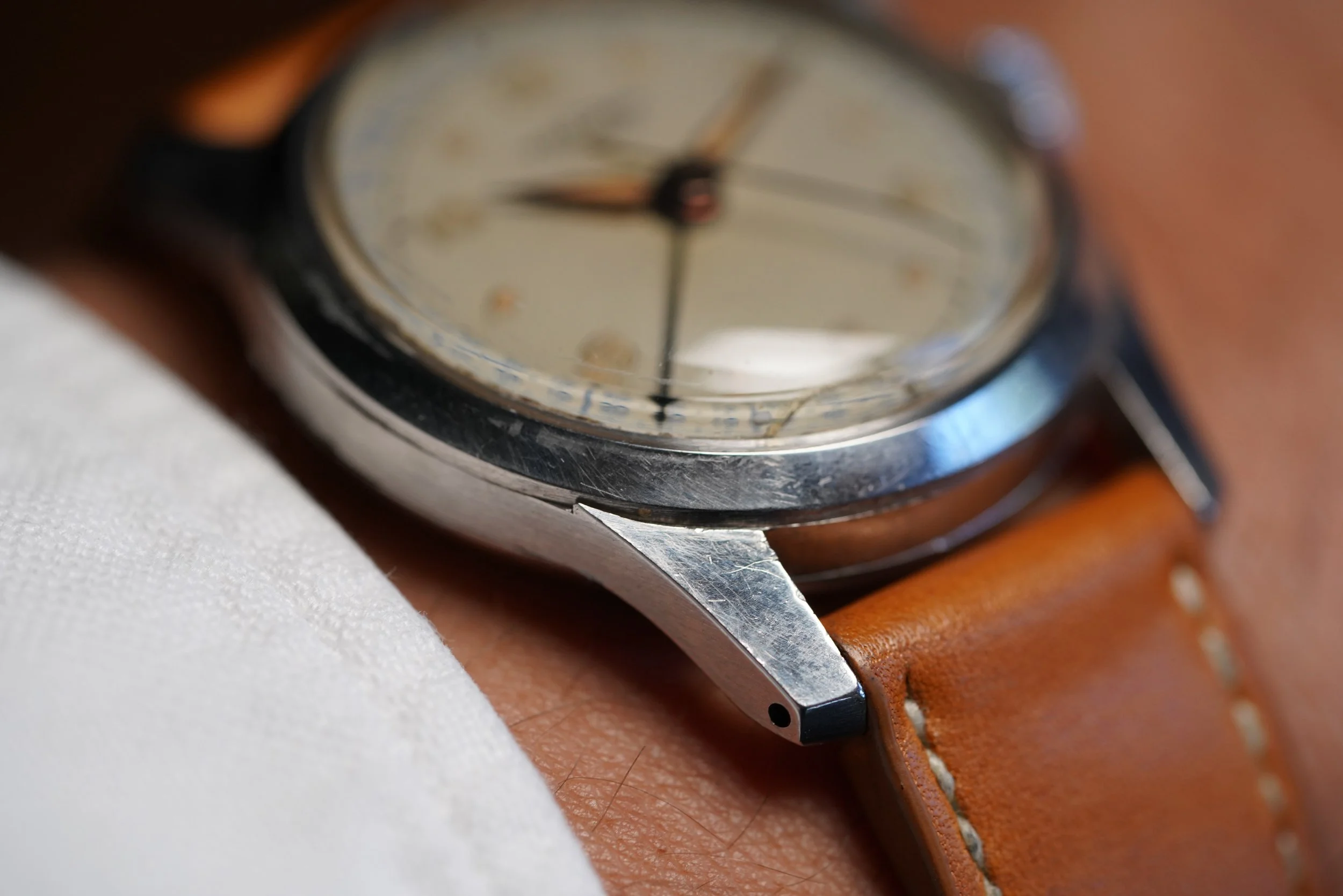 This Vulcain Cricket is among the earliest styles produced just over 100 years after the La-Chaux-de-Fonds manufacturer’s inception. Like the “LBJ” dial Crickets, it features the original or “OG” style case. It measures 34mm in diameter (just under 43mm lug-to-lug). The steel case features drilled lugs and is paired with an 18mm “honey” Wind strap.