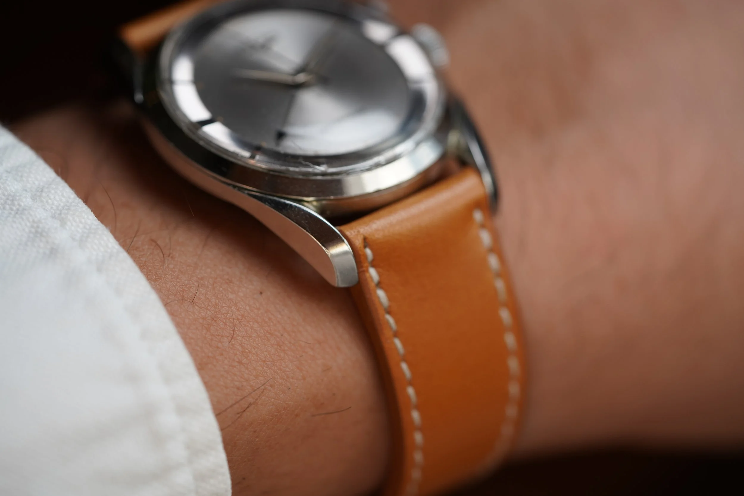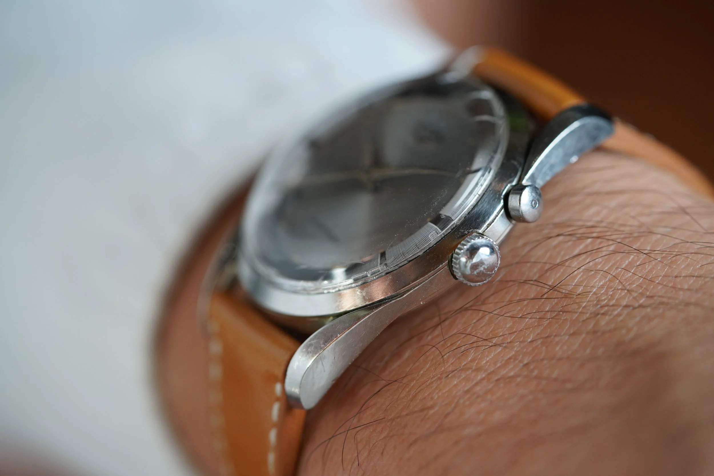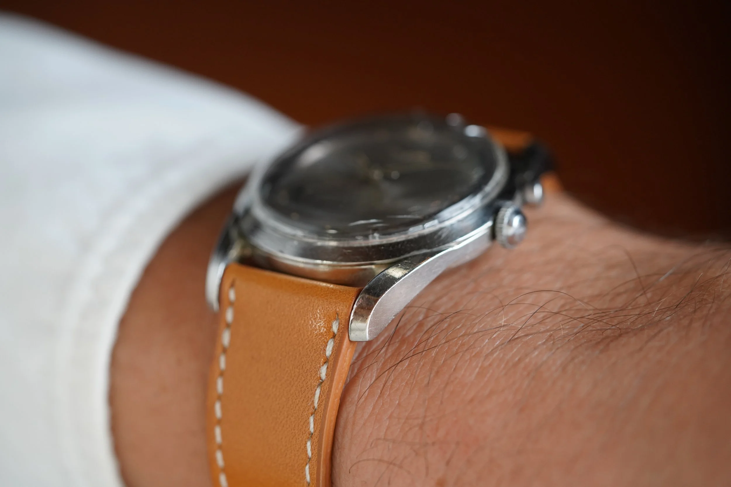 This Vulcain Cricket reference 303009 is an amazing timepiece that is 36mm in diameter by 46mm lug to lug. It features the twisted lugs found in the OMEGA Speedmaster and a dial variant that is found in Universal Genève Polerouter models. The watch was likely designed by Gerald Genta and is one of the most attractive Cricket watches. There are three Cricket references with these Polerouter dials. Each are very rare. The watch dates to the early to circa 1960. It is an uncommon model with only a couple known examples. This watch has been in Eric’s collection for a number of years.