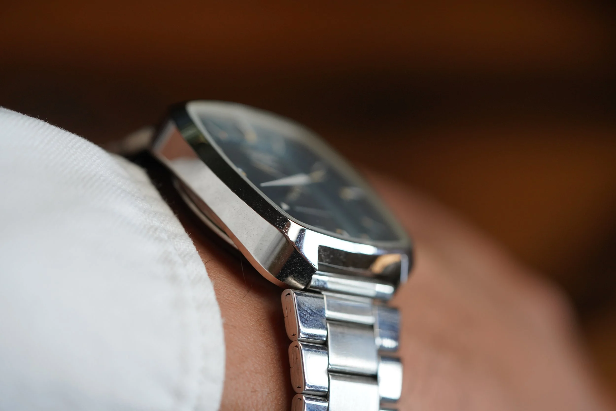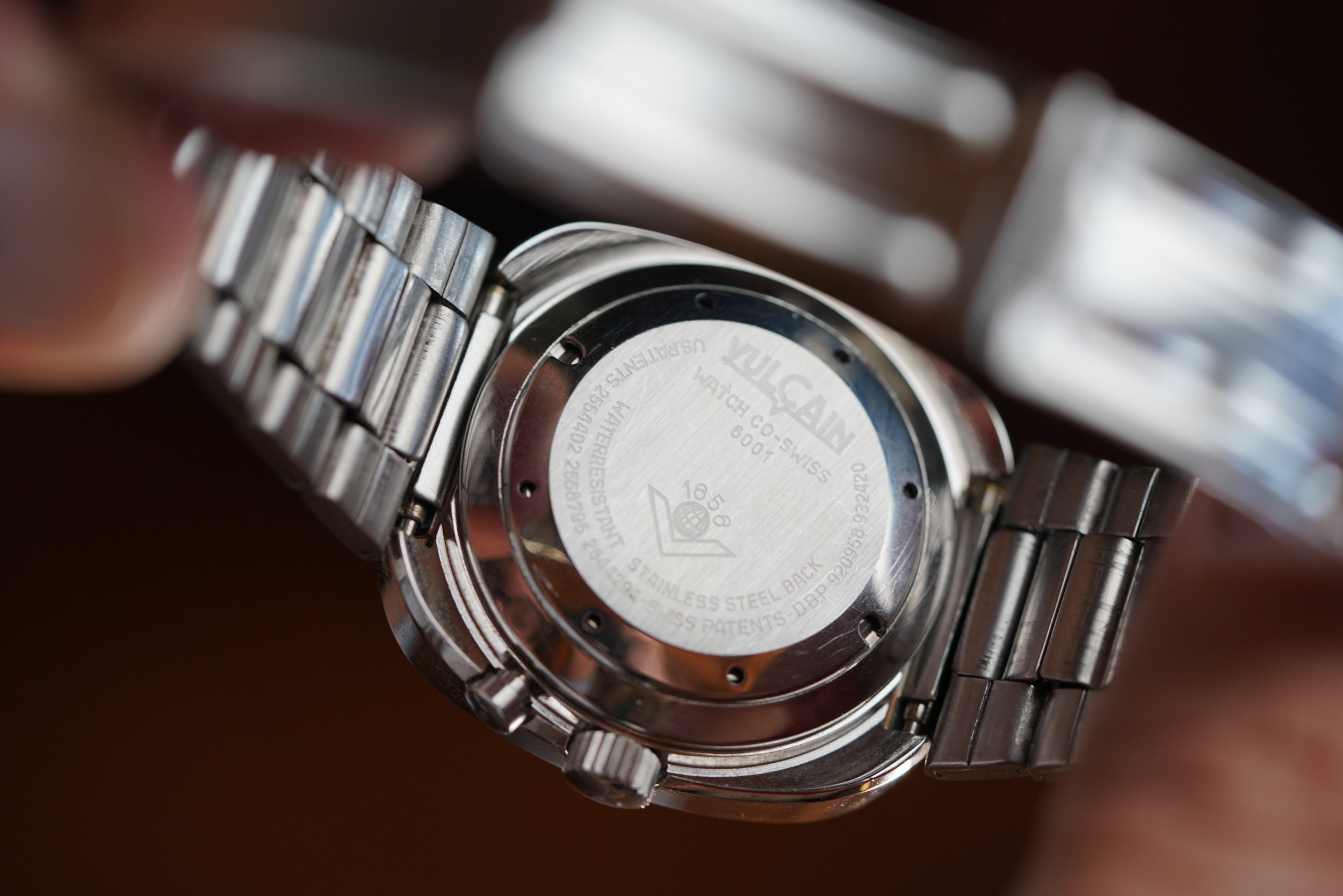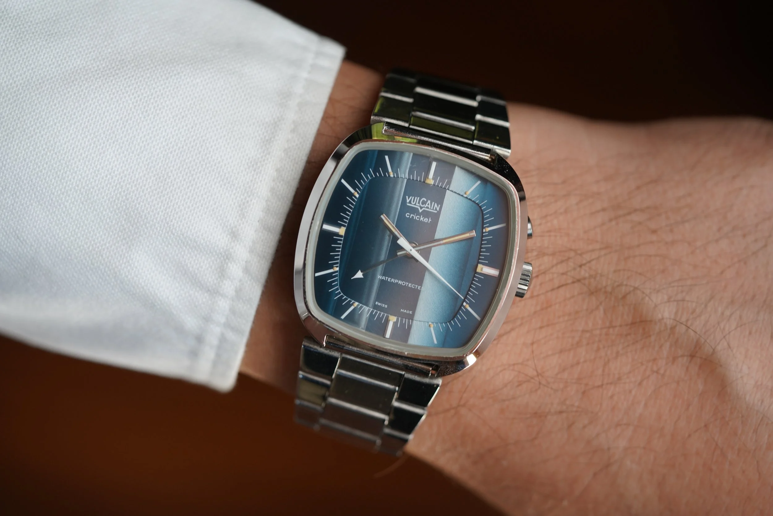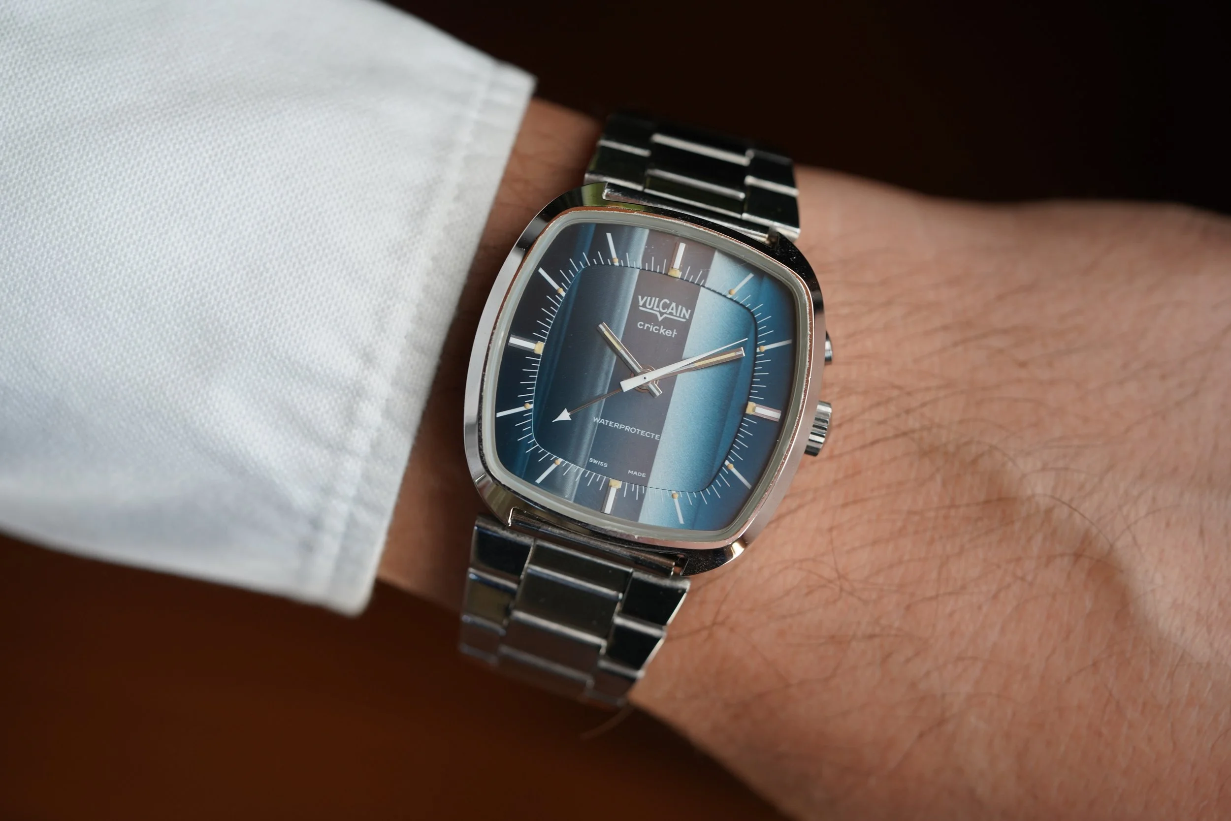 This Vulcain Cricket reference 6001 is a great and funky model from the 1970s. It is powered by the MSR calibre. The case measures approximately 40mm in diameter. It features a stunning multitone blue dial. For those looking for an interesting and different This watch does not come with a box and papers. We do not know the service history, but it is running well. The watch is piared on the original bracelet.