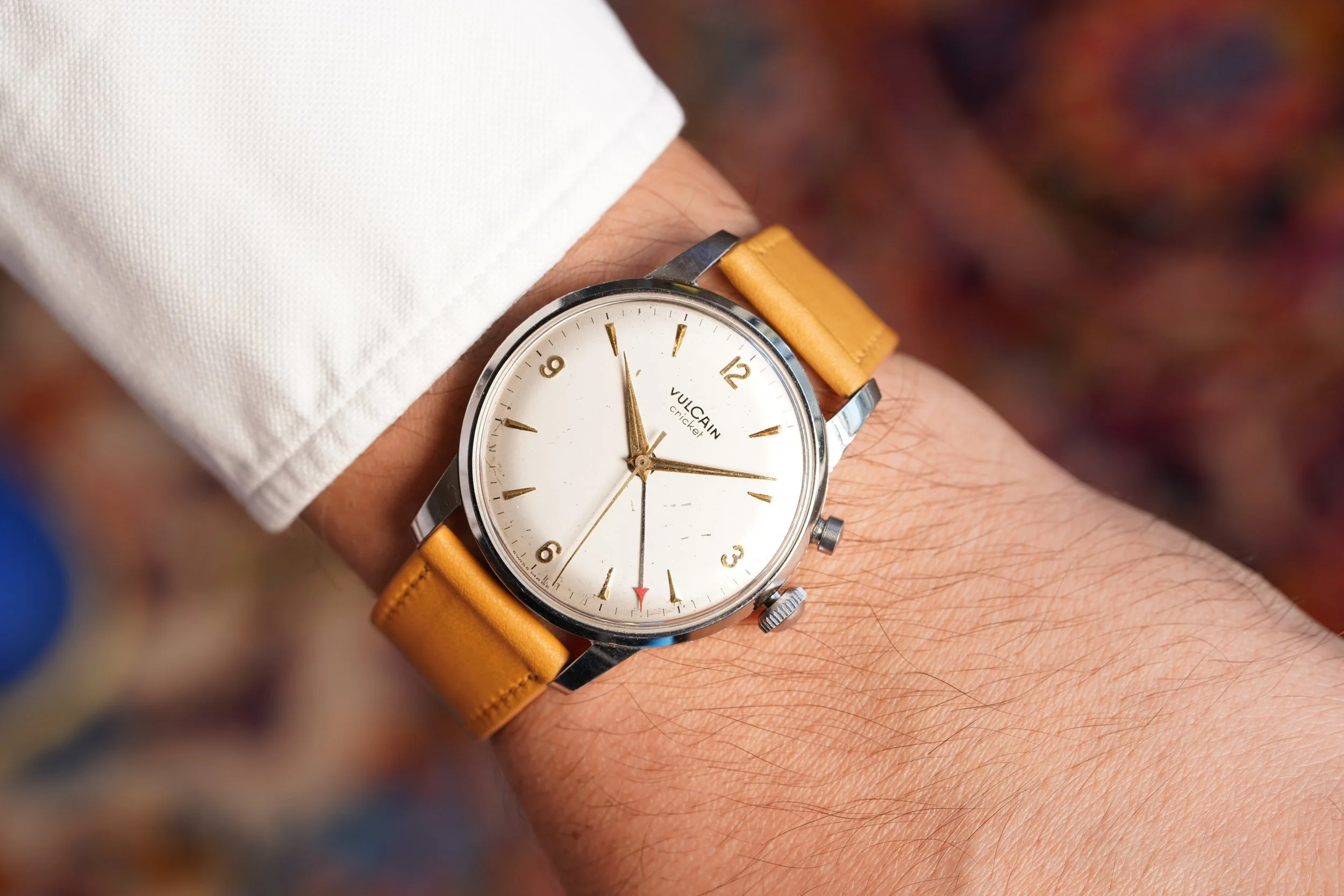 This Vulcain Cricket reference 303001 is among the early oversized Cricket models from the 1950s. Similar to the “King Cricket” model, the case dimensions are 38mm wide with a lug-width of 20mm.