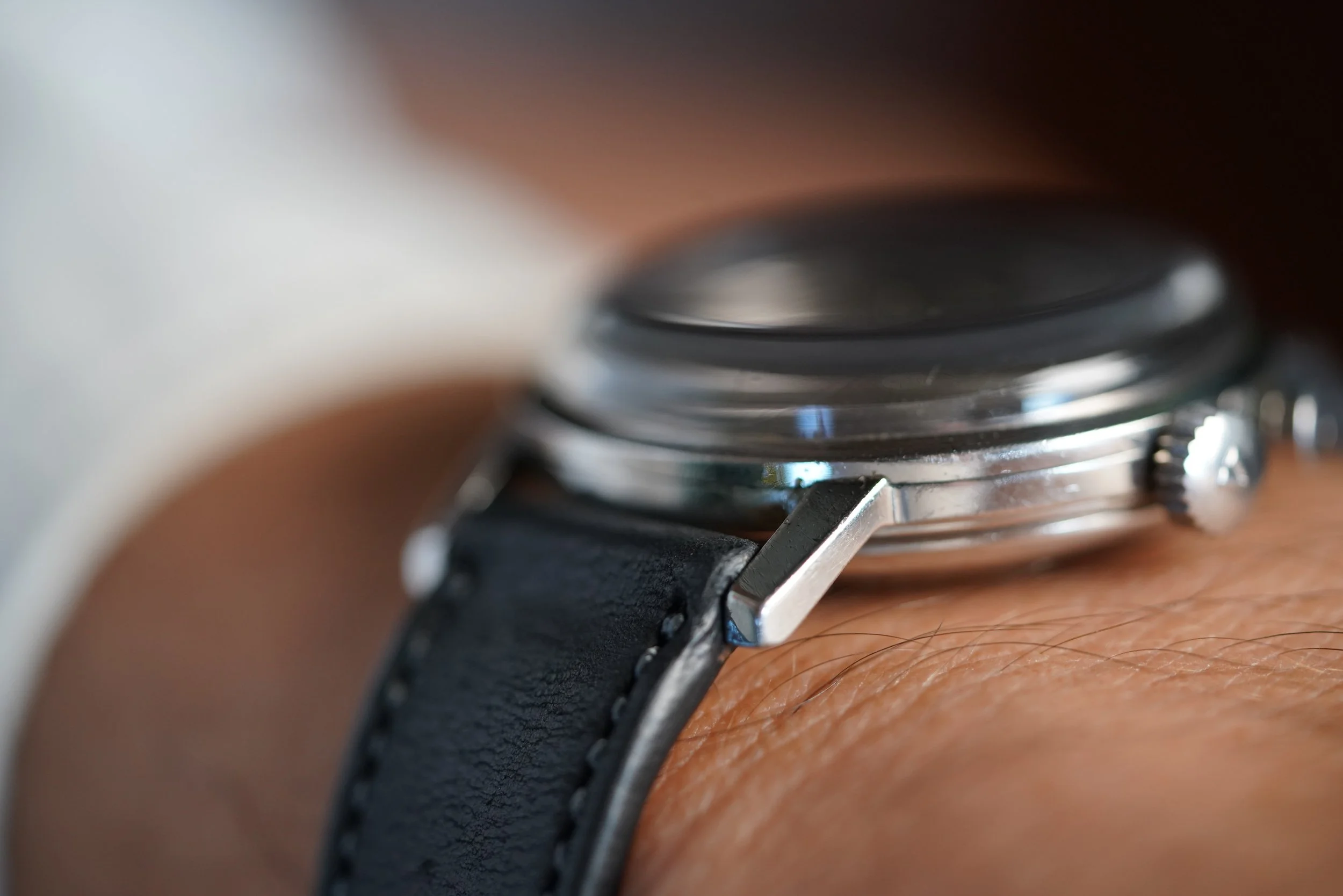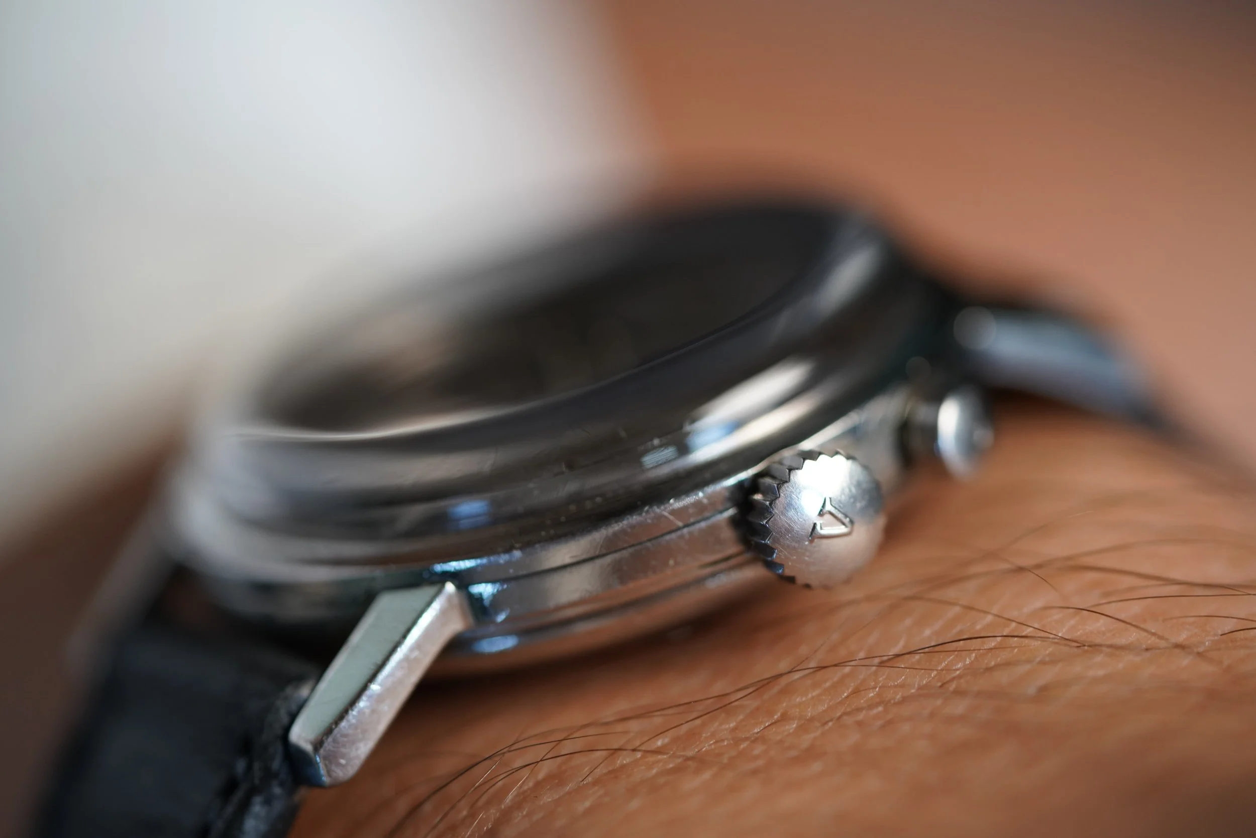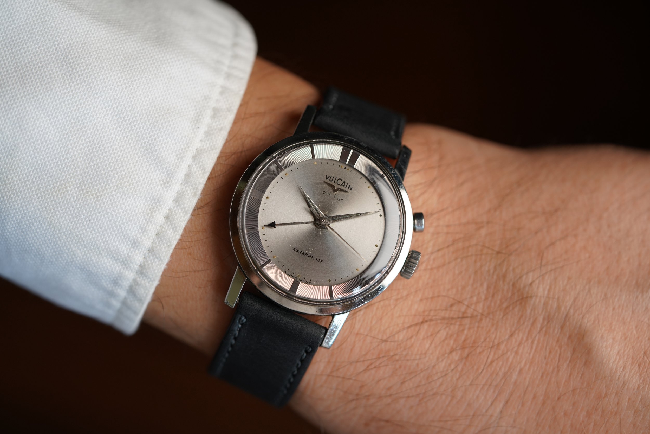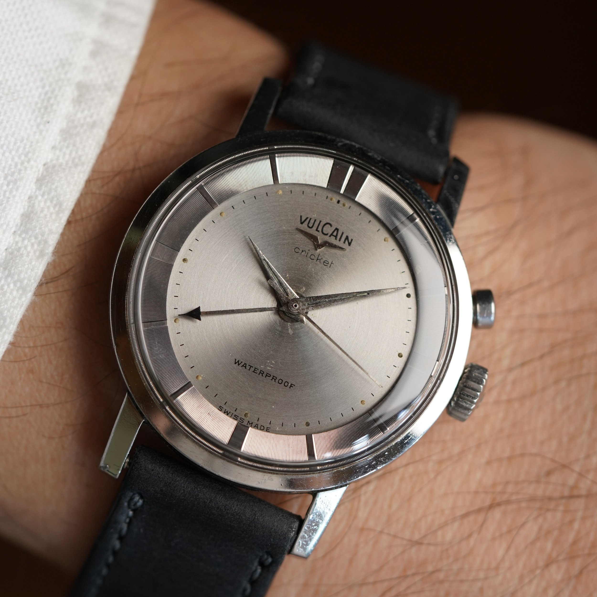 This Vulcain cricket in stainless steel measures 35mm in diameter and 42mm lug-to-lug. The watch features a silver waterproof dial with an engine-turned steel inner bezel.