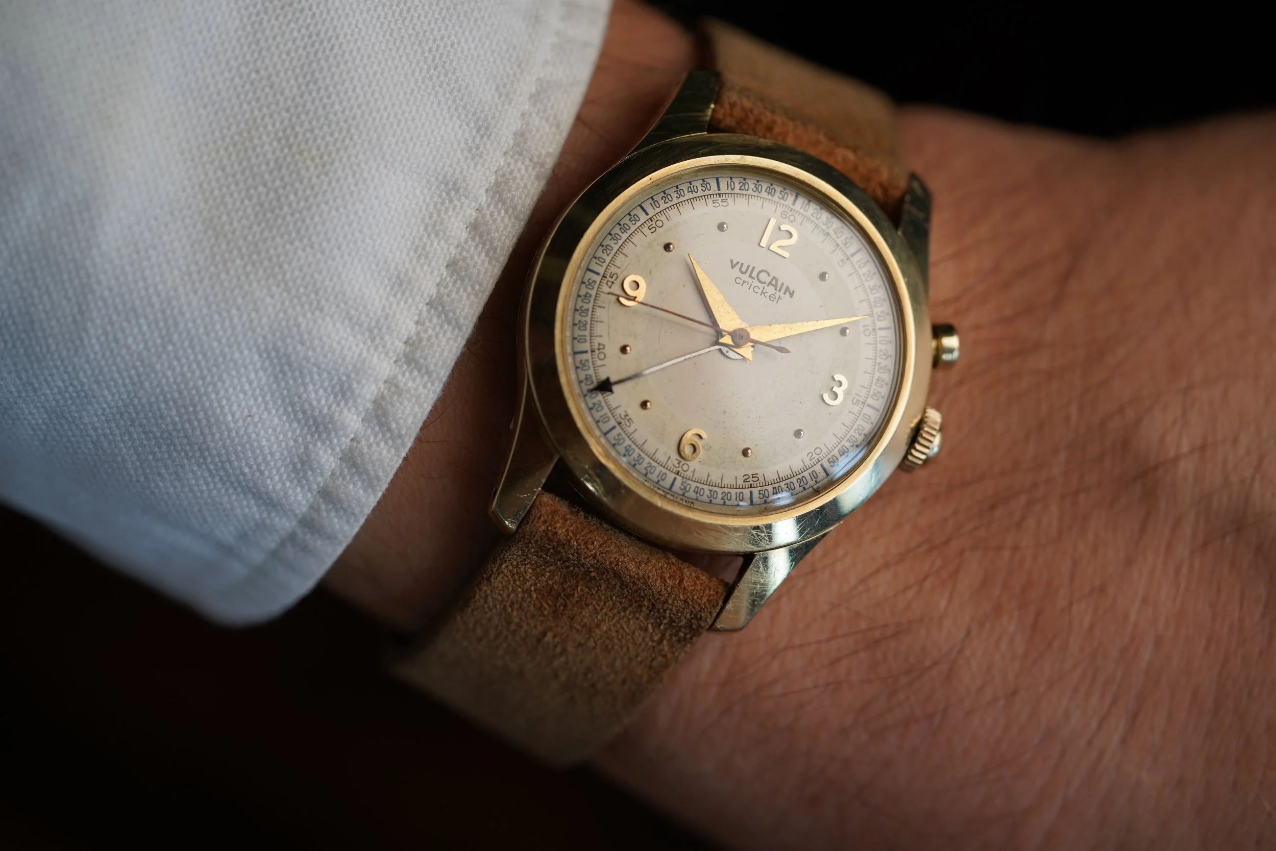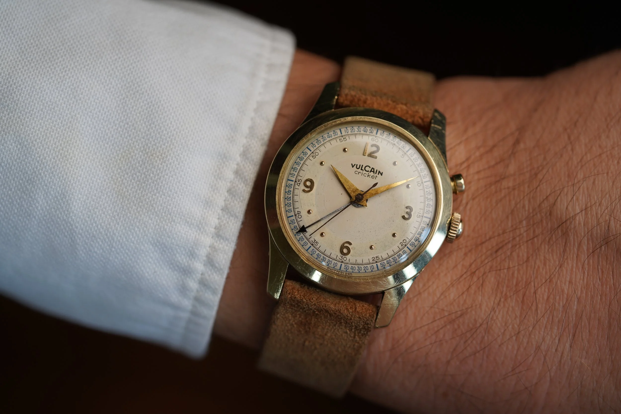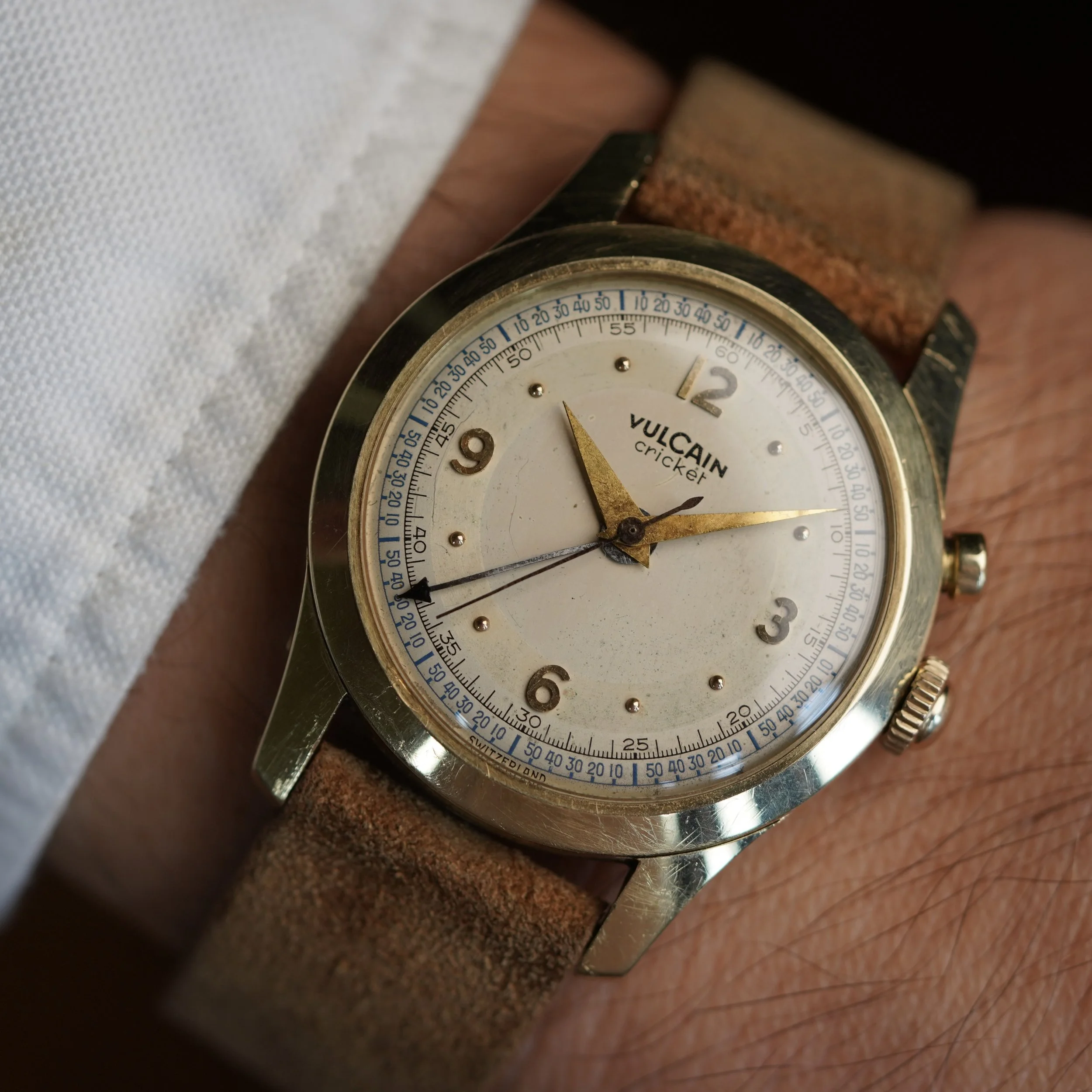 This Vulcain Cricket is among the earliest styles produced just over 100 years after the La-Chaux-de-Fonds manufacturer’s inception. Like the “LBJ” dial Crickets, it features the original or “OG” style case. It measures 34mm in diameter (just under 43mm lug-to-lug). The case is 14k yellow gold. The crown is a service replacement.