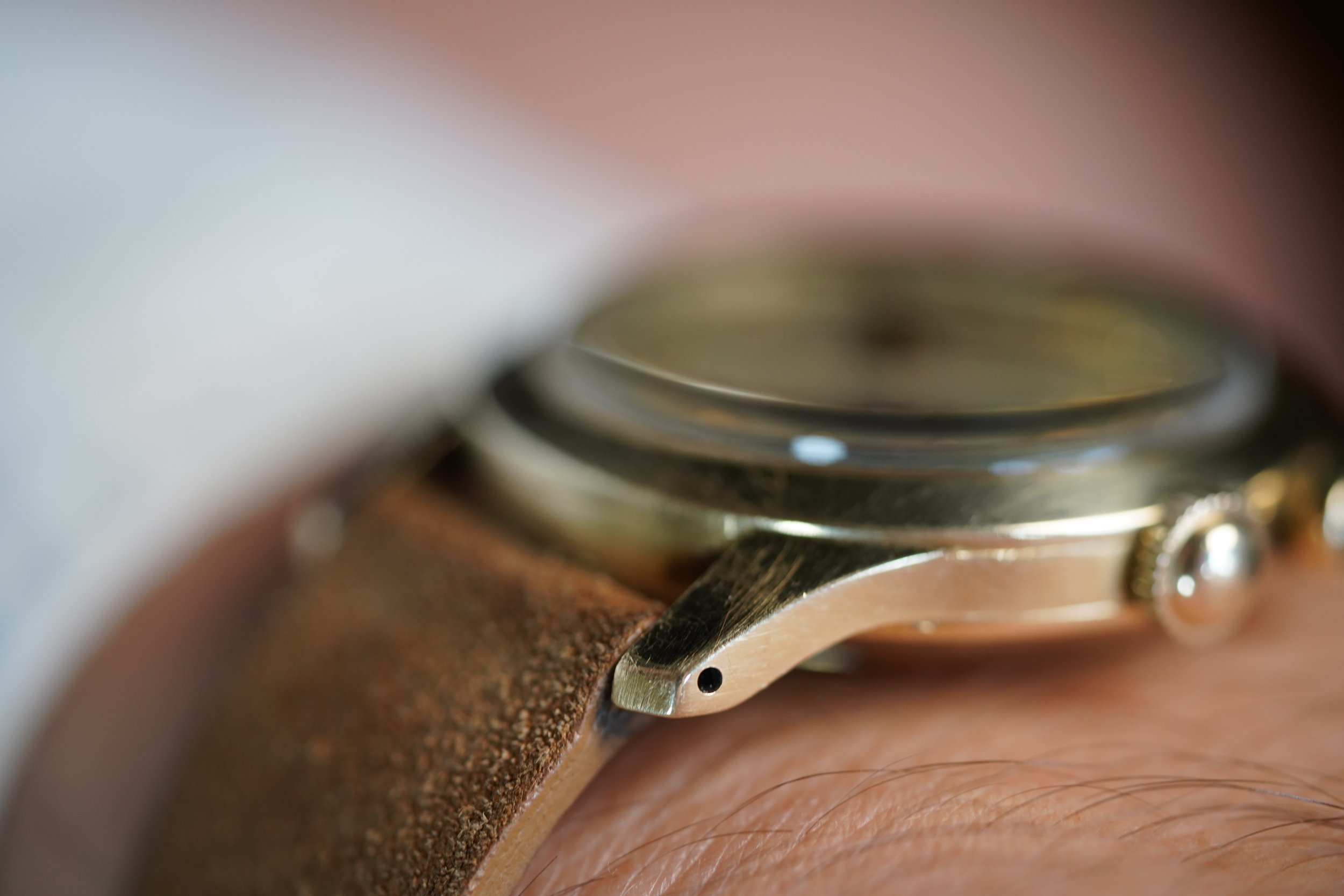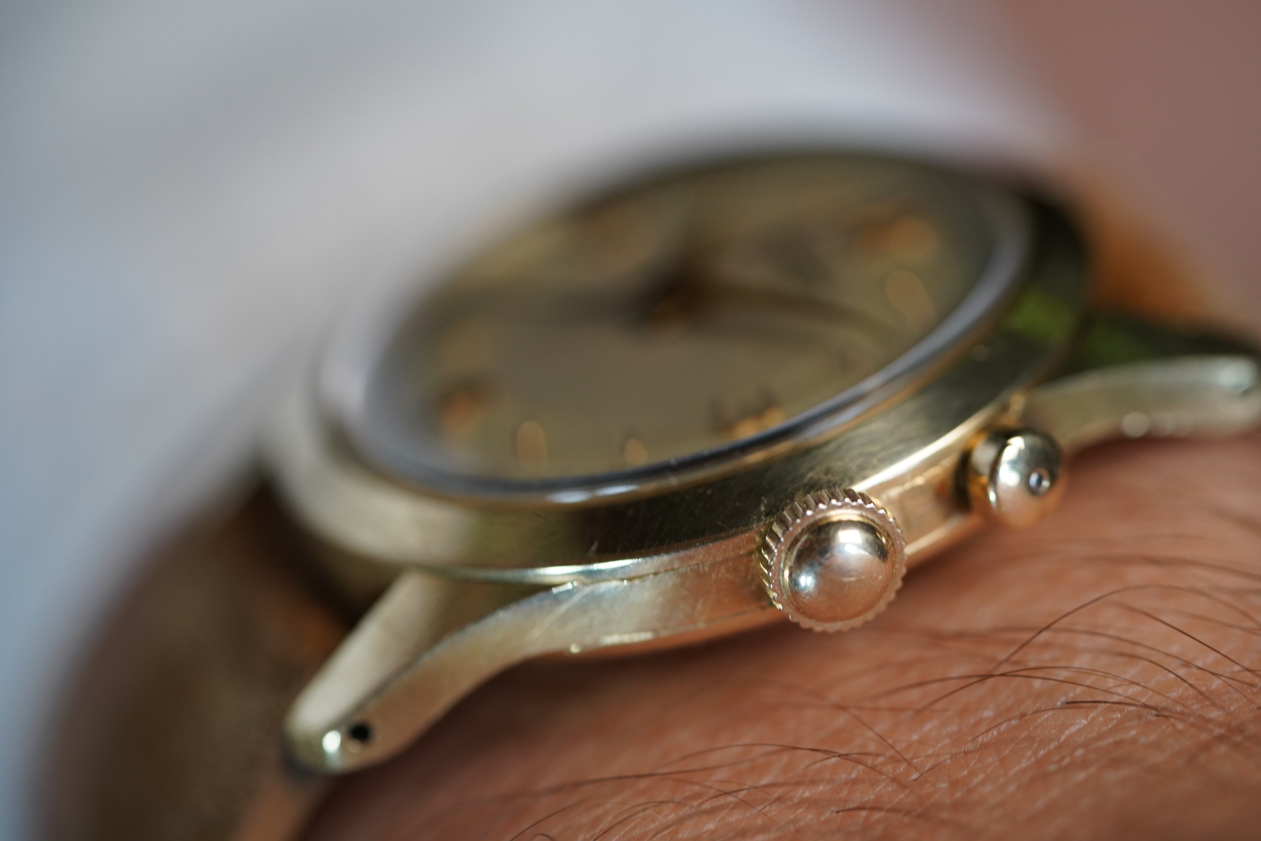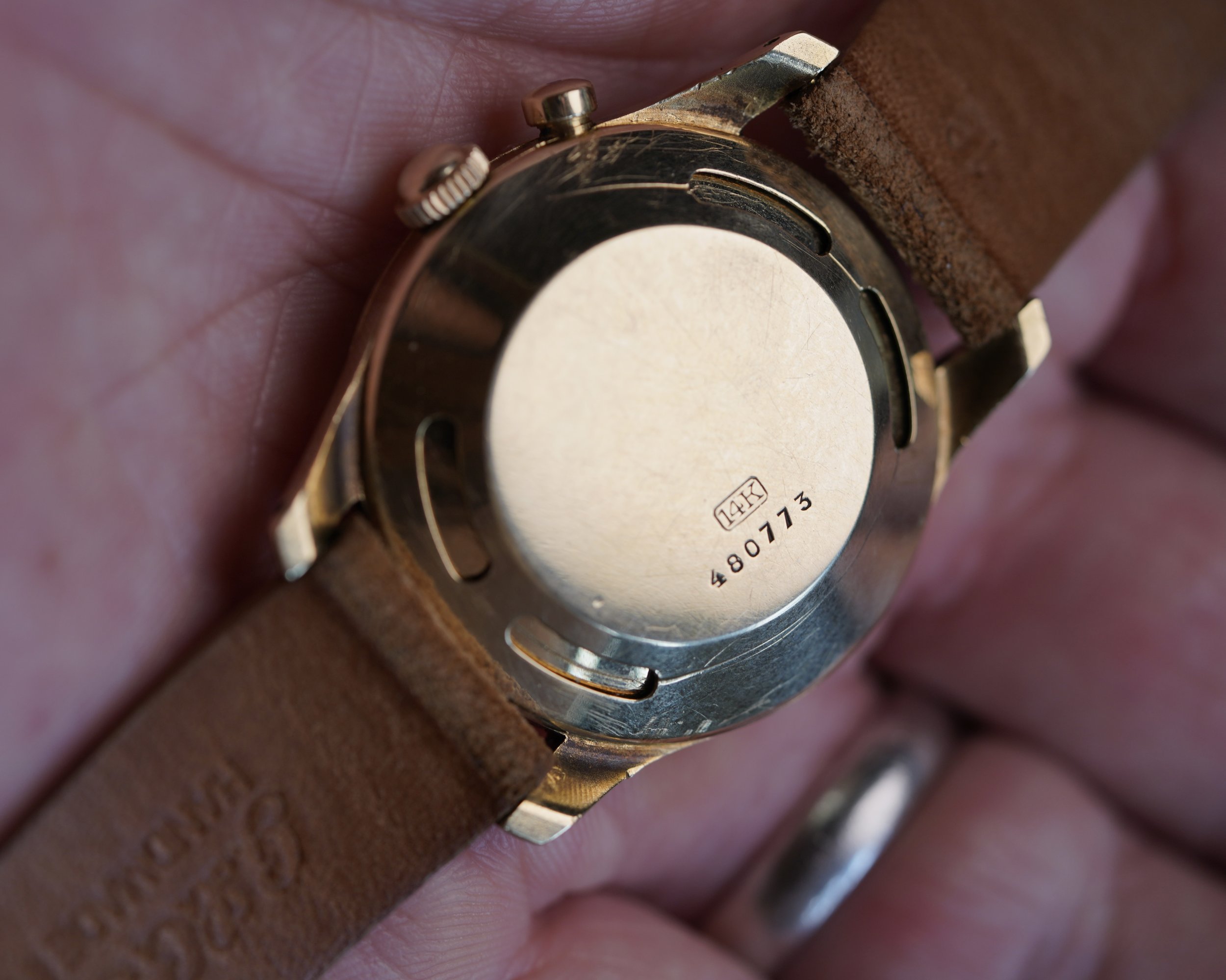 This Vulcain Cricket is among the earliest styles produced just over 100 years after the La-Chaux-de-Fonds manufacturer’s inception. Like the “LBJ” dial Crickets, it features the original or “OG” style case. It measures 34mm in diameter (just under 43mm lug-to-lug). The case is 14k yellow gold. The crown is a service replacement.