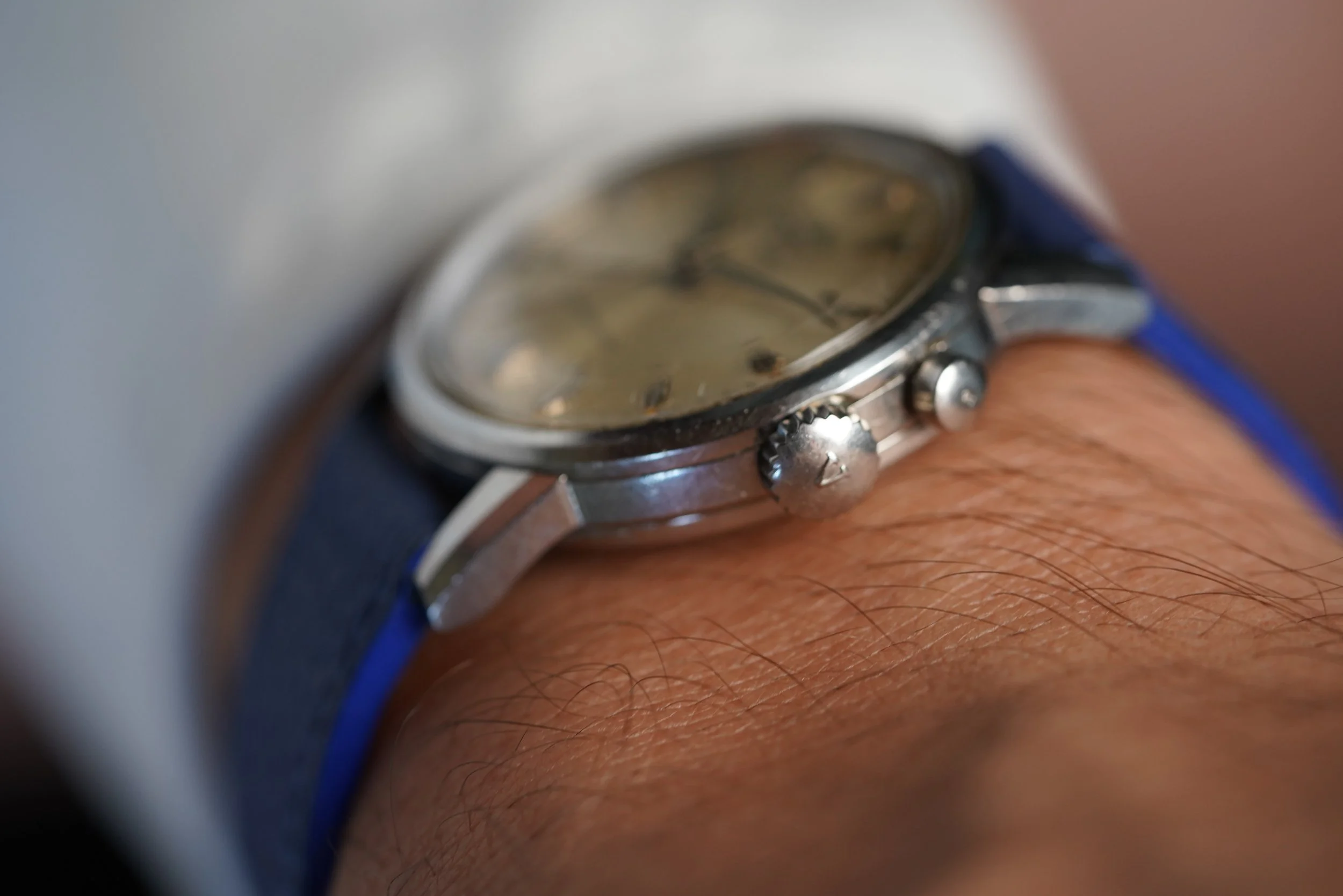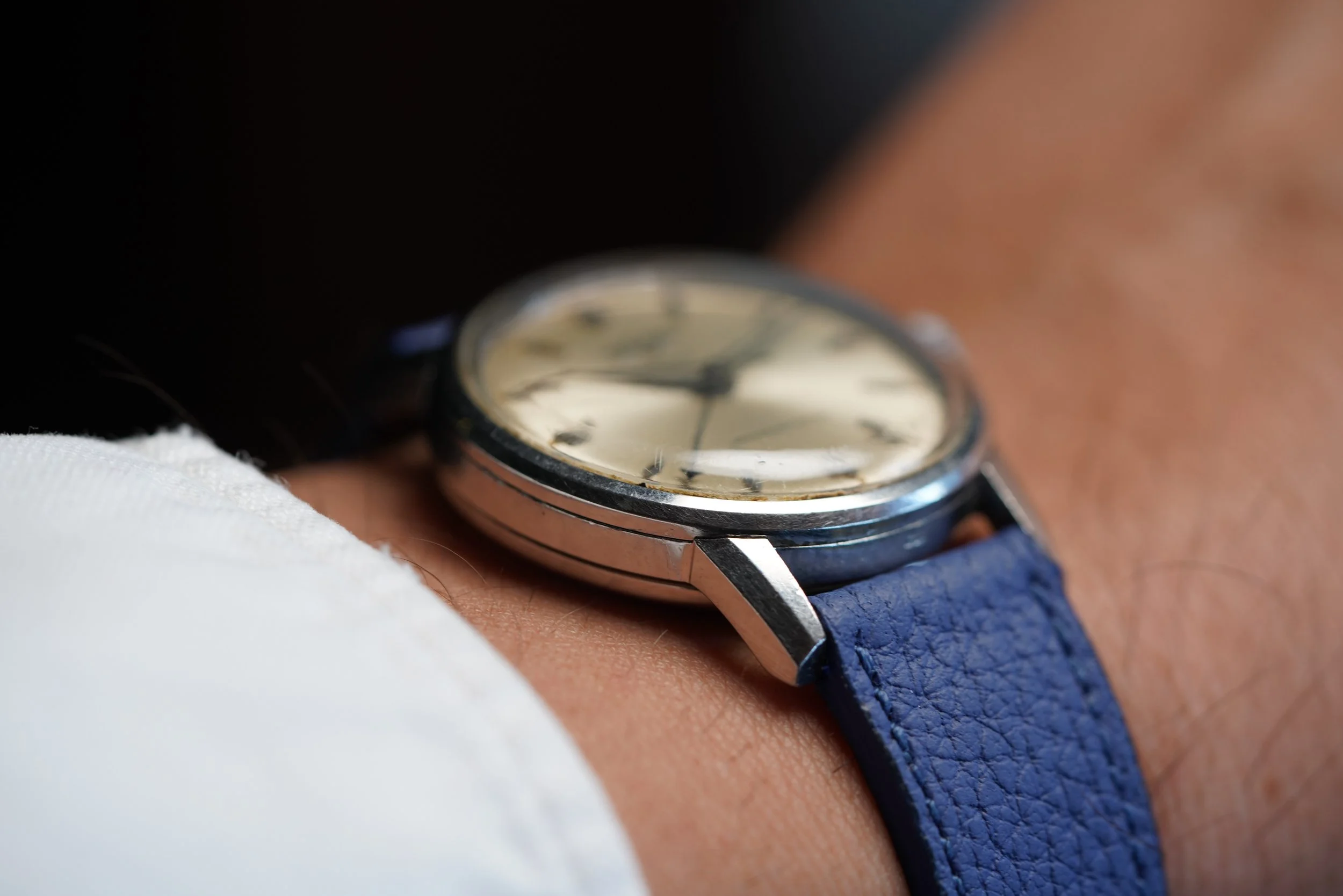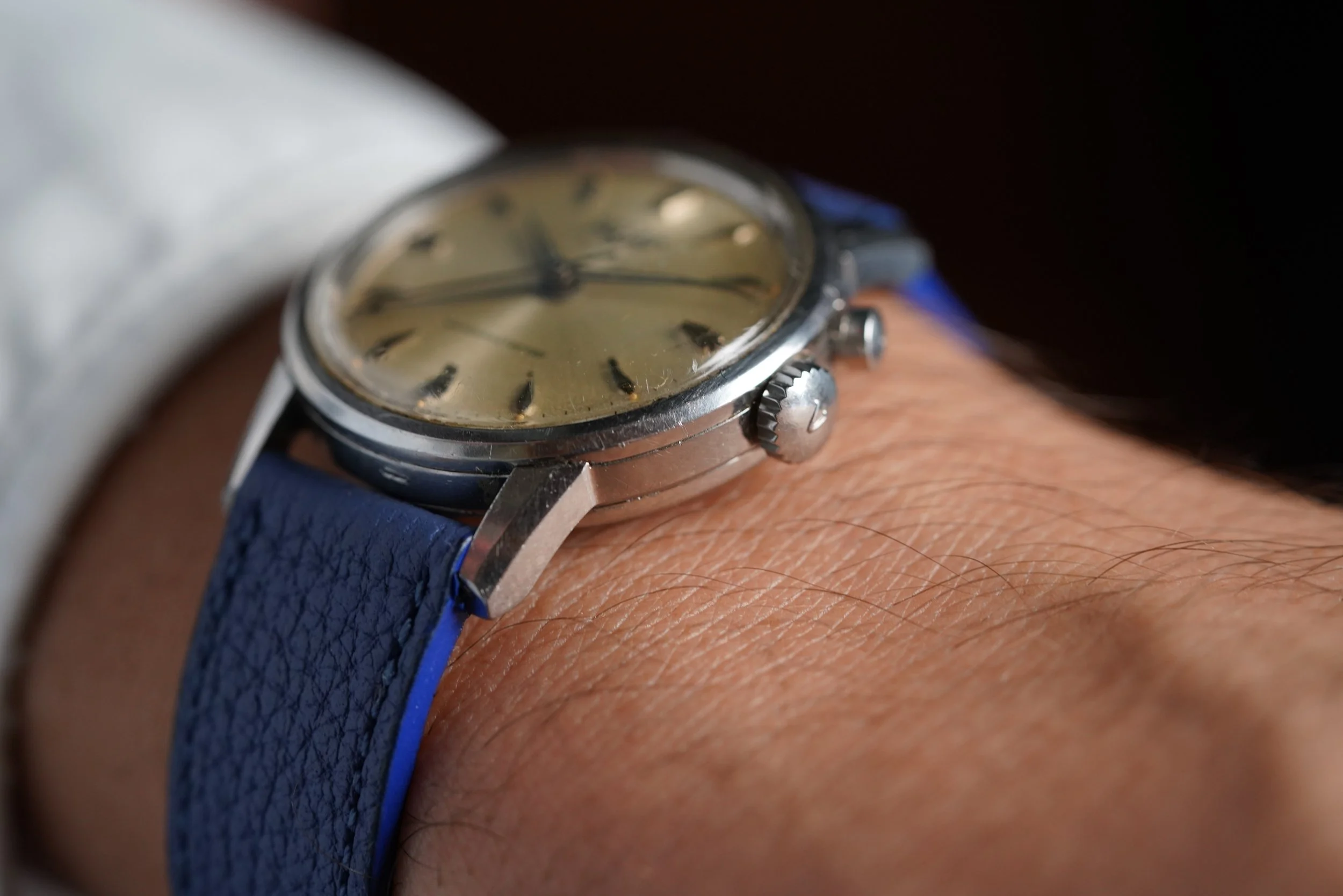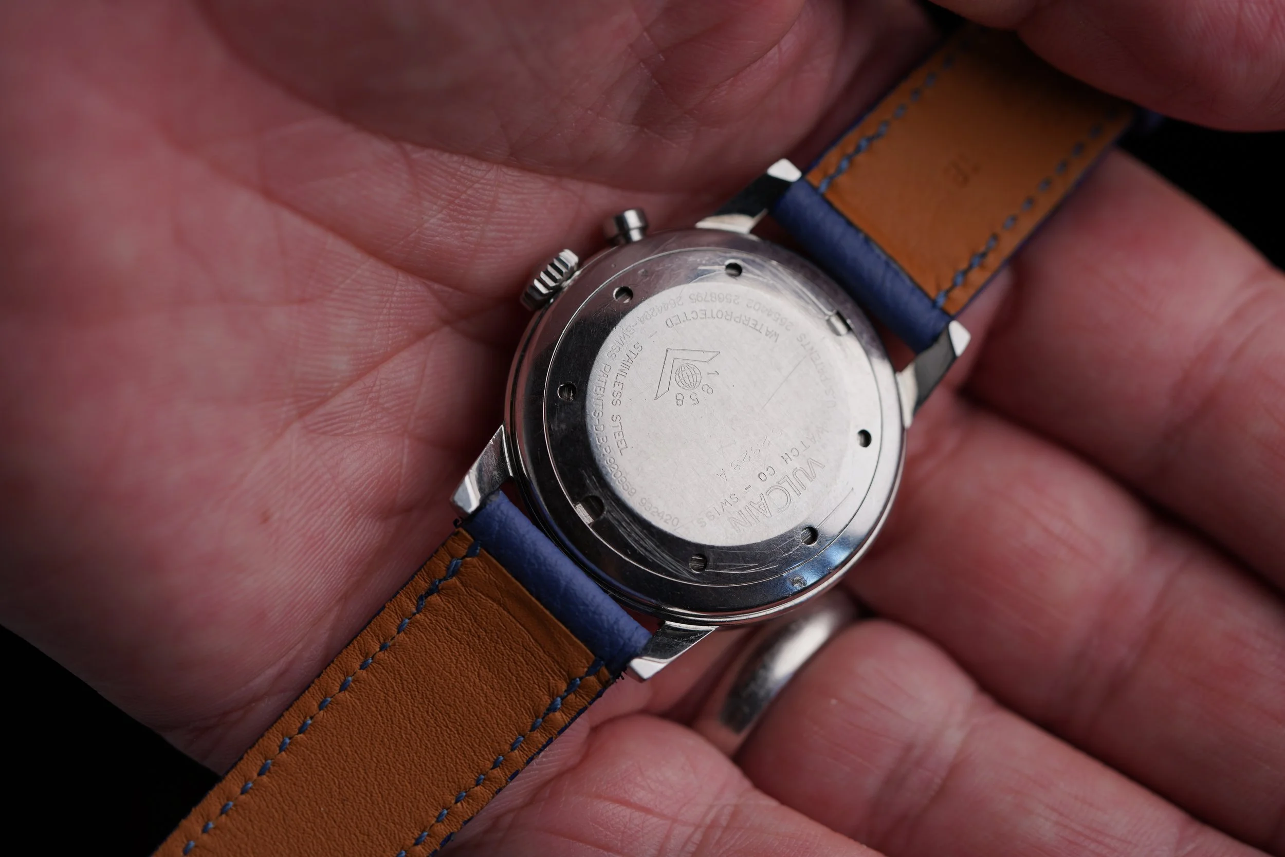 This Vulcain Cricket is a great example with uncommon faceted hour markers. It dates to the mid 1960s with the “Waterprotected” dial. It is powered by the calibre MSR S2. The case is unpolished and measures 34mm in diameter.