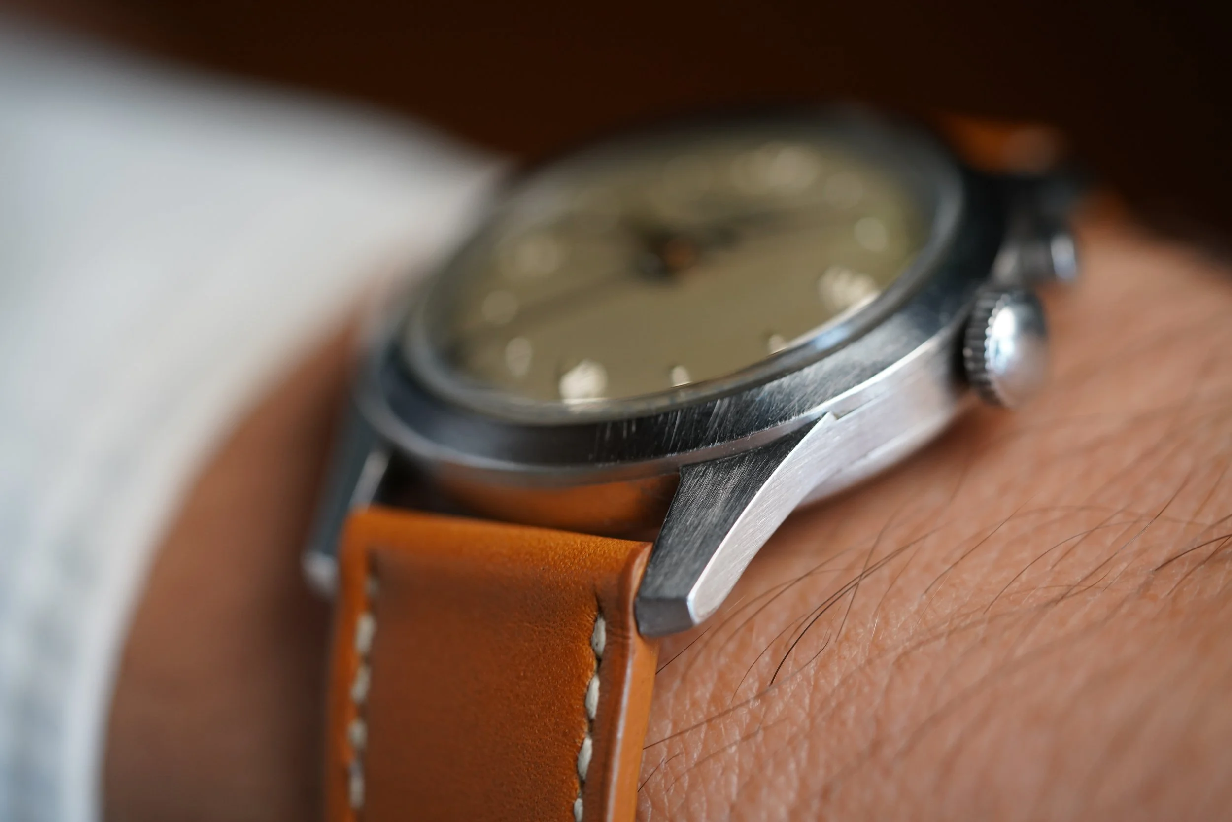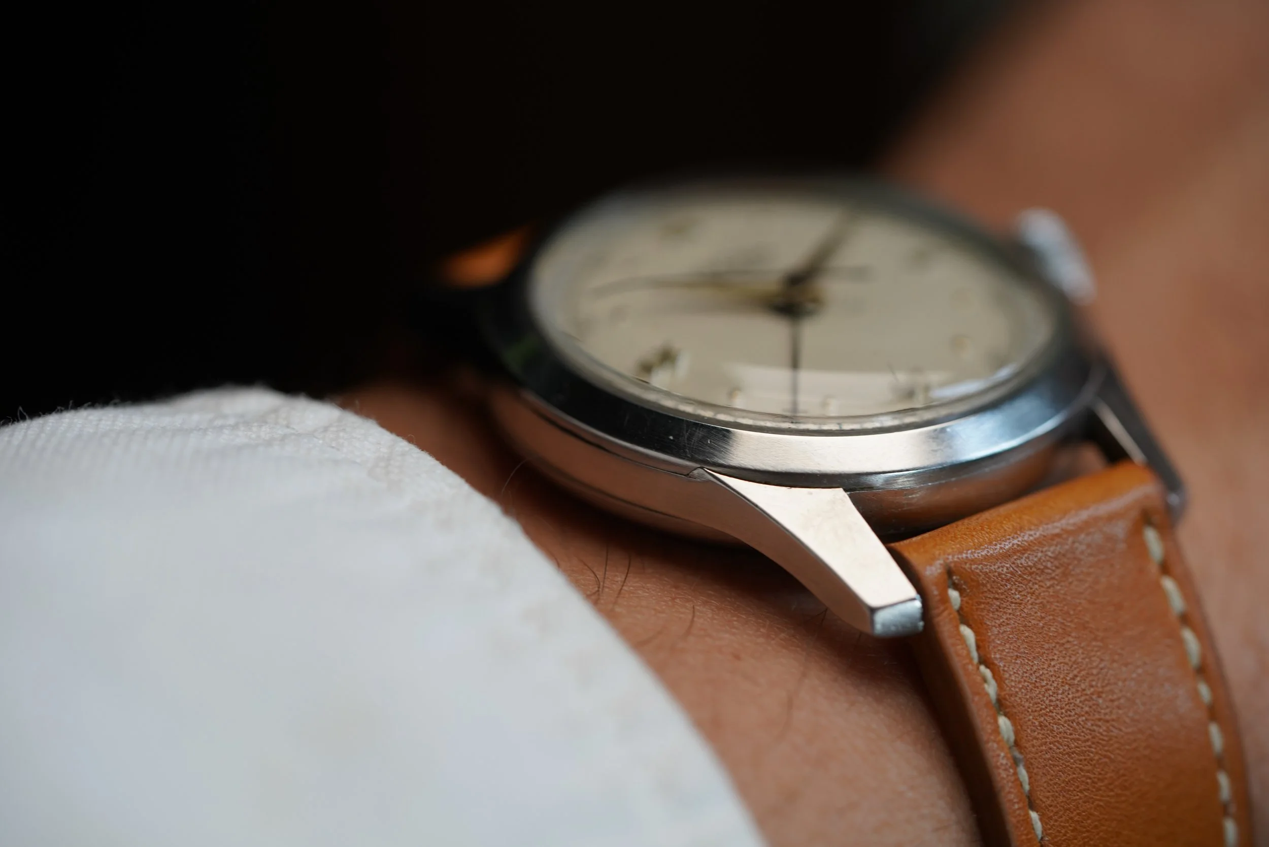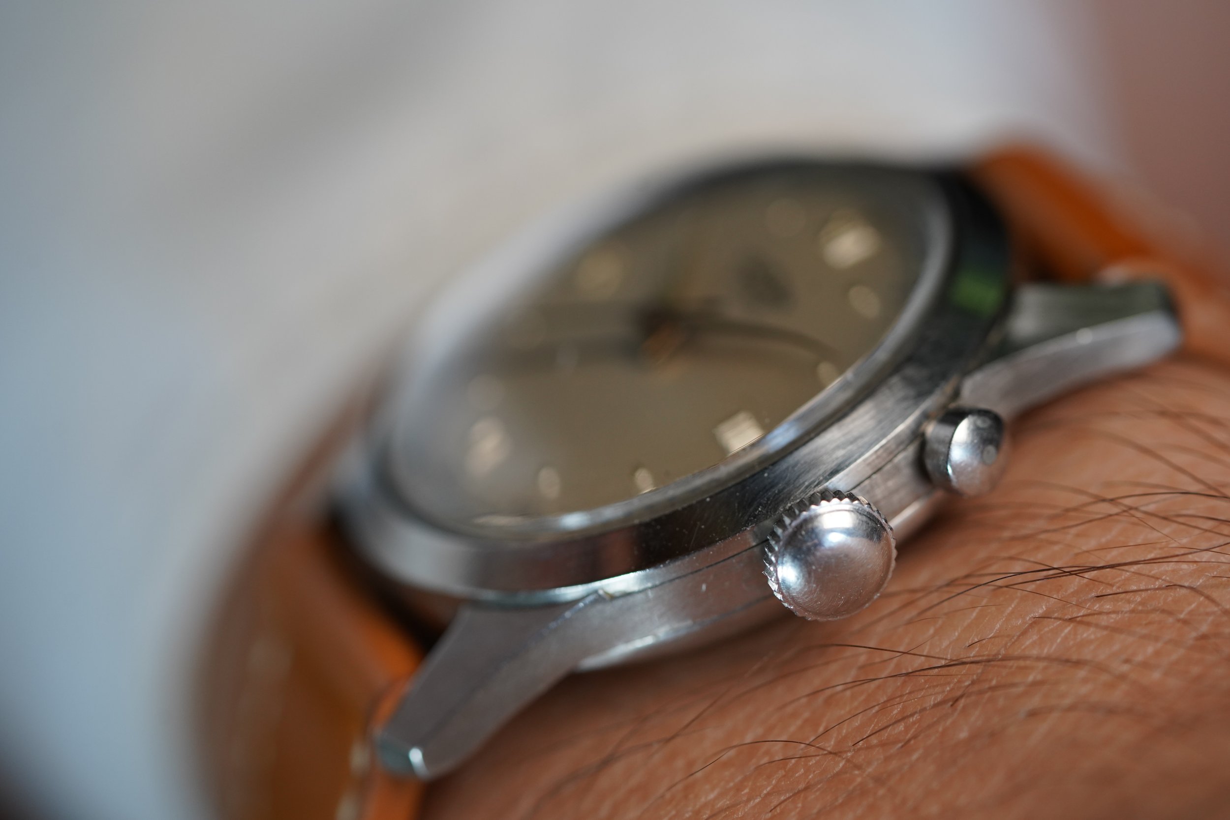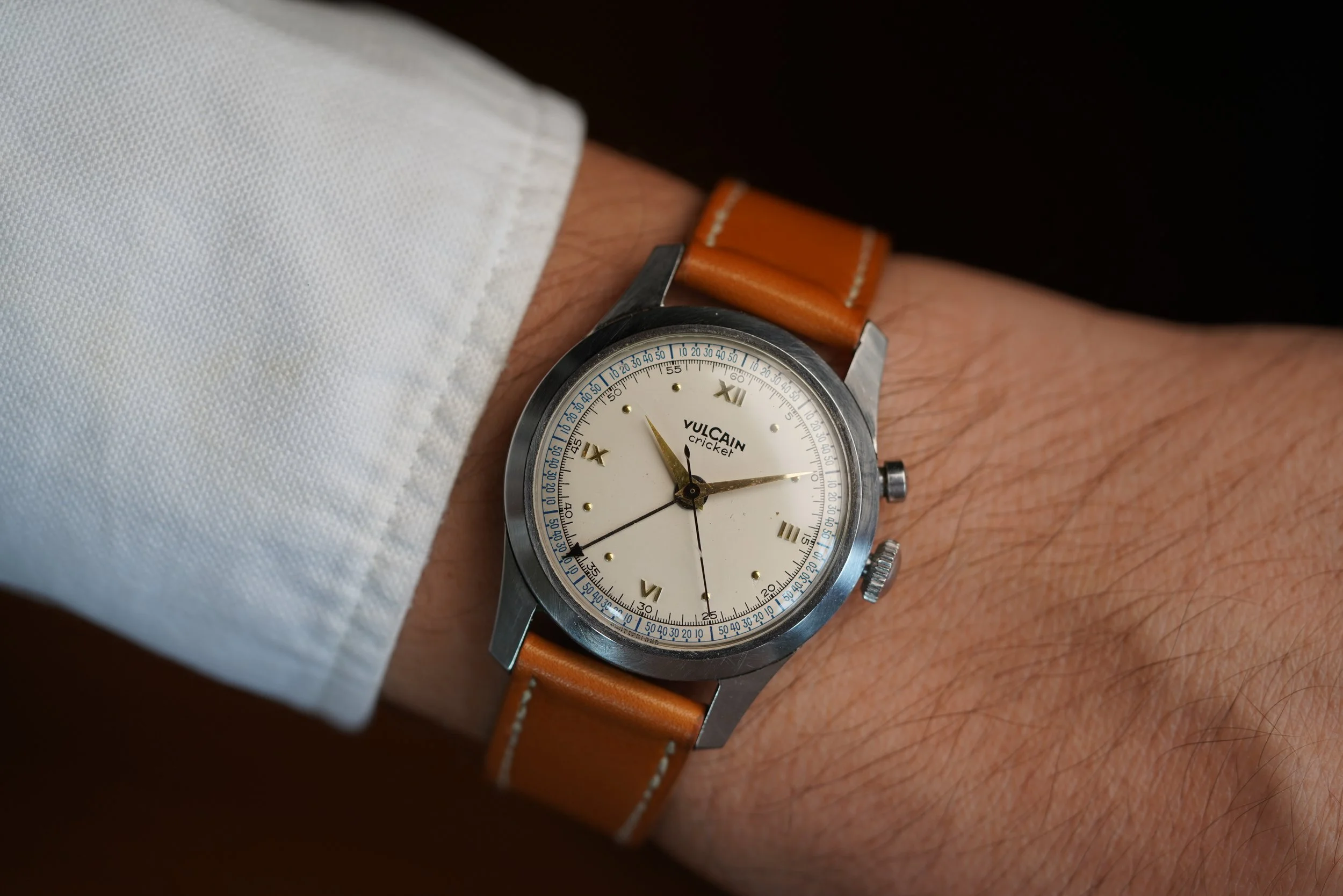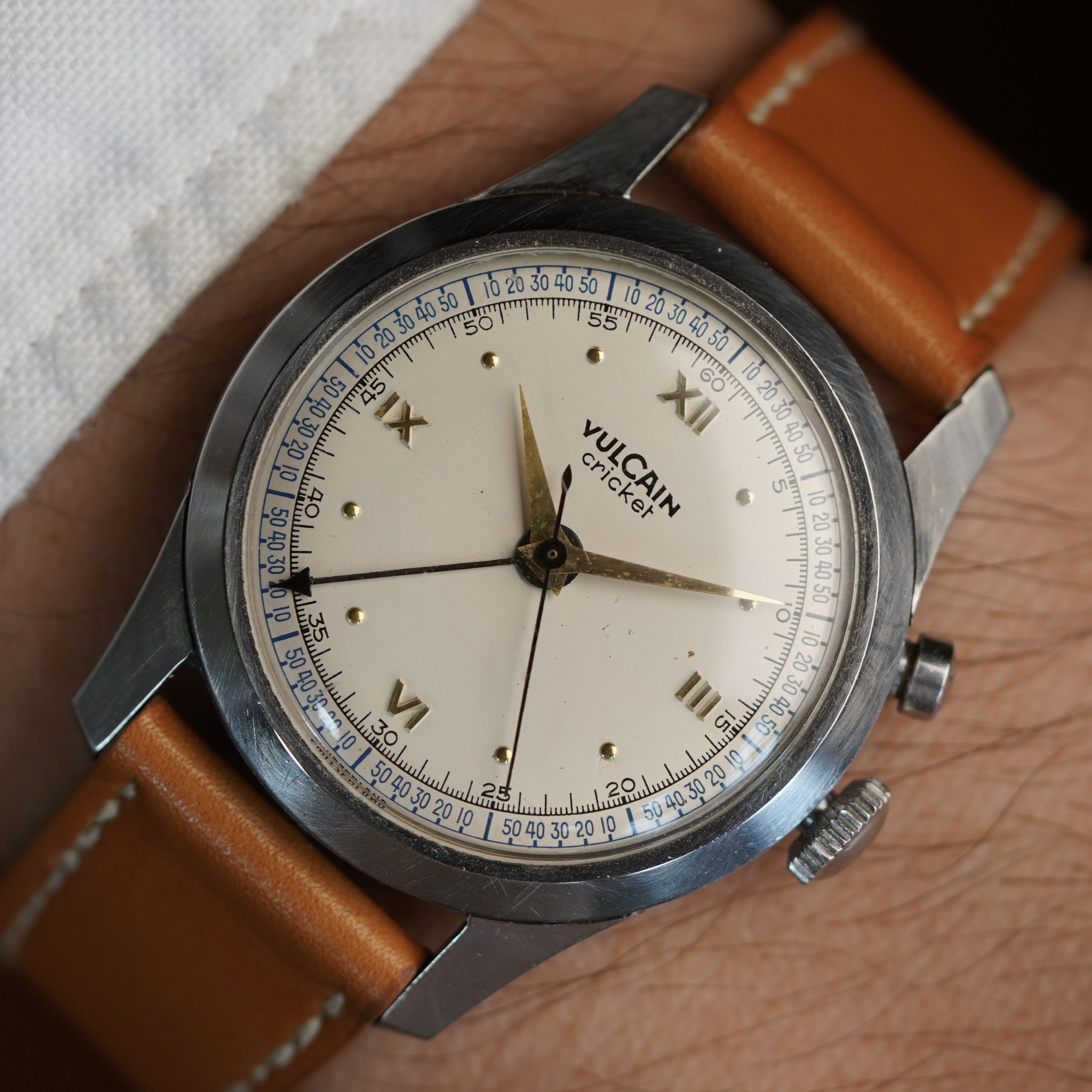 This is a spectacular cricket with a beautiful patina to the dial and hands. It features the original or “OG” style case. It measures 34mm in diameter (just under 43mm lug-to-lug). The steel case features non-drilled lugs and the dial has the distinct Roman numeral dial. The crown and pusher are original.