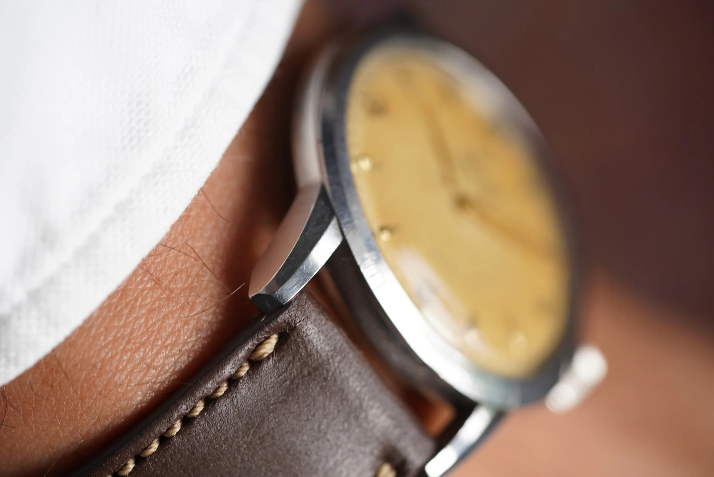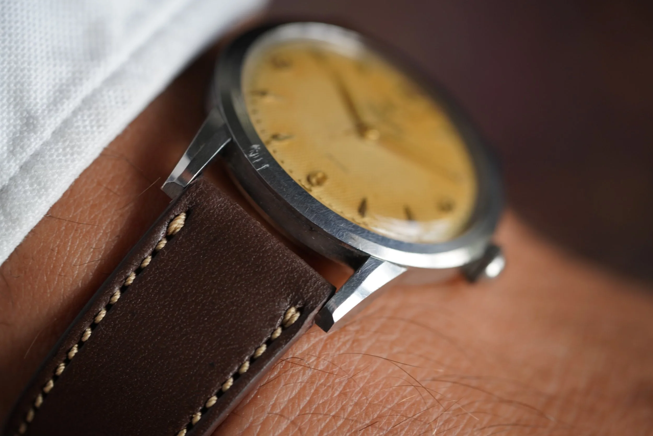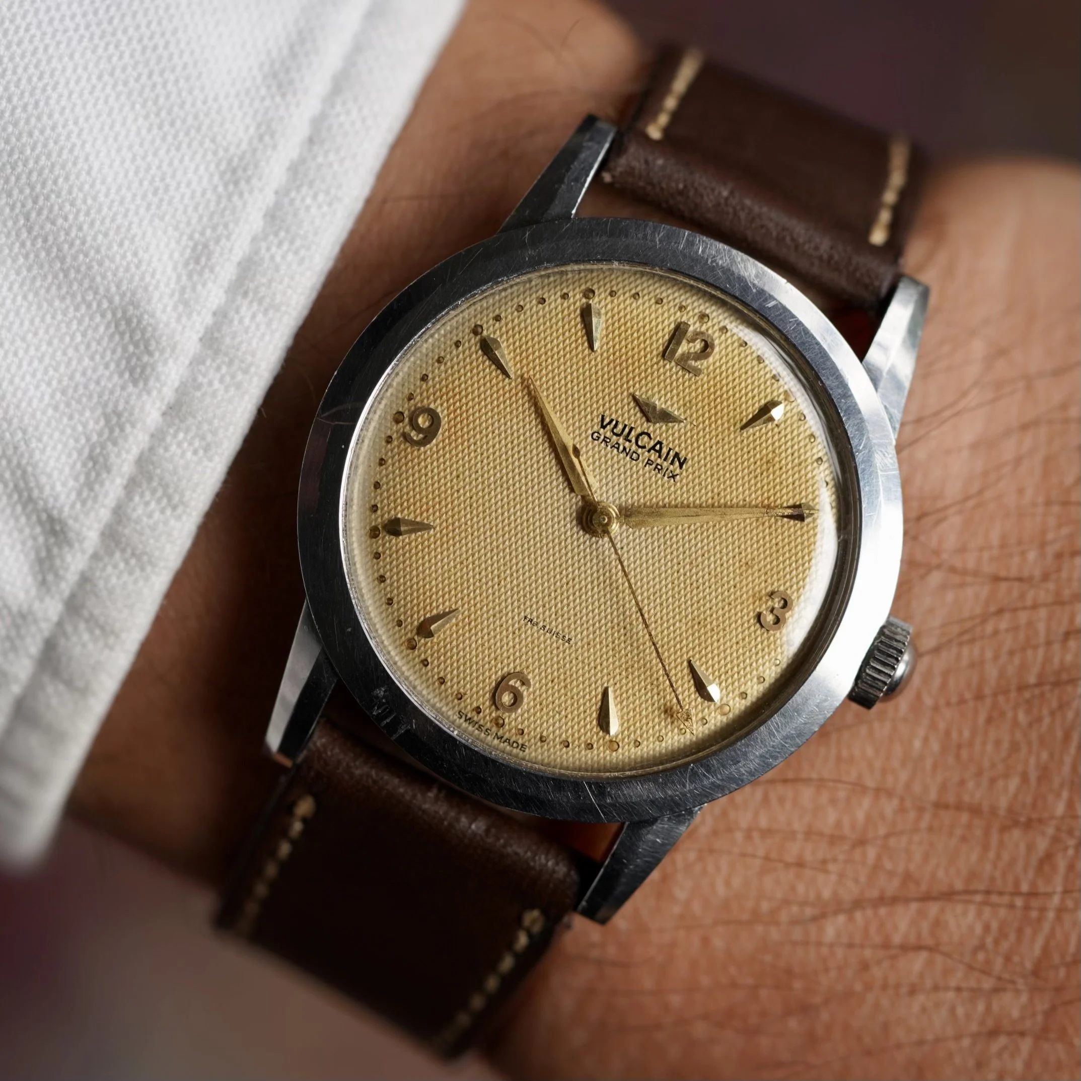 This Vulcain Grand Prix is a super cool time-only model from the manufacurer dating to the late 1950s. The watch features a super cool honeycomb dial with beautiful patina. The case is unpolished and measures 35mm in diameter (41mm lug-to-lug). The crown is a replacement.