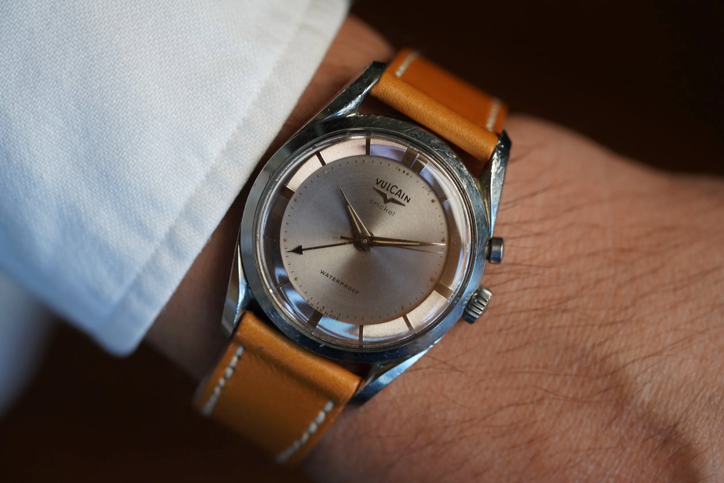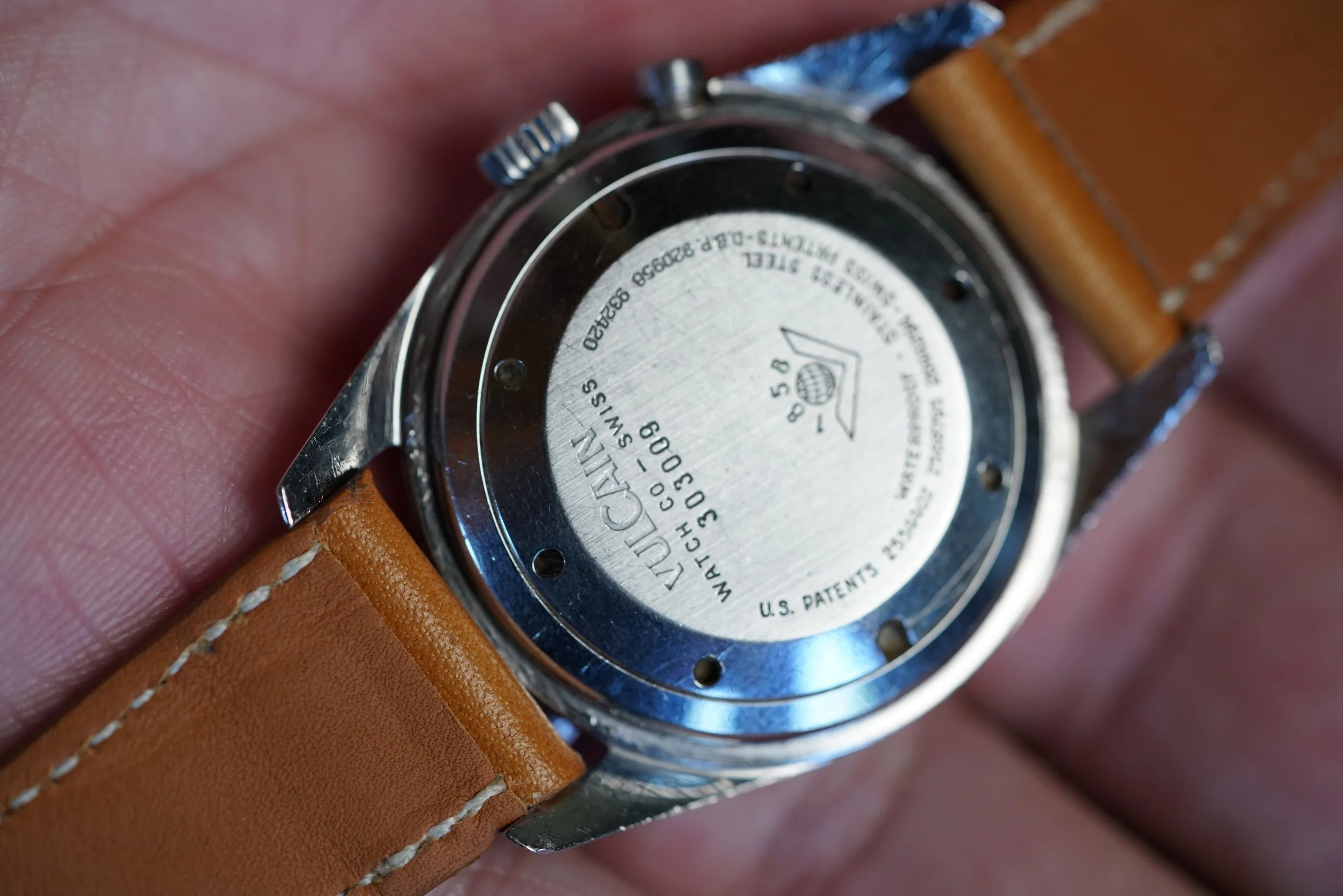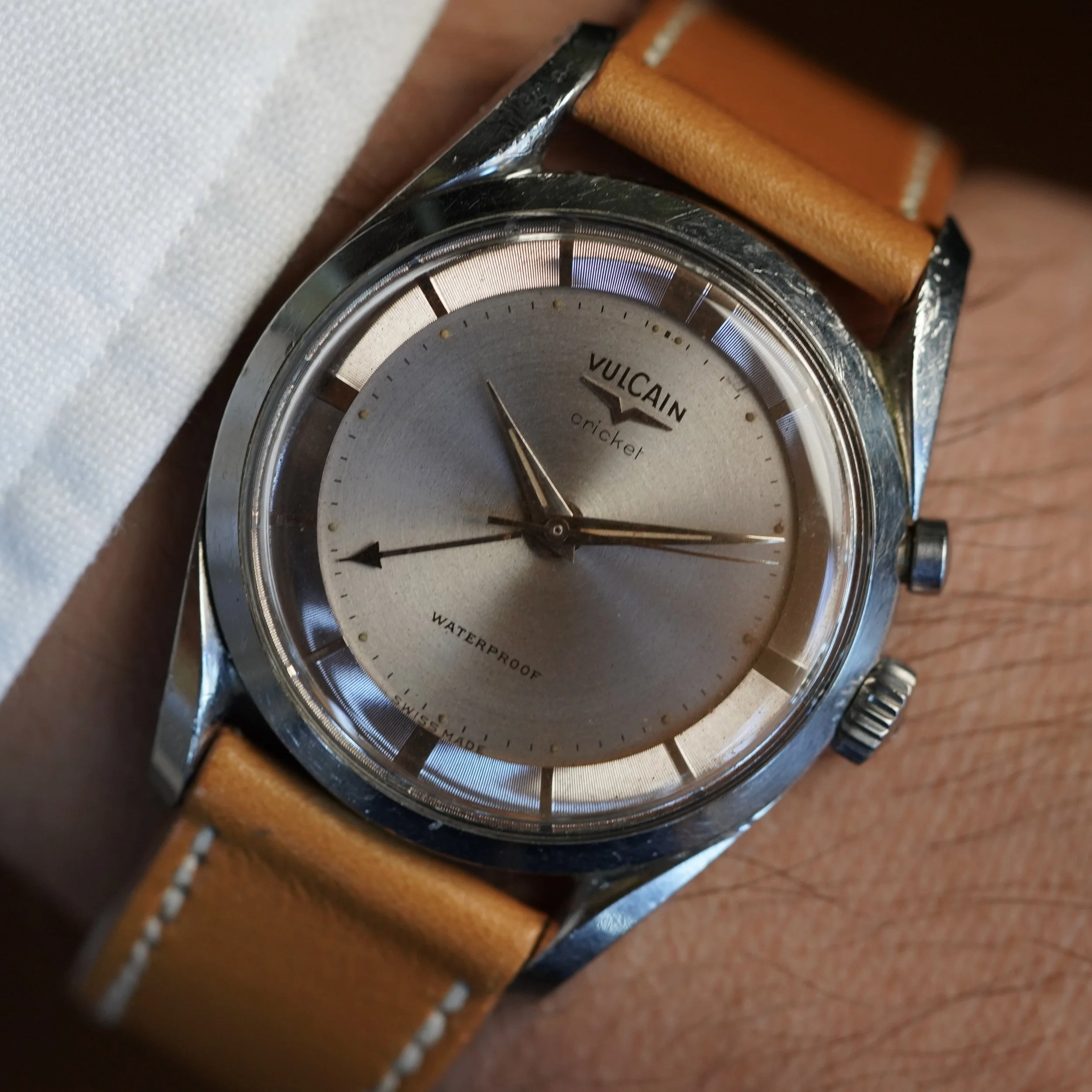 This is an incredibly cool and rare Vulcain Cricket alarm model with a Polerouter style case and dial. These are extremely nice on the wrist. The case appears unpolished and the diameter is 35mm.