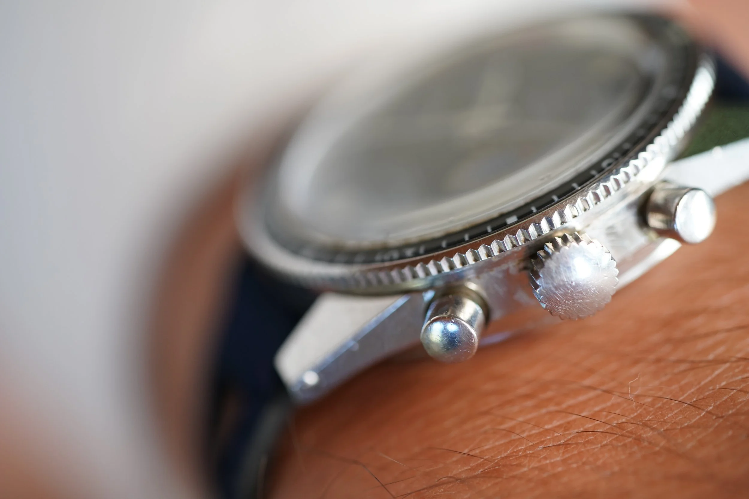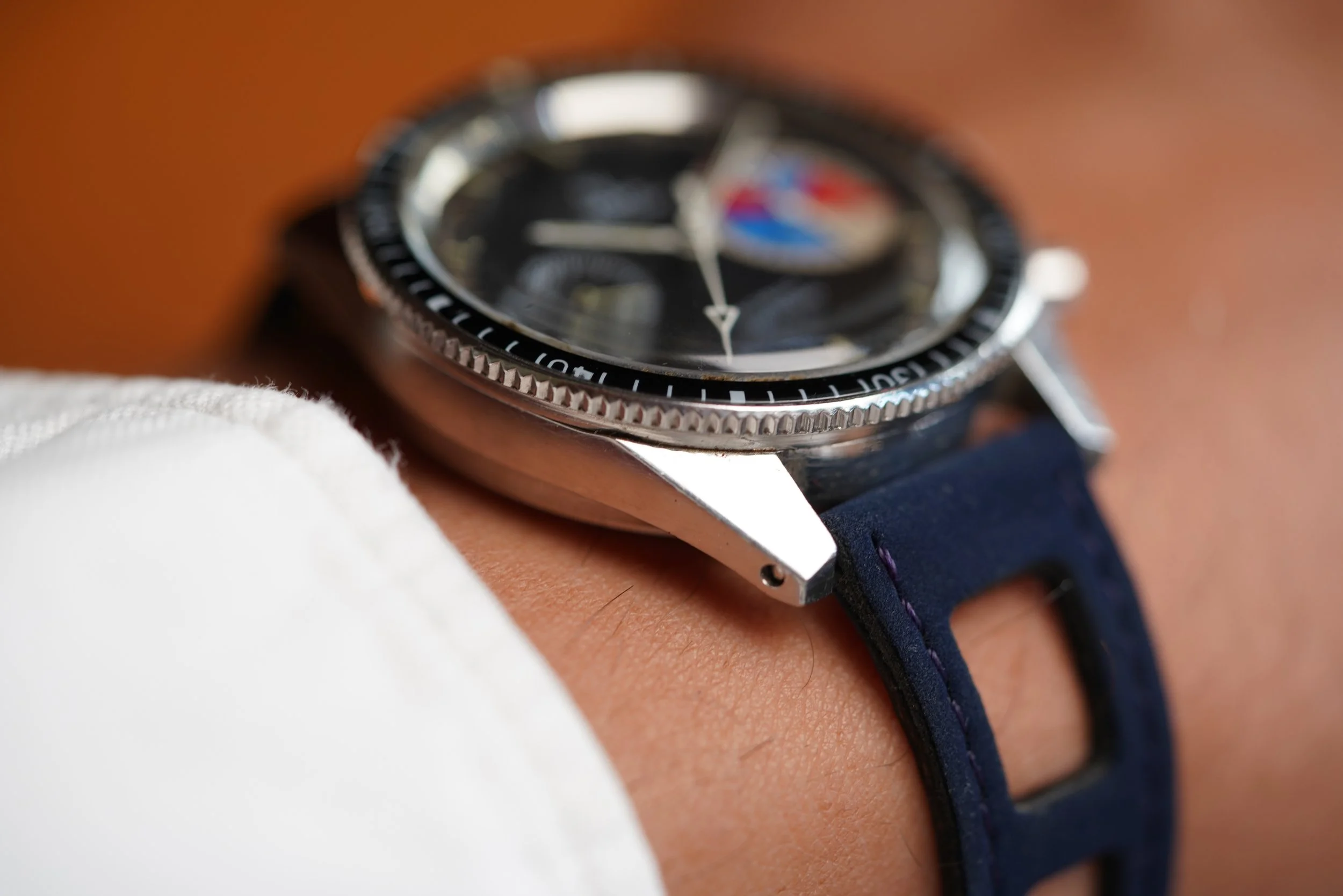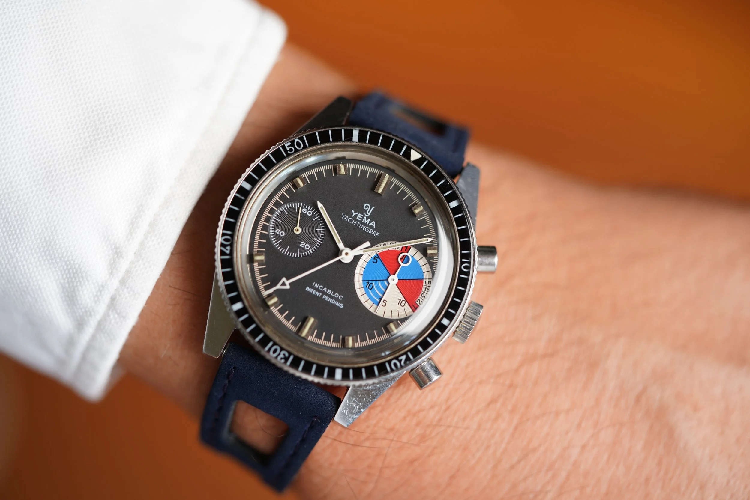 This Yema Yachtingraf is a very cool watch, designed as a chronograph regatta timer. The watch measures approximately 39mm in diameter and 44.5mm lug-to-lug. The stainless-steel case appears to be unpolished. It features a bi-directional rotating bezel and a contrast sub dial to time the 5-minute countdown of a regatta race. This watch is powered by the Valjoux 7733 movement.