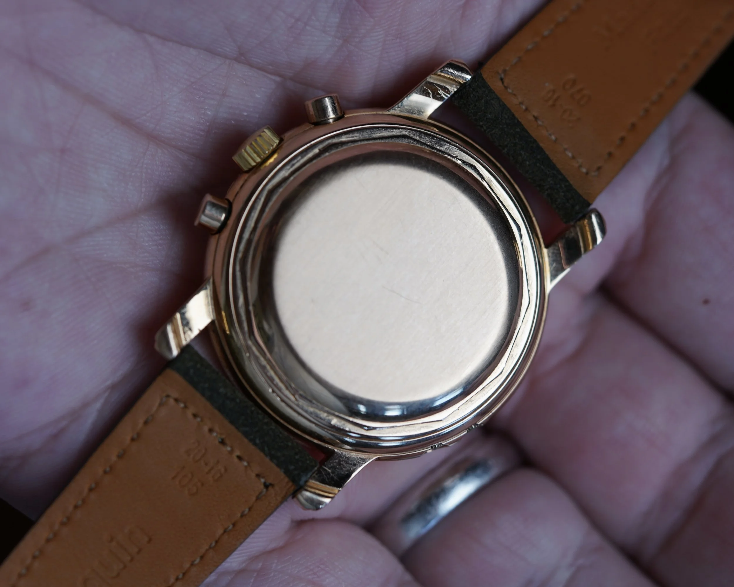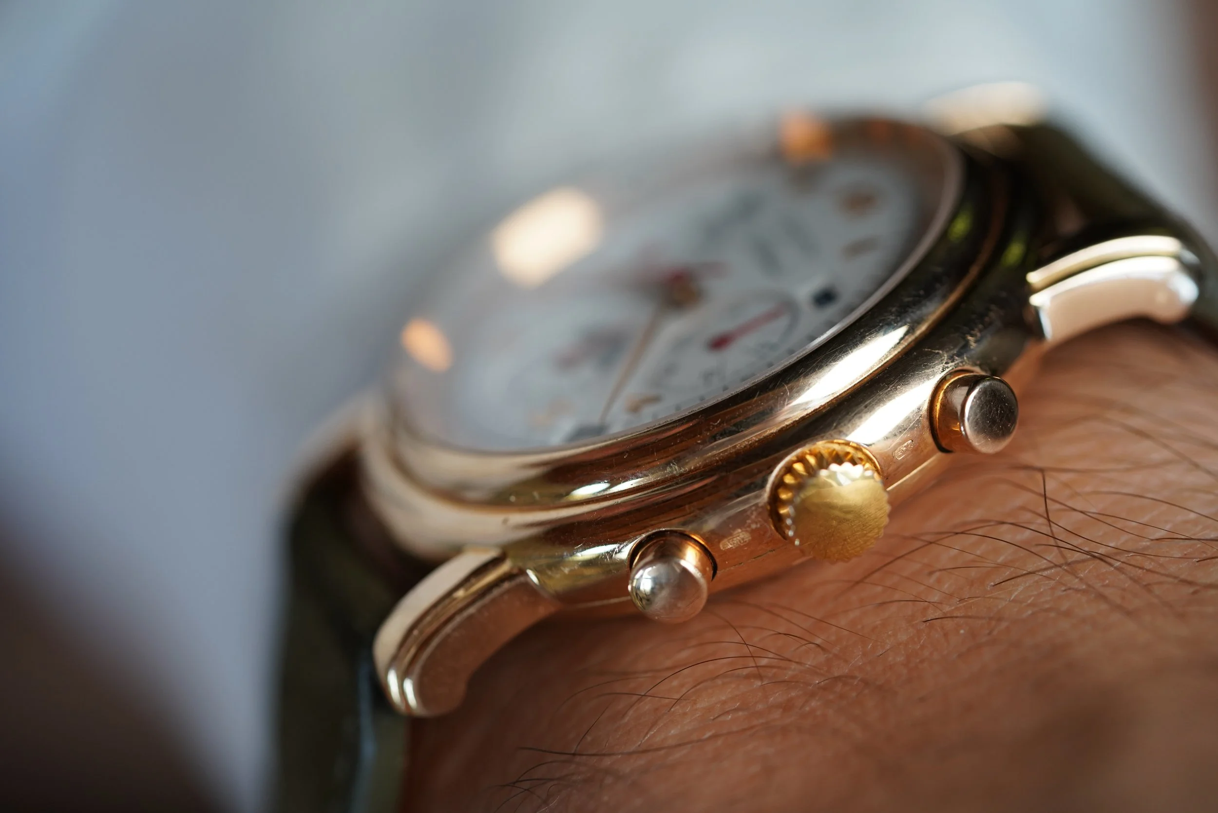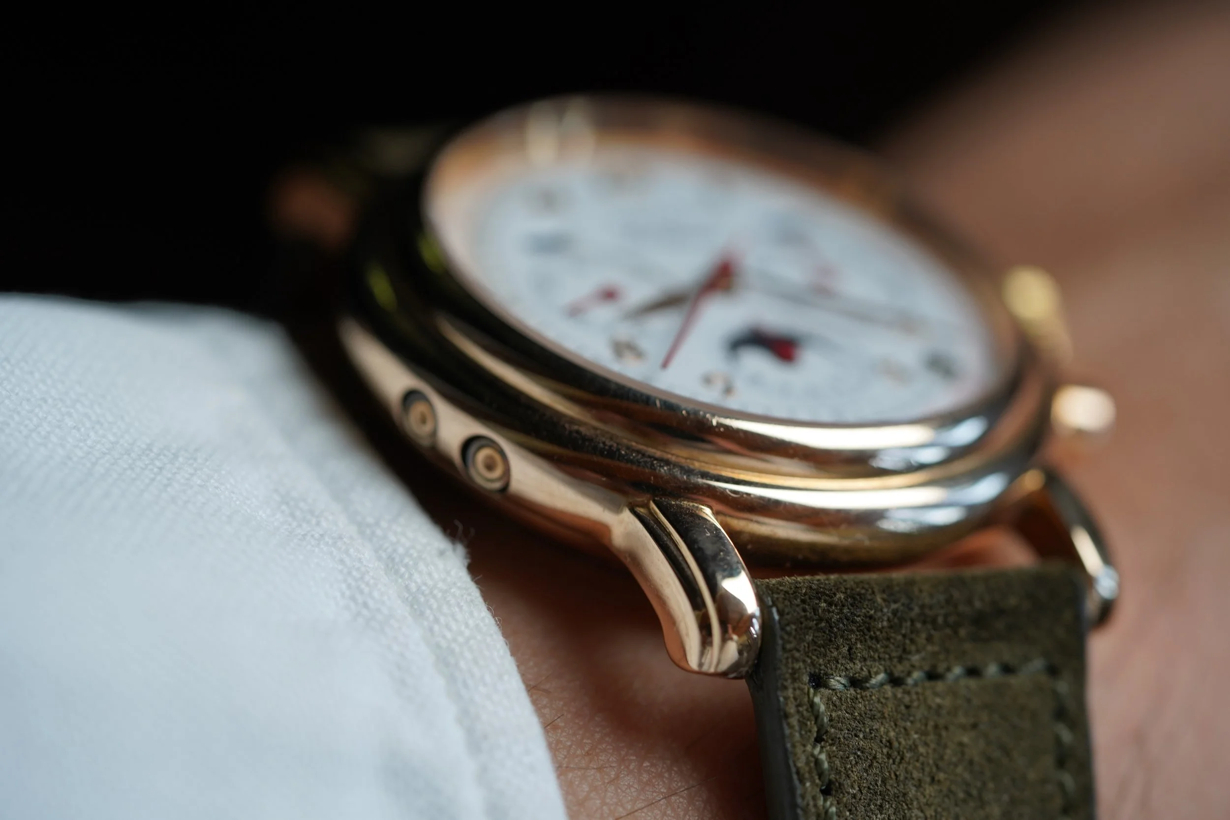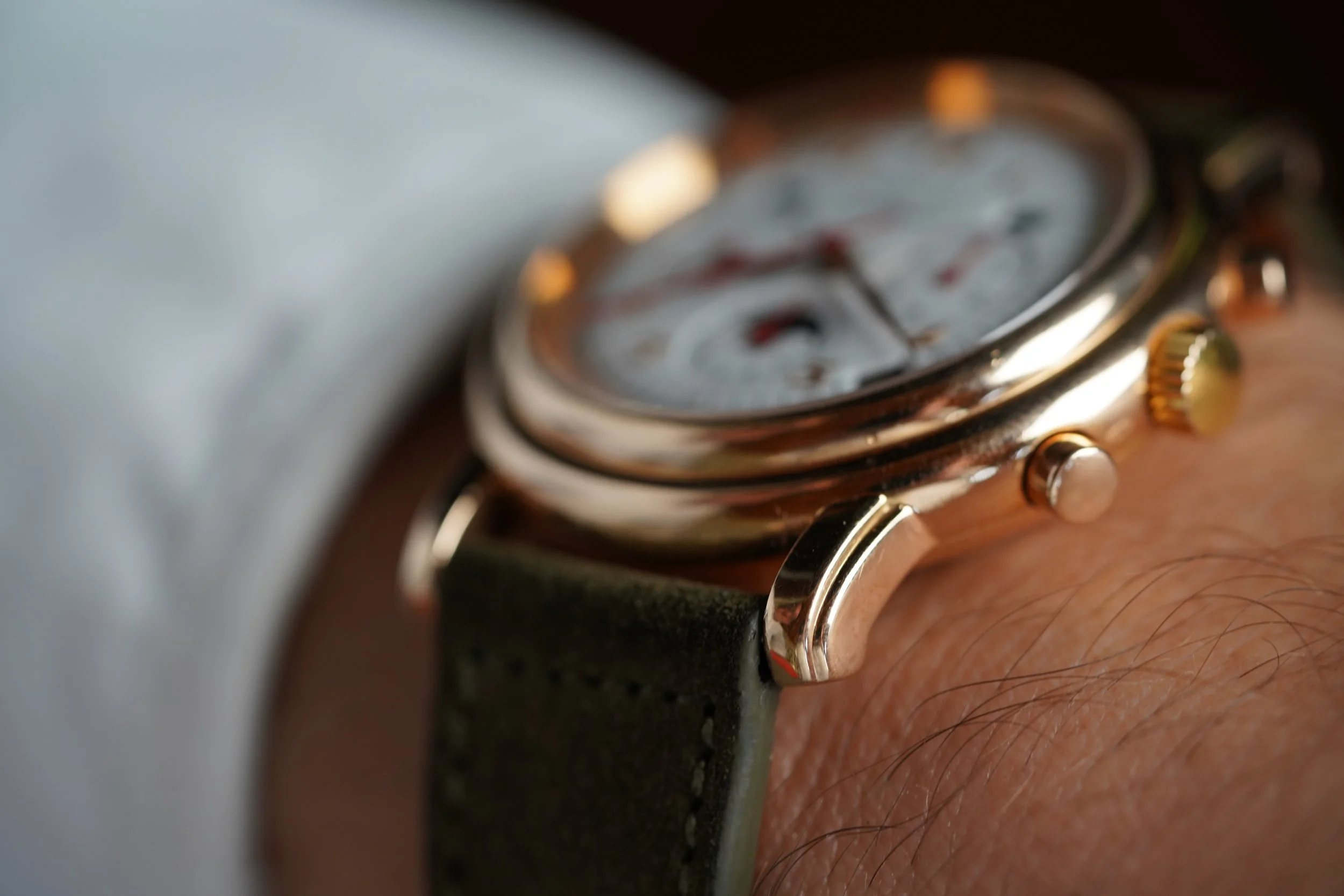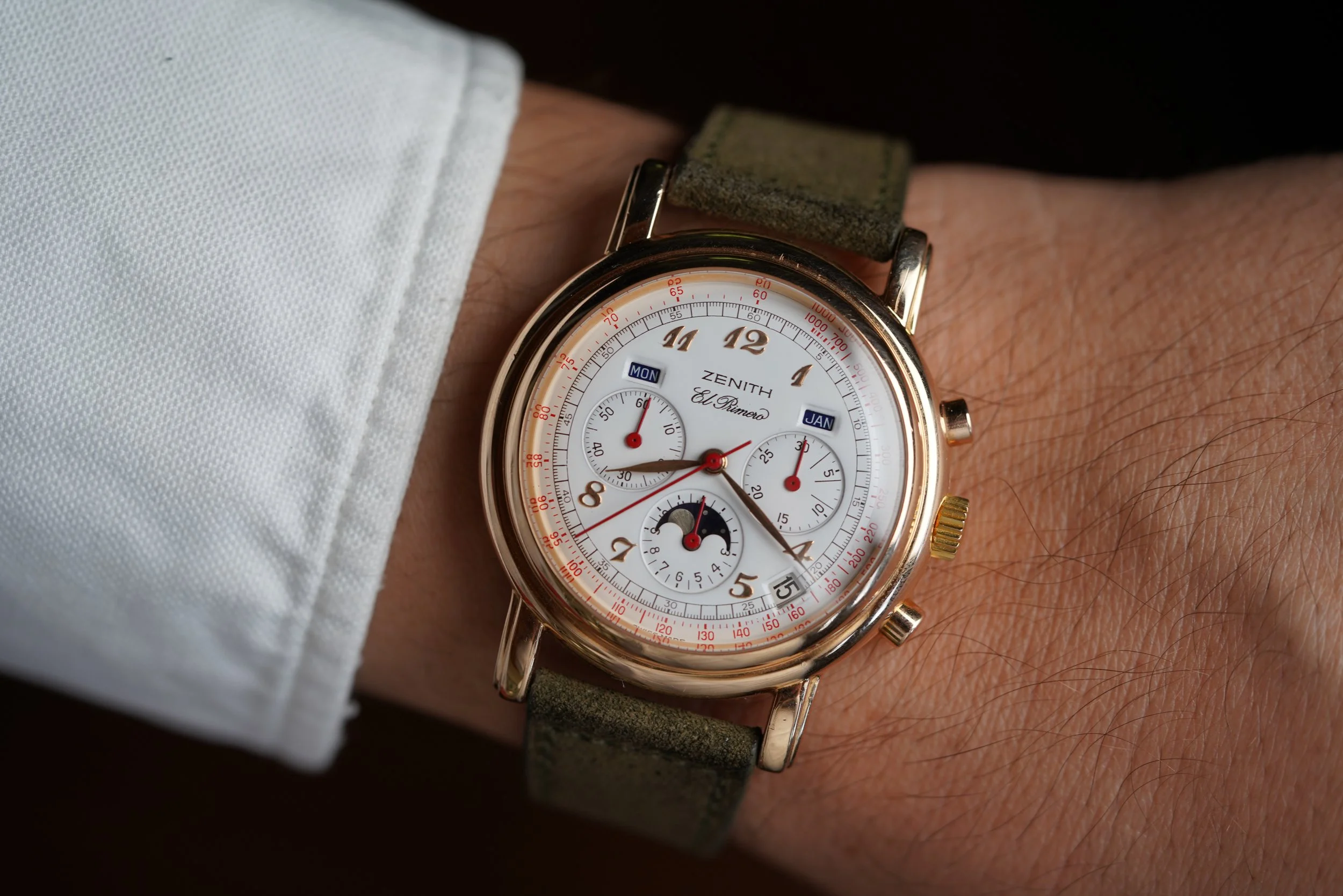 This Zenith El Primero Chronomaster is a fantastic complicated watch! It features a triple calendar which displays the day, date, month and moonphase. In addition it features a chronograph. The 18k rose gold case measures approximately 40mm in diameter and 47mm lug to lug. The watch features a white dial with gold Breguet numerals. There is a red tachymeter scale on the dial to match the color of the sundial and chronograph hands. It is paired with a green suede strap. The case appears to be unpolished.
