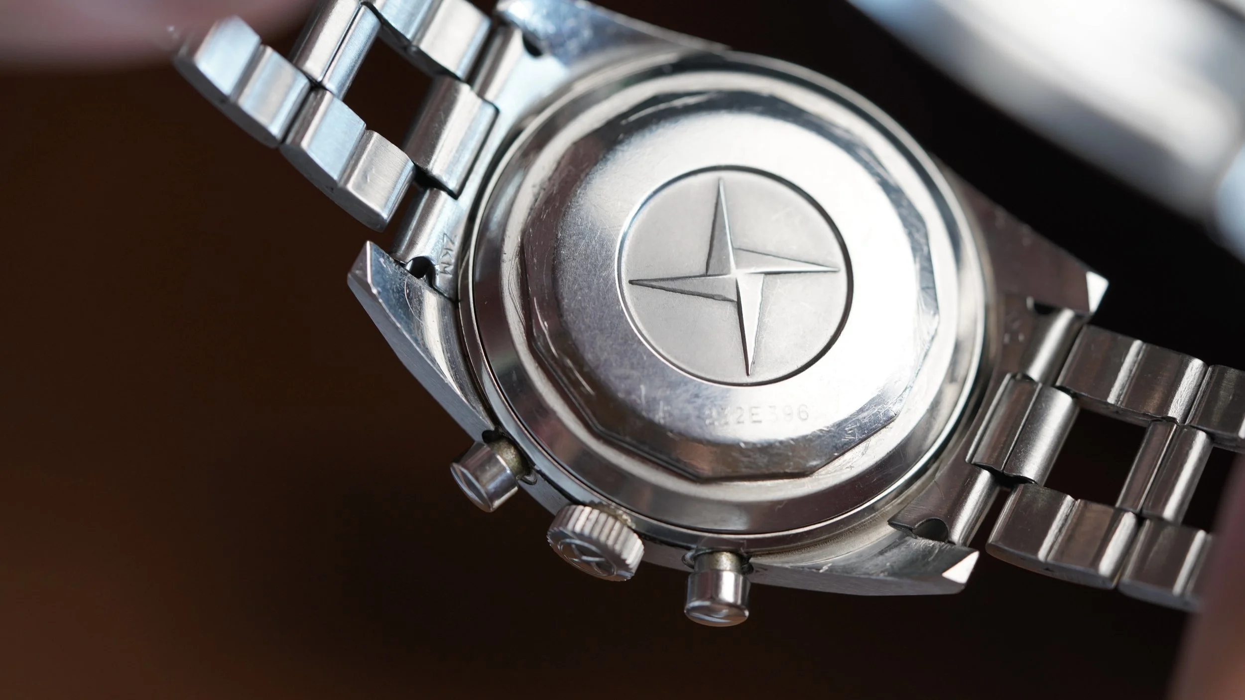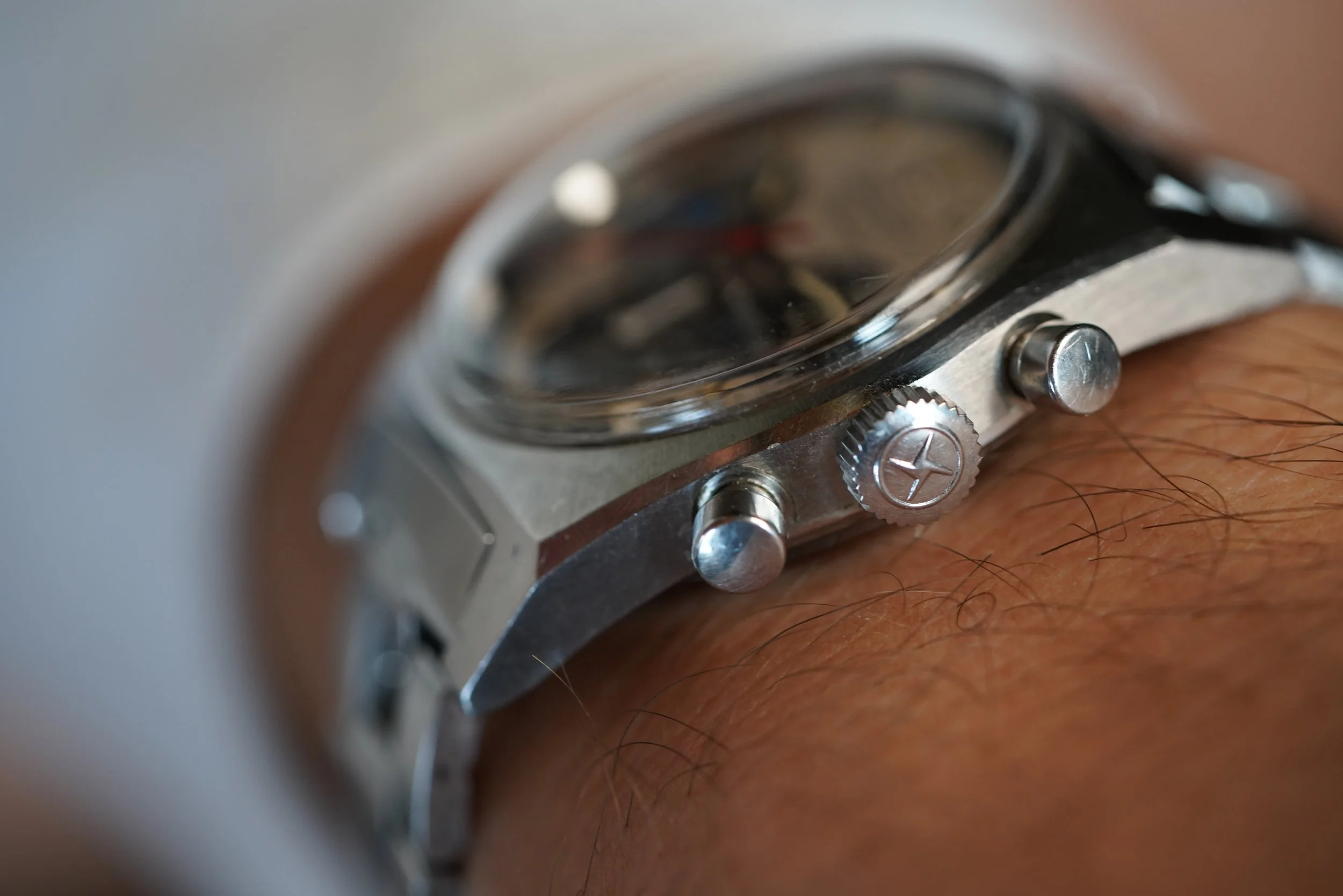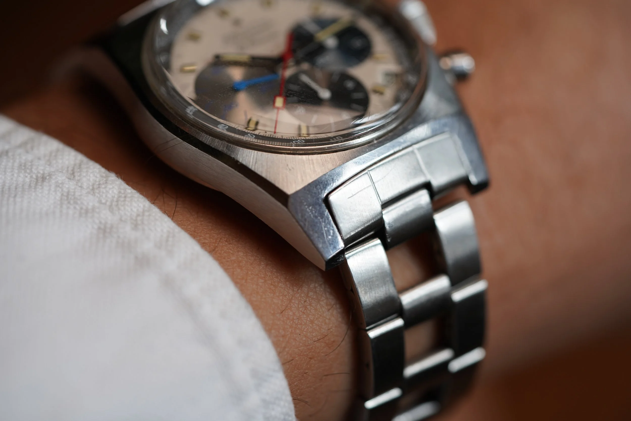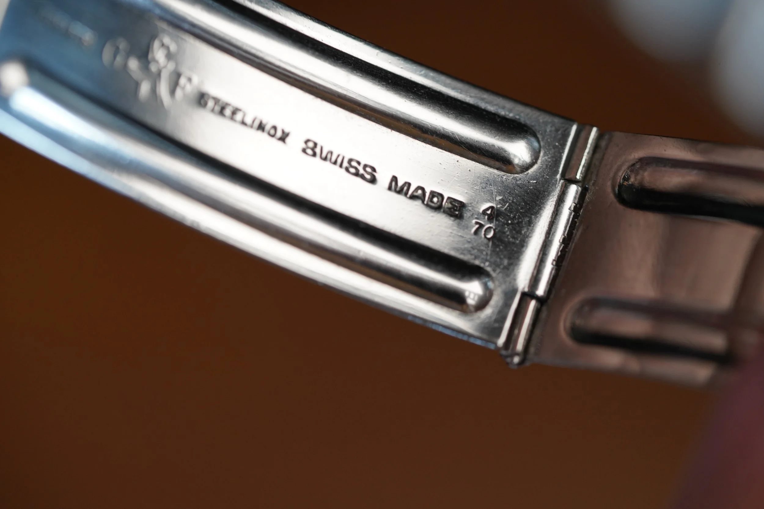 The Zenith El Primero is one of the most iconic chronographs in history, and one of the first chronographs to feature an automatic movement with calendar. This ref. A3817 features overlapping sub dials in different colors, silver, gray, and blue, and attractive tritium luminous hands and indices. It is paired with a Gay Frères steel ladder bracelet dating to 1970.