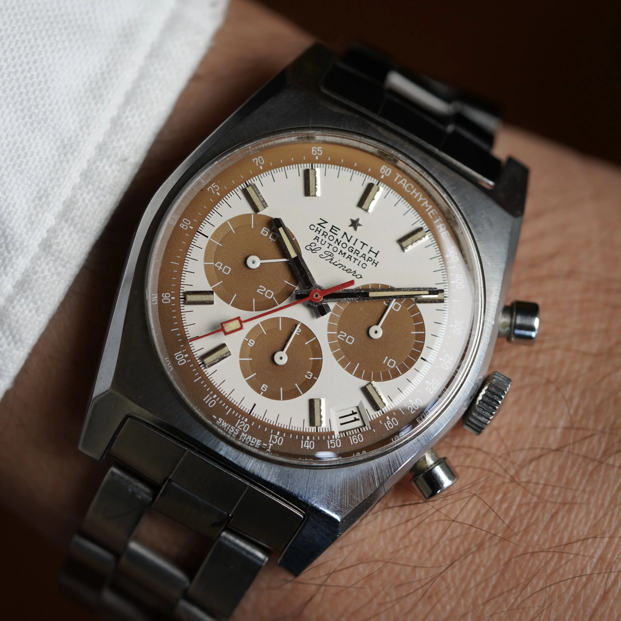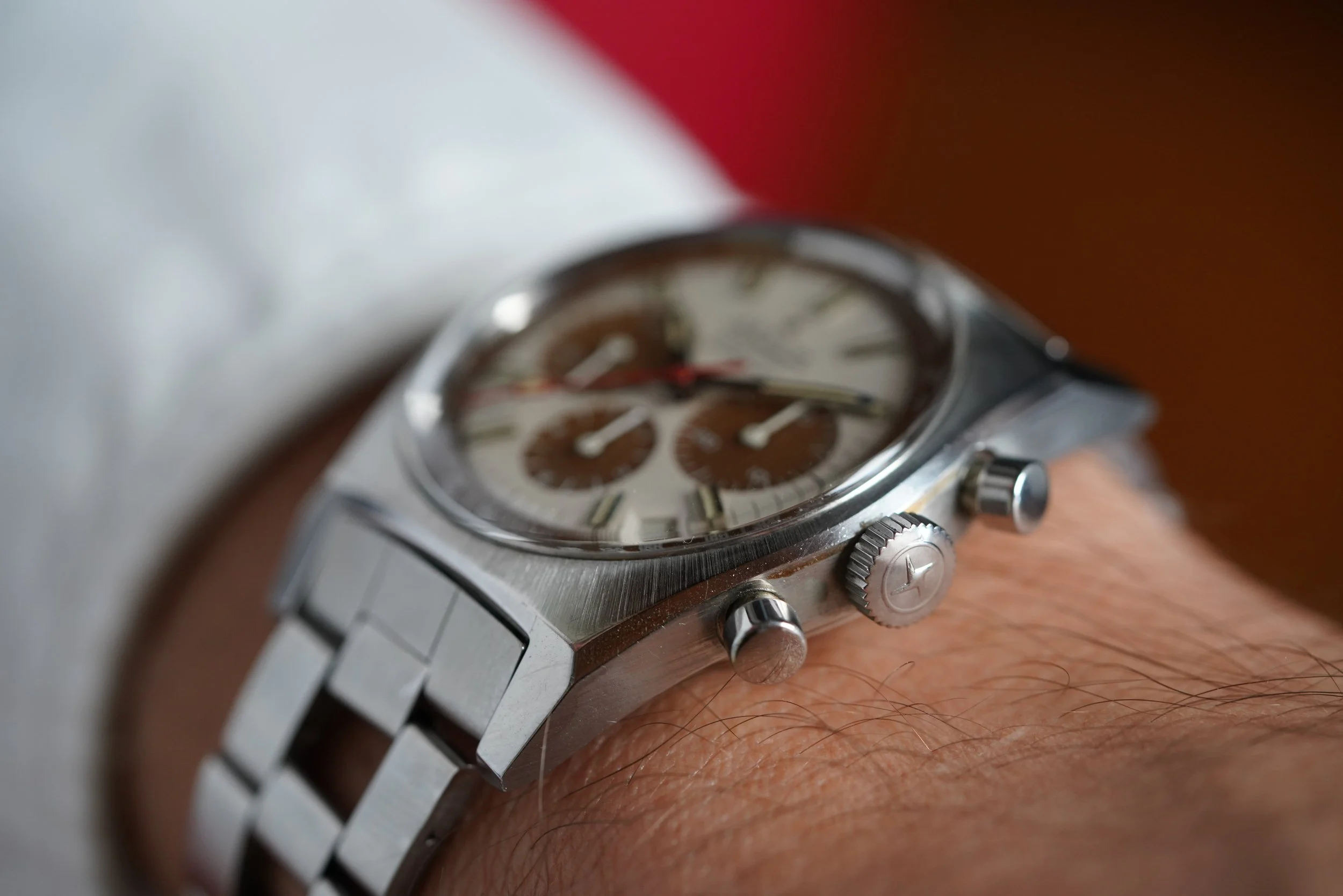 This super cool Zenith El Primero reference A384 features a stunning tropical patina. The watch is approximately 38mm wide with a lug-to-lug length of 45.5mm. This example comes with the Gay Frères steel ladder bracelet with ZKM end links dating to 1972. The lug width is 19mm and the height is 12.5mm including the crystal. The case has been lightly polished.