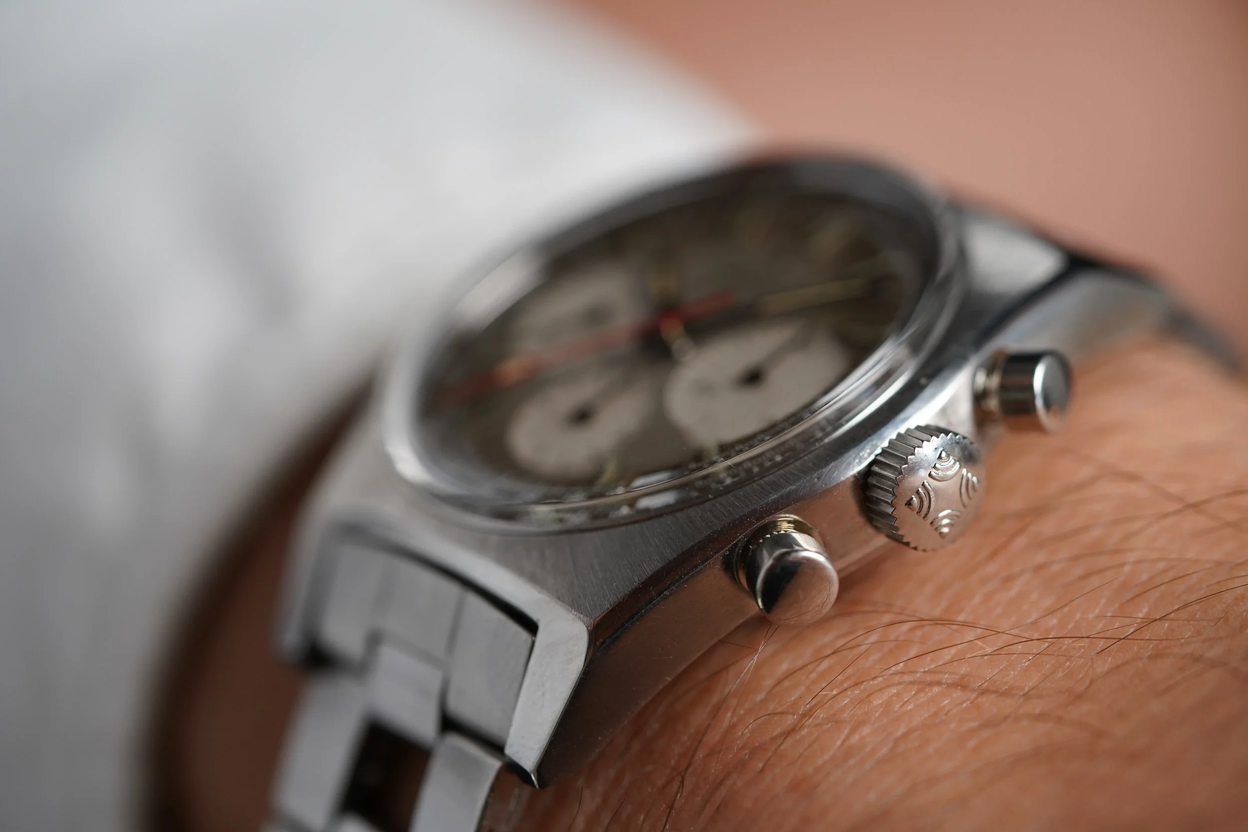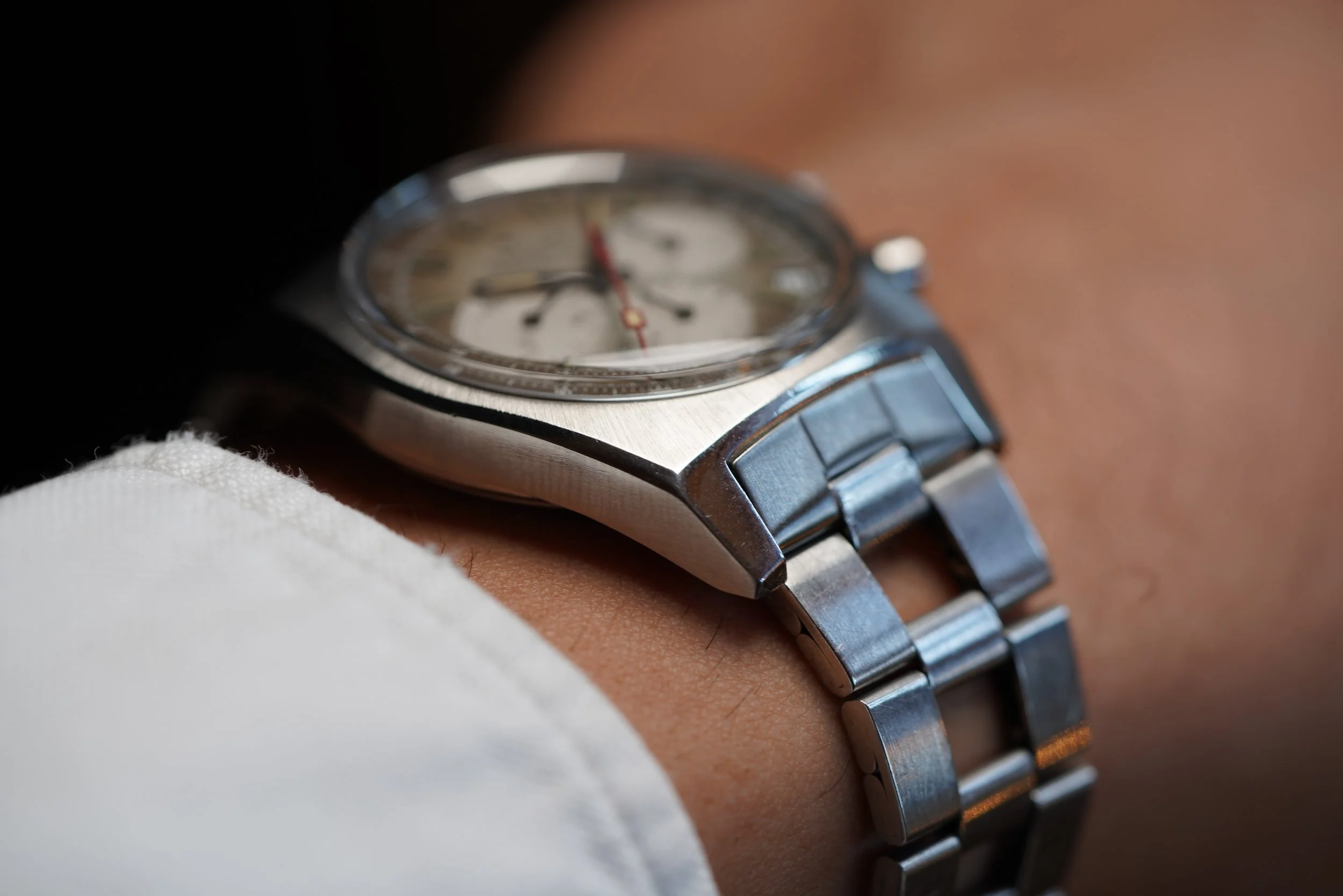 The watch measures approximately 37mm wide (with a lug-to-lug length of 46.5mm). The lug width is 19mm. This particular example comes with the Gay Frères steel ladder bracelet. The case and bracelet have been polished.