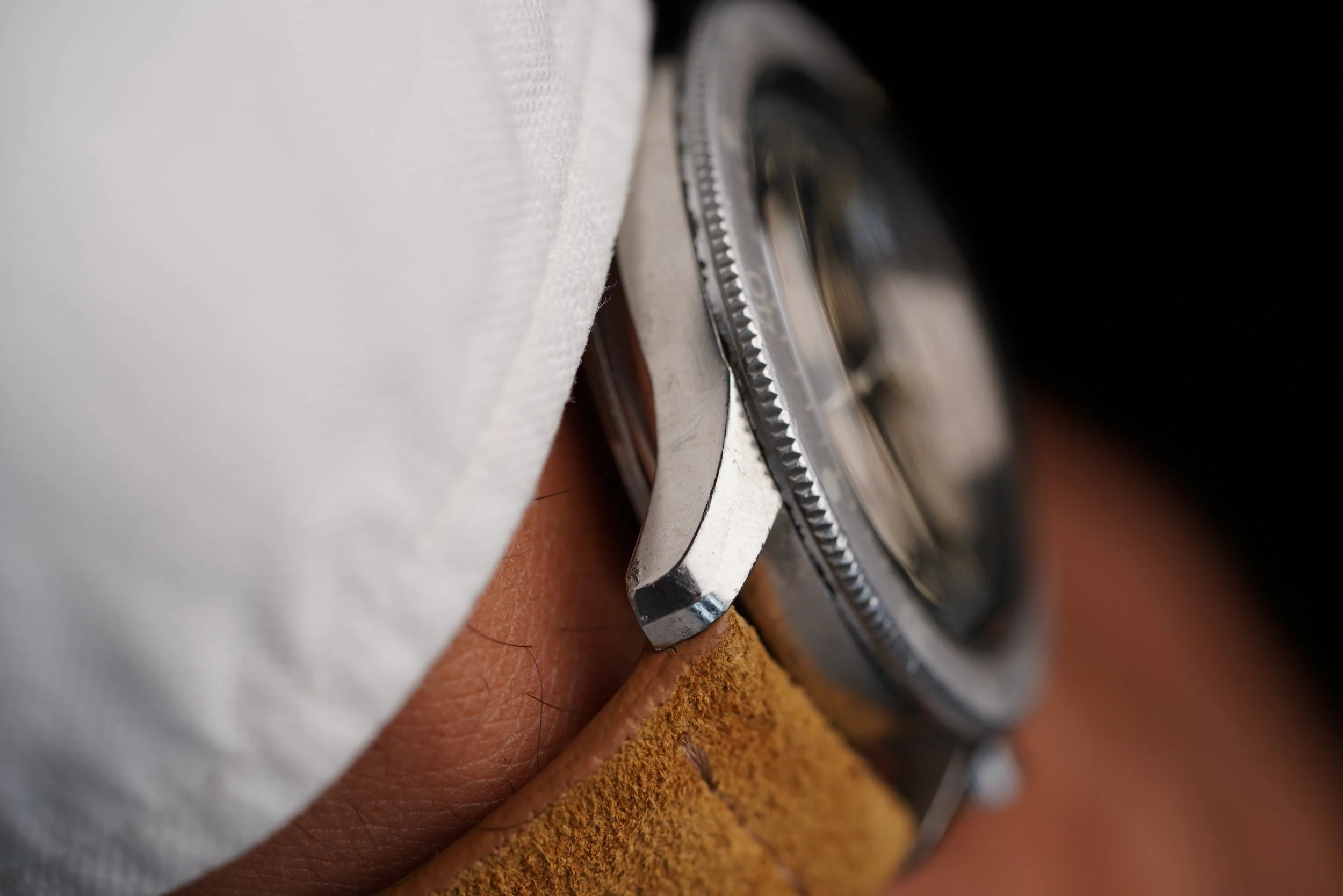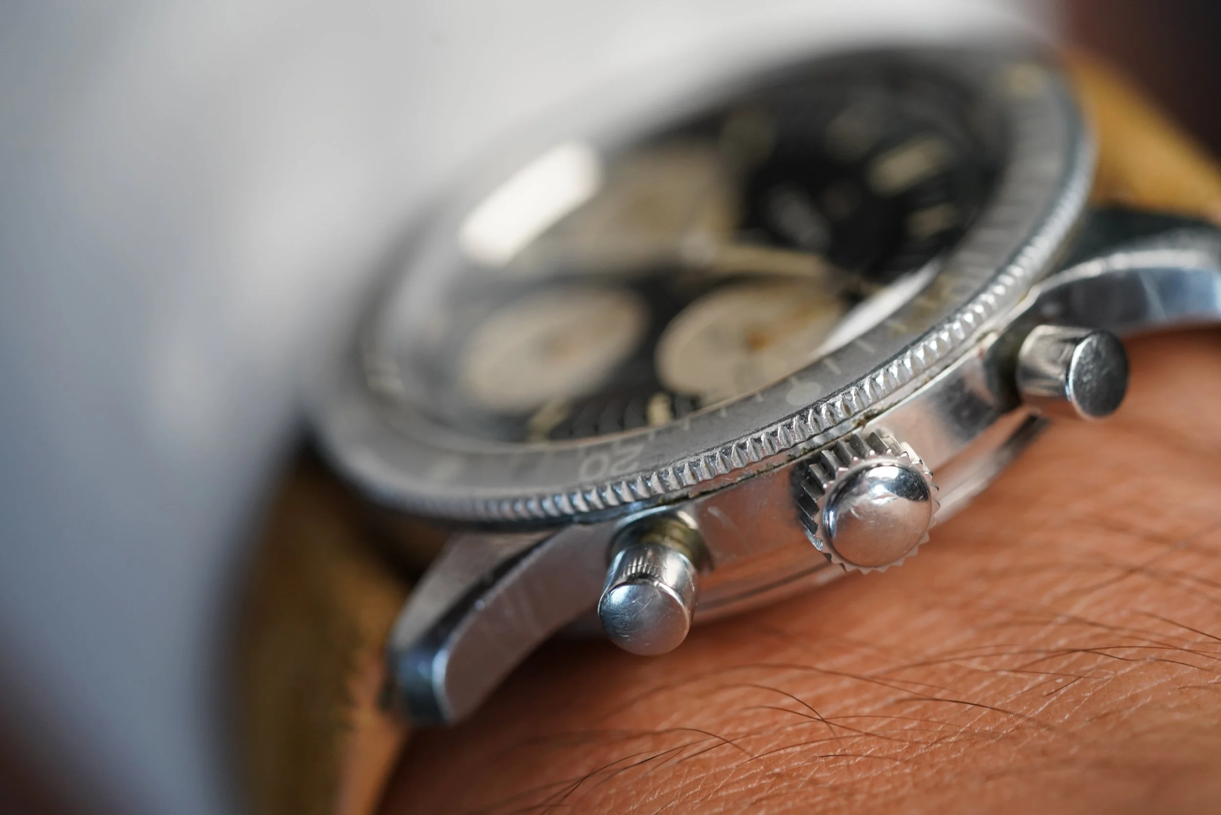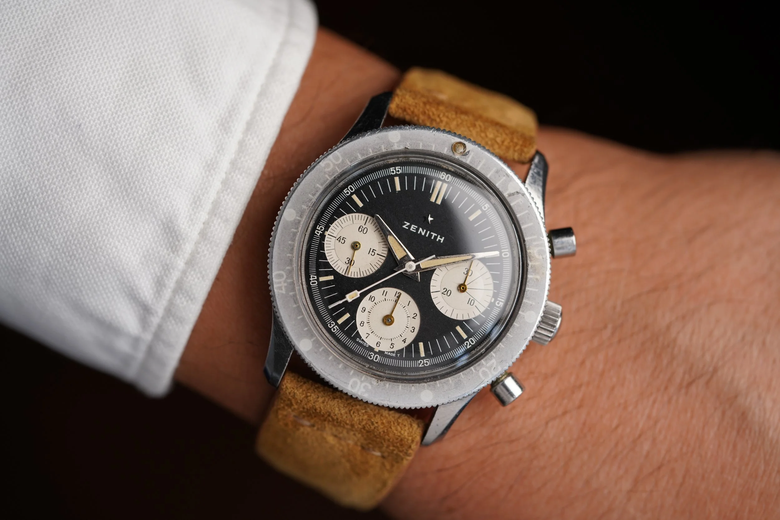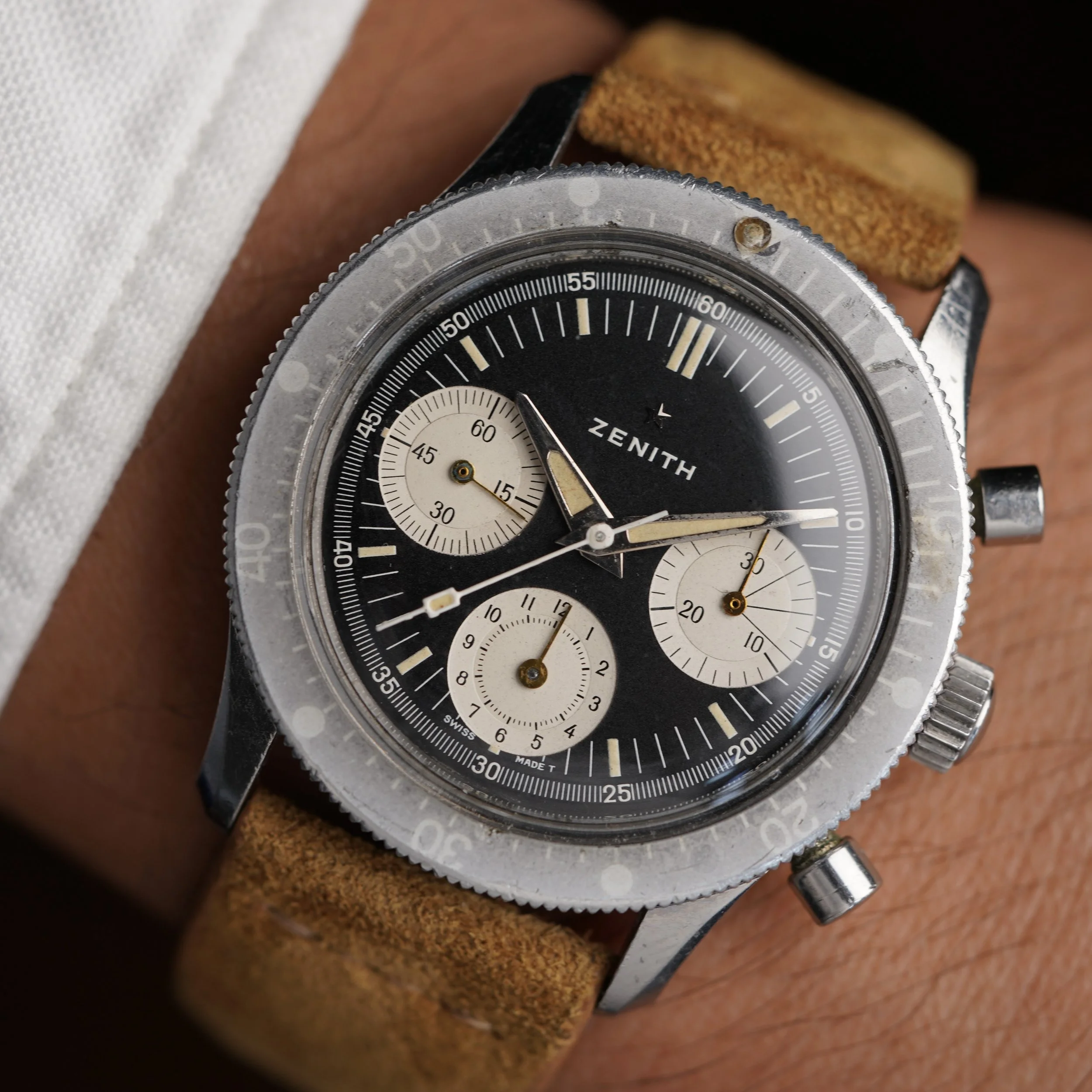 This is a very attractive Zenith Sub Sea. It features a manual-wind chronograph. The stark contrast of the subsidiary dials allows for easy legibility. The dauphine hands and hour indices feature original tritium luminous material. The bezel has turned from its original black color to a highly attractive grayish blue. The crown appears to be a service replacement. The Zenith Logo is applied at 12 o’clock and is intact. The light makes it look hidden. The hour register hand is slightly off center.