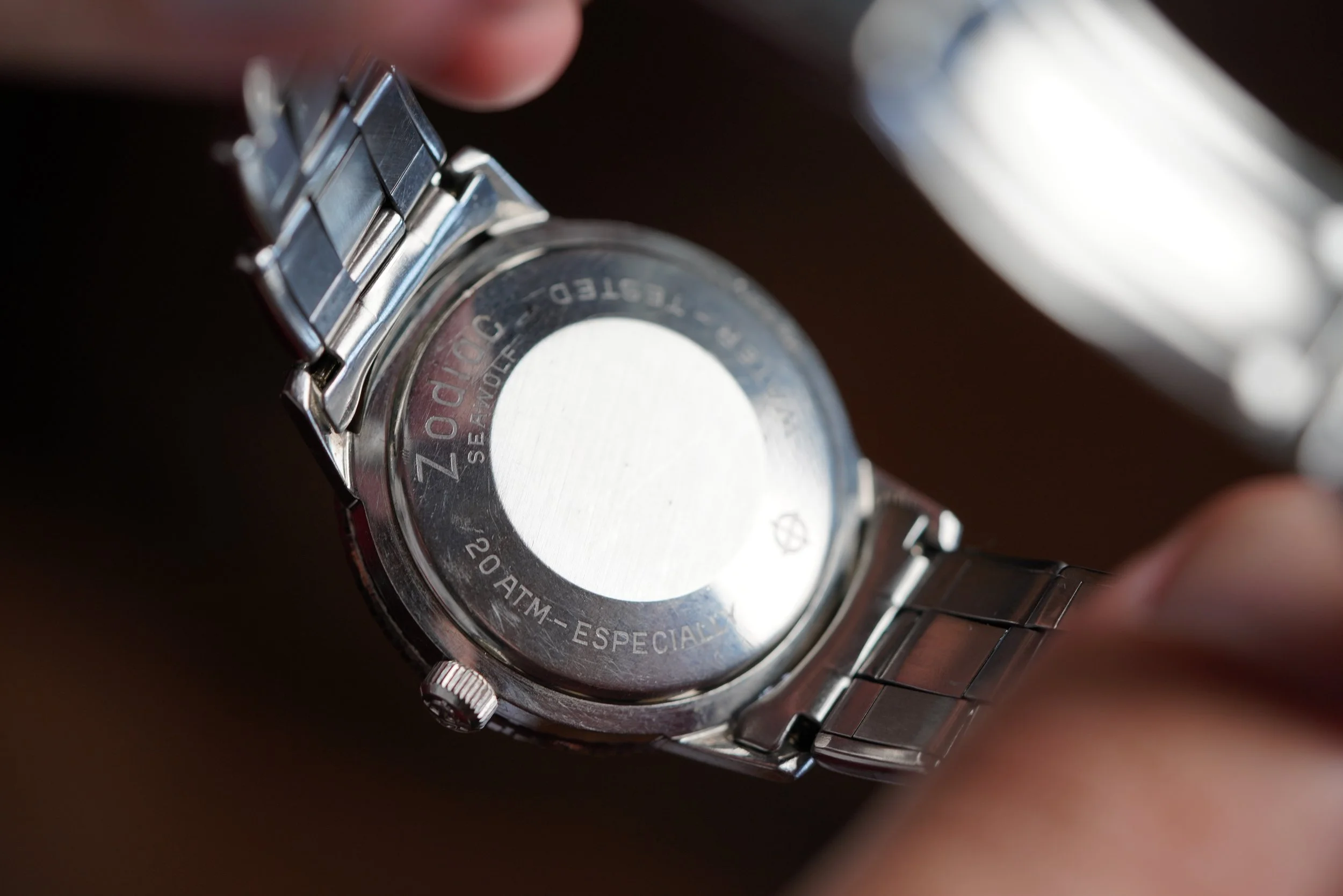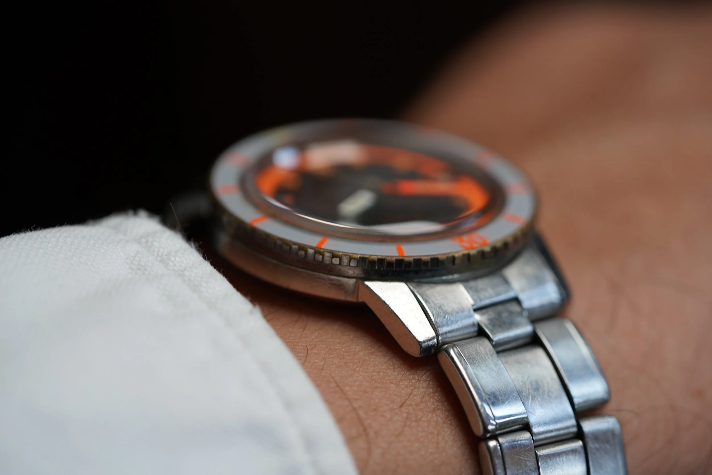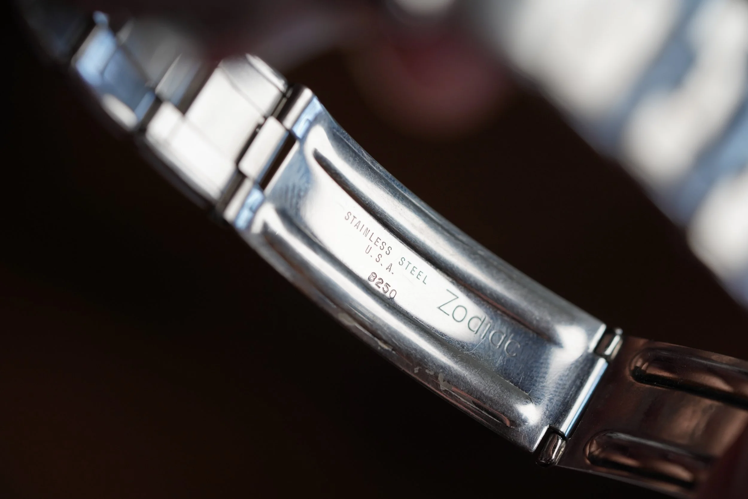 This Zodiac Sea Wolf is an awesome vintage watch with a “orange exotic” gilt dial. The watch features an automatic calibre 72B. The case measures 35mm in diameter (43mm lug-to-lug). It is paired on a Zodiac bracelet likely made by C&I which is very firm.